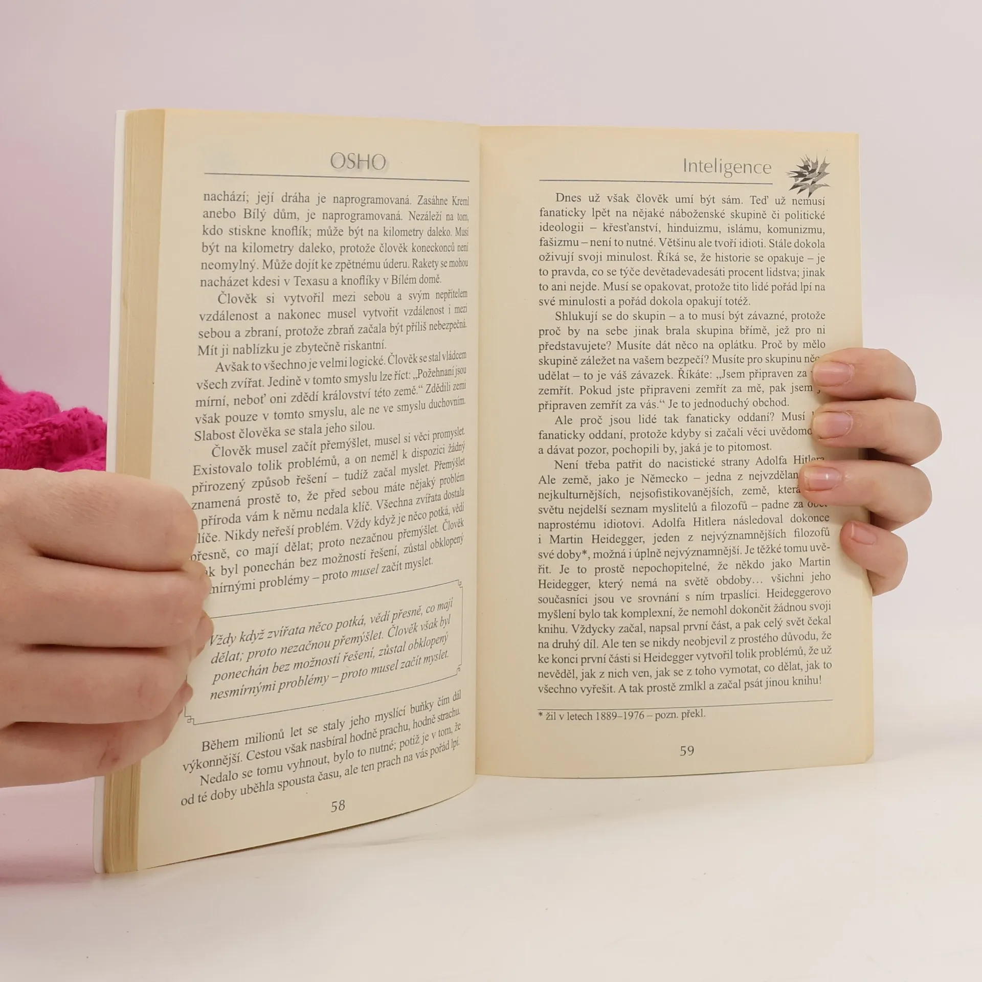 Osho pokračuje v sérii promluv na různá ucelená témata. V knize mluví o tom, co je to opravdová inteligence. Výrazně a varovně ji odlišuje od intelektuality, a tedy od naučeného, netvořivého způsobu myšlení. Věnuje se i širšímu pojmu mysli, proti níž staví takzvanou ne-mysl - stav, kterého člověk dosahuje při meditaci. Inteligence je v jeho podání výzvou, jak bděle, svěže a svobodně reagovat na požadavky okamžiku co nejvhodnějším způsobem - takovým, jenž podporuje skutečný život.