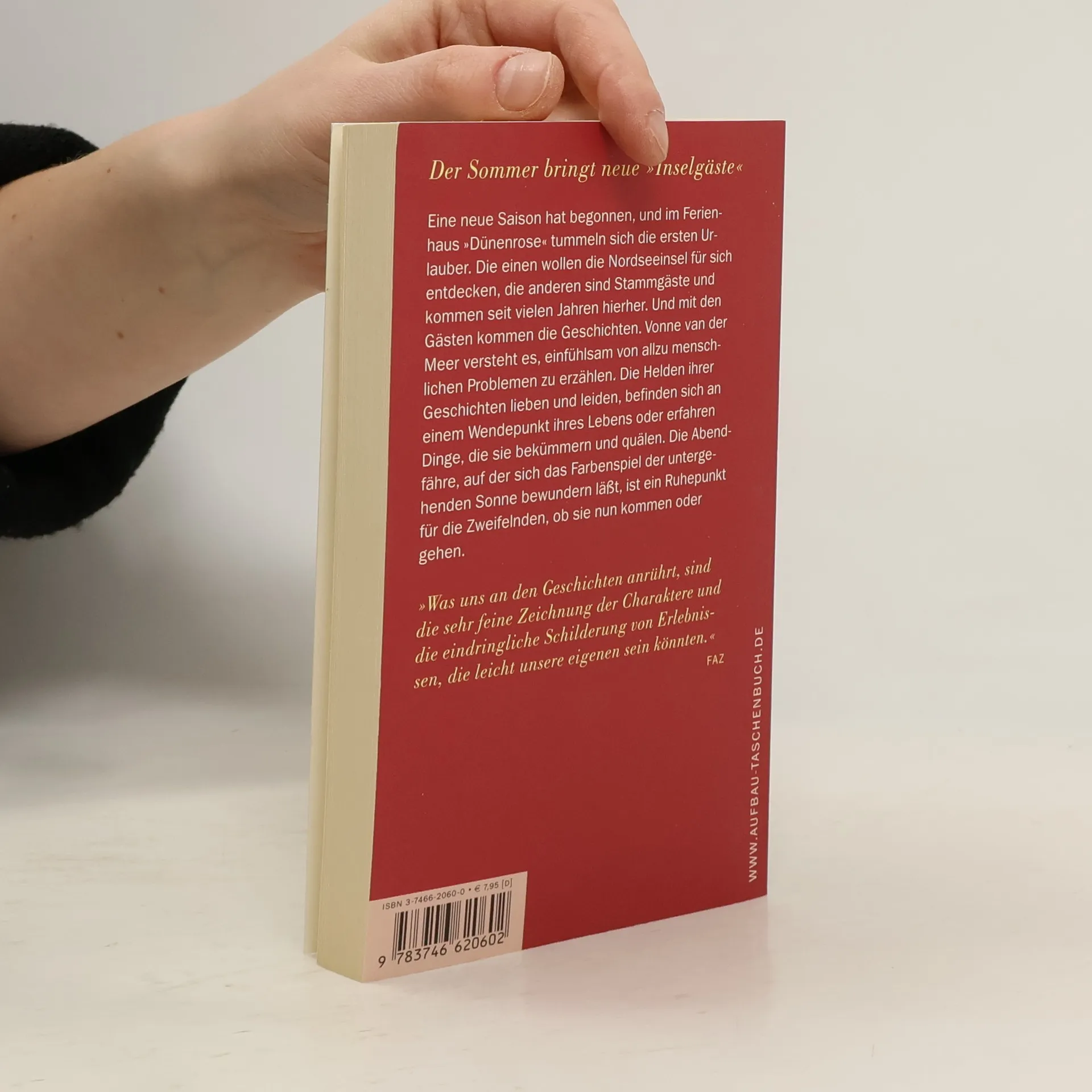 Im Ferienhaus „Dünenrose“ haben bereits viele unterschiedliche Menschen ihren Urlaub verbracht, was die Putzfrau gelassen bleiben lässt, da sie die Marotten der Gäste kennt. Doch als die Frau in der roten Strickjacke zurückkehrt, sorgt dies für Aufregung. In den folgenden Wochen bleibt es turbulent: Eine alleinerziehende Mutter wird von den erotischen Verwirrungen ihres ältesten Sohnes mitgerissen, während ihr jüngster Sohn heimlich in der blauen Kammer aktiv ist. Auch Martine, bekannt aus den „Inselgästen“, kehrt zurück und erwartet ihren neuen Geliebten, nur um von ihrer Mutter ein lange gehütetes Geheimnis zu erfahren. Eine neue Saison hat begonnen, und die ersten Urlauber strömen ins Ferienhaus. Einige möchten die Nordseeinsel entdecken, während andere Stammgäste sind. Mit den Gästen kommen zahlreiche Geschichten. Vonne van der Meer erzählt einfühlsam von menschlichen Problemen, von Helden, die lieben und leiden, an Wendepunkten ihres Lebens stehen oder mit belastenden Wahrheiten konfrontiert werden. Die Abendfähre, die den Sonnenuntergang bietet, wird zum Ruhepunkt für all jene, die sich unsicher sind, ob sie bleiben oder gehen sollen. Die feine Charakterzeichnung und die eindringlichen Erlebnisse machen die Geschichten besonders berührend.