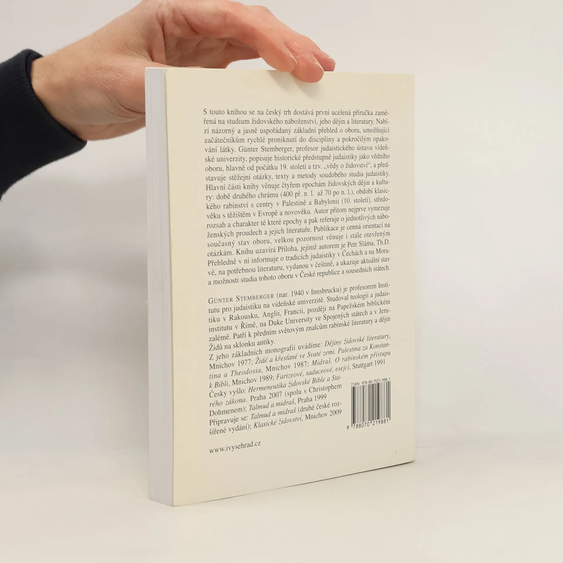 Ucelená propedeutická příručka zaměřená na studium židovského náboženství, jeho dějin a literatury. Nabízí názorný a jasně uspořádaný základní přehled o oboru, umožňující začátečníkům rychlé proniknutí do disciplíny a pokročilým opakování látky. G. Stemberger, profesor judaistického ústavu vídeňské univerzity, popisuje historické předstupně judaistiky jako vědního oboru, hlavně od počátku 19. století a tzv. „vědy o židovství“, a představuje stěžejní otázky, texty a metody soudobého studia judaistiky. Hlavní části knihy věnuje čtyřem epochám židovských dějin a kultury: době druhého Chrámu (400 př. n. l. – 70 po n. l.), období klasického rabínství s centry v Palestině a Babylonii (do 10. století), středověku s těžištěm v Evropě a novověku. Autor přitom nejprve vymezuje rozsah a charakter epochy a pak referuje o jednotlivých náboženských proudech a jejich literatuře. Publikace je cenná orientací na současný stav oboru: velkou pozornost věnuje stále otevřeným otázkám, nabízí přehledy důležitých adres (možnosti studia, instituce, knihovny), odkazy pro internetové rešerše, glosář, rejstřík a seznam nejdůležitější nové literatury k jednotlivým oddílům, od níž je možné proniknout ke staršímu bádání a k edicím a překladům textů. České vydání není pouhým překladem, ale navíc ukazuje aktuální stav a možnosti studia oboru v České republice.
