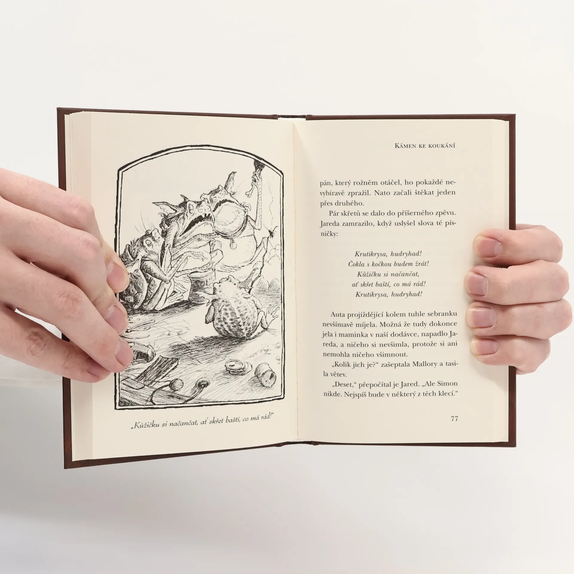 Boj sourozenců Graceových, kteří se nedávno přestěhovali do starého viktoriánského domu, se skřítky, skřety a nejrůznějšími strašidly pokračuje. Kouzelné bytosti, které zchátralý dům a jeho okolí obývají, jsou stále drzejší a troufalejší. Dokonce unesou jedno z dvojčat, Simona. Jared a Mallory se za pomoci hodného skřítka Náprstníčka vypraví na záchrannou výpravu. Podaří se jim bratra zachránit? Najdou zvláštní brýle s kouzelným kamenem, s nimiž lze spatřit neviditelné bytosti? Pokračování napínavého příběhu pro čtenáře od devíti let je plný napětí, tajemných kouzel i humoru. Pro děti od 8 let.