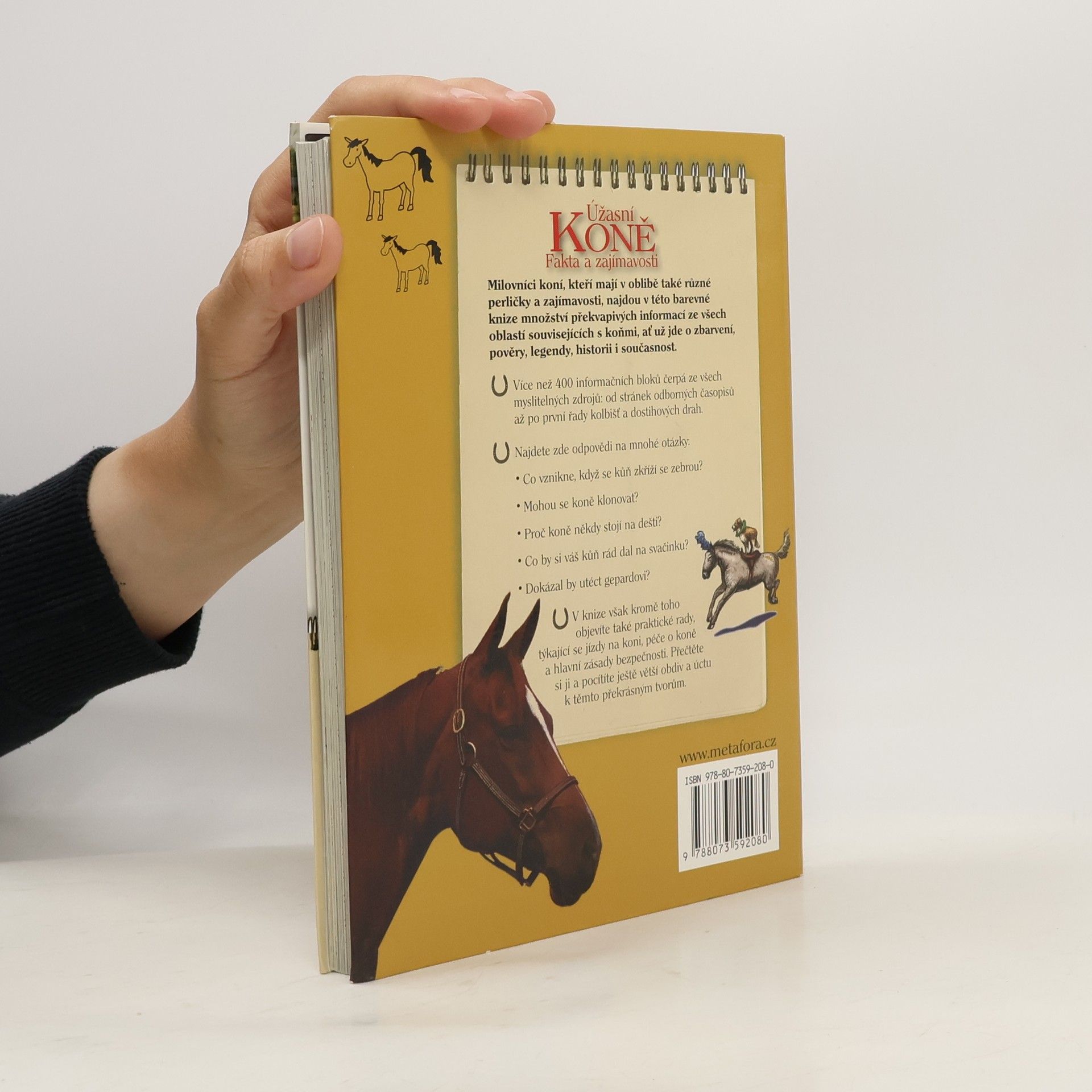 Úžasní koně - Fakta a zajímavosti Ilustrovaný průvodce obdivuhodným světem koní… Milovníci koní, kteří mají v oblibě také různé perličky a zajímavosti, najdou v této barevné knize množství překvapivých informací ze všech oblastí souvisejících s koňmi, ať už jde o zbarvení, pověry, legendy, historii i současnost. Více než 400 informačních bloků čerpá ze všech myslitelných zdrojů: od stránek odborných časopisů až po první řady kolbišť a dostihových drah. Najdete zde odpovědi na mnohé neobvyklé otázky, ale také praktické rady, týkající se jízdy na koni, péče o koně a hlavní zásady bezpečnosti.