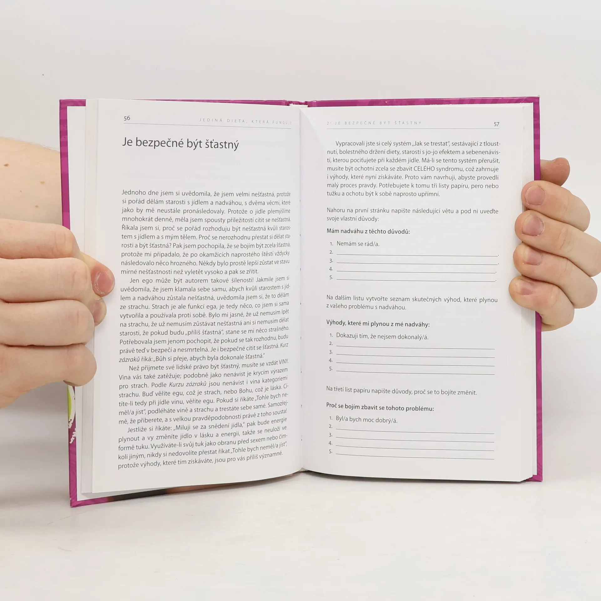 Nadváha je pouze vnějším projevem strachu, který chováte uvnitř. Když začnete měnit své myšlení, zasazujete semínko toho, co se stane skutečností. Způsobem, jakým se dnes rozhodnete myslet, vytvoříte zítra novou postavu. Jedna z nejlepších knih na téma odstraňování nadbytečné váhy je Jediná dieta, která funguje od Sondry Ray. Je o zdržení se negativního myšlení. Ukazuje krok za krokem, jak na to."
