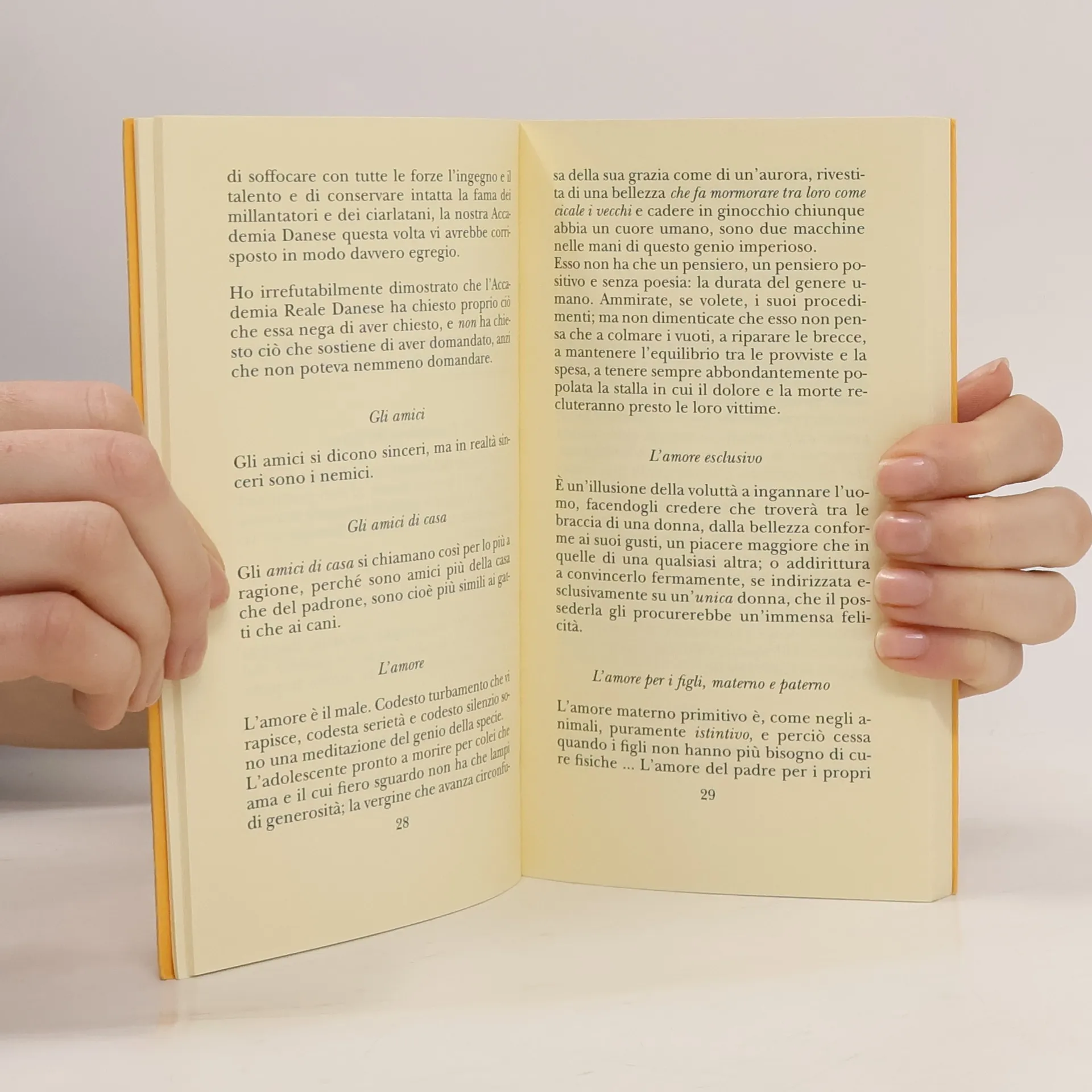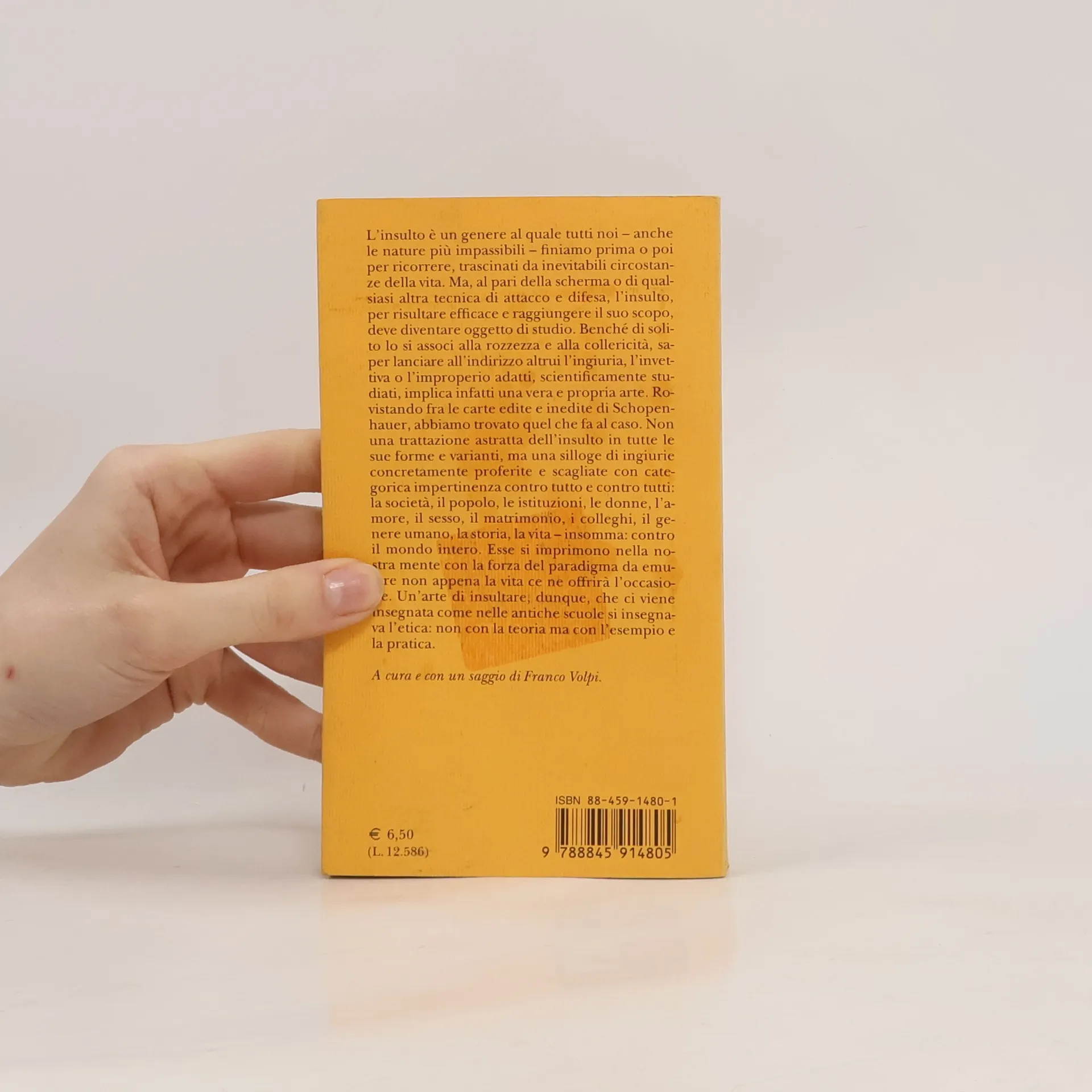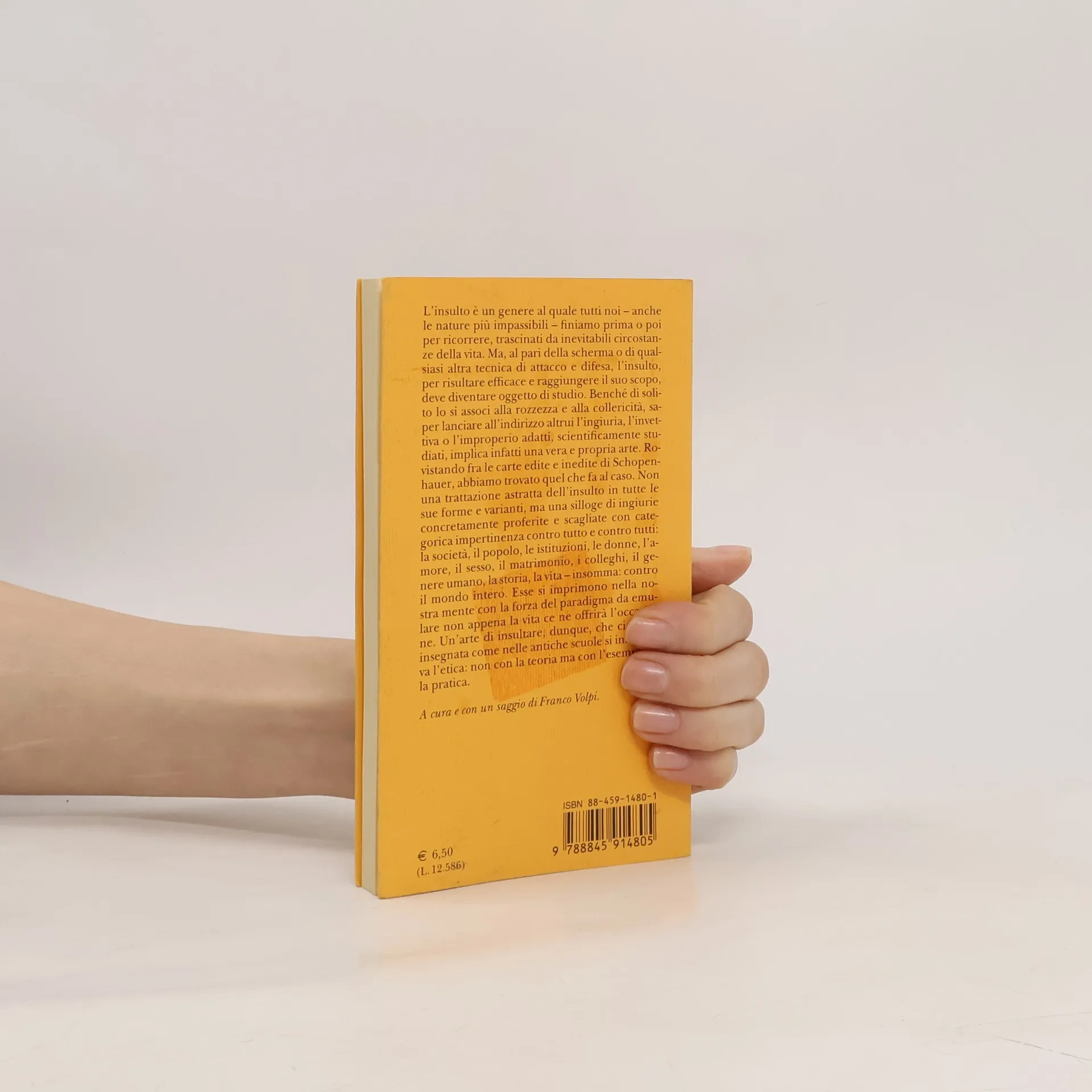 L’insulto è un genere al quale tutti noi – anche le nature più impassibili – finiamo prima o poi per ricorrere, trascinati da inevitabili circostanze della vita. Ma, al pari della scherma o di qualsiasi altra tecnica di attacco e difesa, l’insulto, per risultare efficace e raggiungere il suo scopo, deve diventare oggetto di studio. Benché di solito lo si associ alla rozzezza e alla collericità, saper lanciare all’indirizzo altrui l’ingiuria, l’invettiva o l’improperio adatti, scientificamente studiati, implica infatti una vera e propria arte. Rovistando fra le carte edite e inedite di Schopenhauer, abbiamo trovato quel che fa al caso. Non una trattazione astratta dell’insulto in tutte le sue forme e varianti, ma una silloge di ingiurie concretamente proferite e scagliate con categorica impertinenza contro tutto e contro tutti: la società, il popolo, le istituzioni, le donne, l’amore, il sesso, il matrimonio, i colleghi, il genere umano, la storia, la vita – insomma: contro il mondo intero. Esse si imprimono nella nostra mente con la forza del paradigma da emulare non appena la vita ce ne offrirà l’occasione. Un’arte di insultare, dunque, che ci viene insegnata come nelle antiche scuole si insegnava l’etica: non con la teoria ma con l’esempio e la pratica.