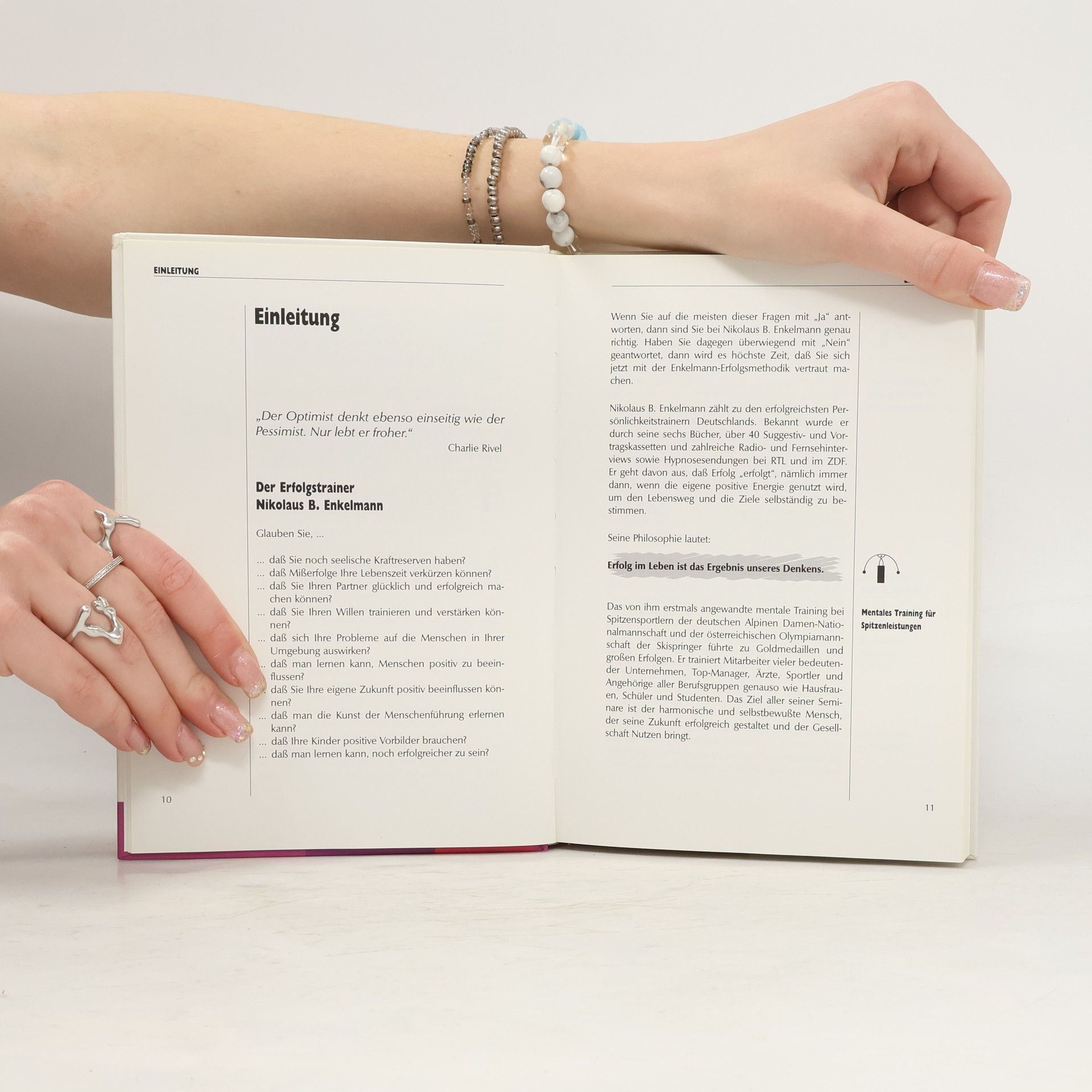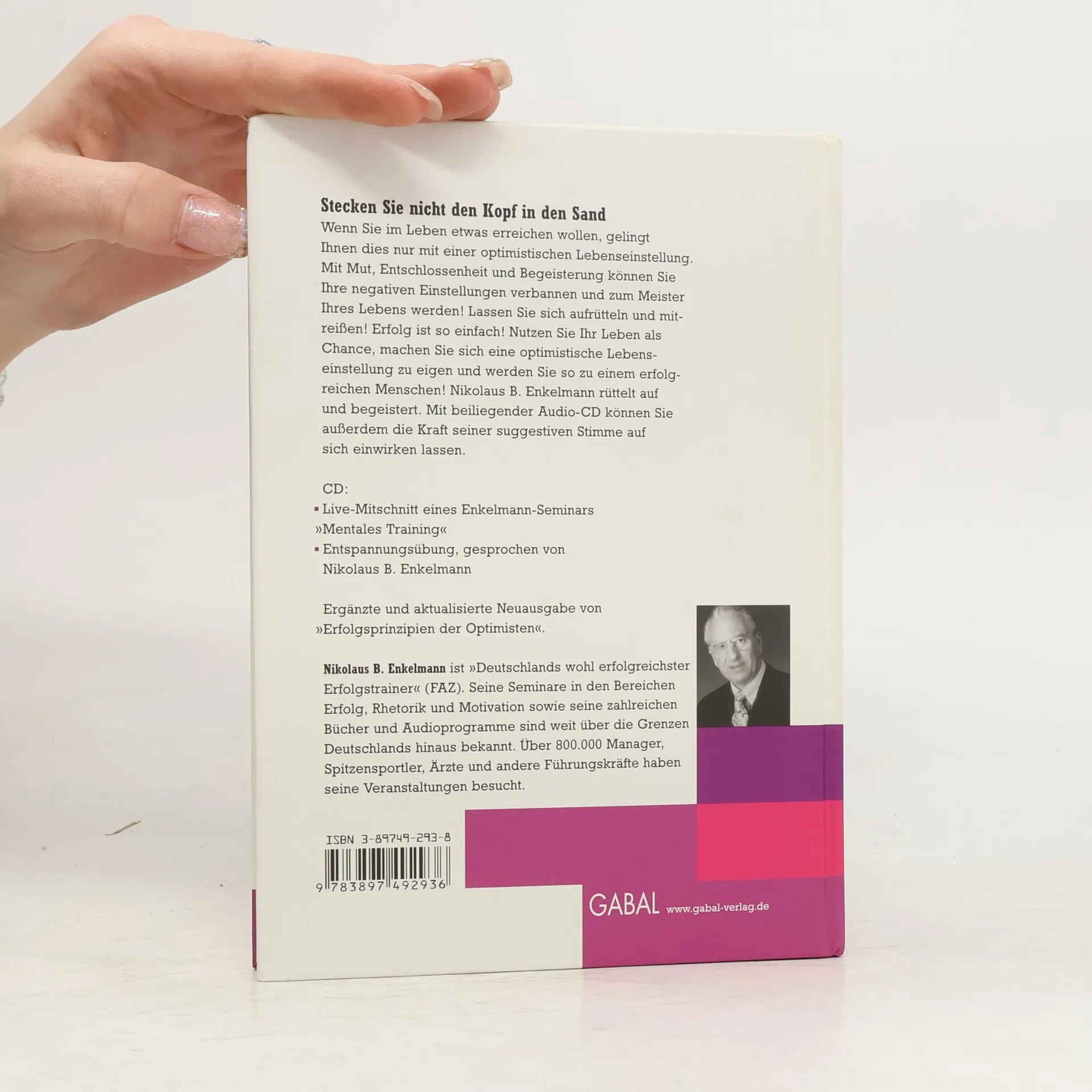 Abgesehen von einigen Massnahmen zur Steigerung der visuellen Attraktivität des Textes und der Einbindung der Ereignisse um den 11. September 2001 in den Kontext seines Optimismus-Konzeptes folgt dieses Medienpaket von "Deutschlands wohl erfolgreichstem Erfolgsautor" dem Original von 1998, damals unter dem Titel "Erfolgsprinzipien der Optimisten" (ID 14/98). Die Beigabe-CD mit dem 40-minütigen Live-Mitschnitt aus einem Enkelmann-Seminar sowie der 26 Minuten dauernden Entspannungsübung hat überhaupt keine Veränderung erfahren. In 4 Themenblöcken führt der Autor den Leser zum Erfolg: vom "Wunsch" über den "Plan" und den Mut zum "Wagen" bis hin zum "Sieg". Theoretischer Hintergrund ist das Konzept des Positiven Denkens; ausserdem verdankt Enkelmann viel der Logotherapie V.E. Frankls. Das "Arbeitsbuch", in das zum Eintragen und Markieren ausdrücklich aufgefordert wird, ist wohl das erfolgreichste Enkelmann-Produkt. Es "geht" in unseren Bibliotheken gut und sei deshalb gern wieder empfohlen. Die alte Auflage muss nach dem Gesagten zumindest aus inhaltlichen Gründen nicht ersetzt werden. (2)