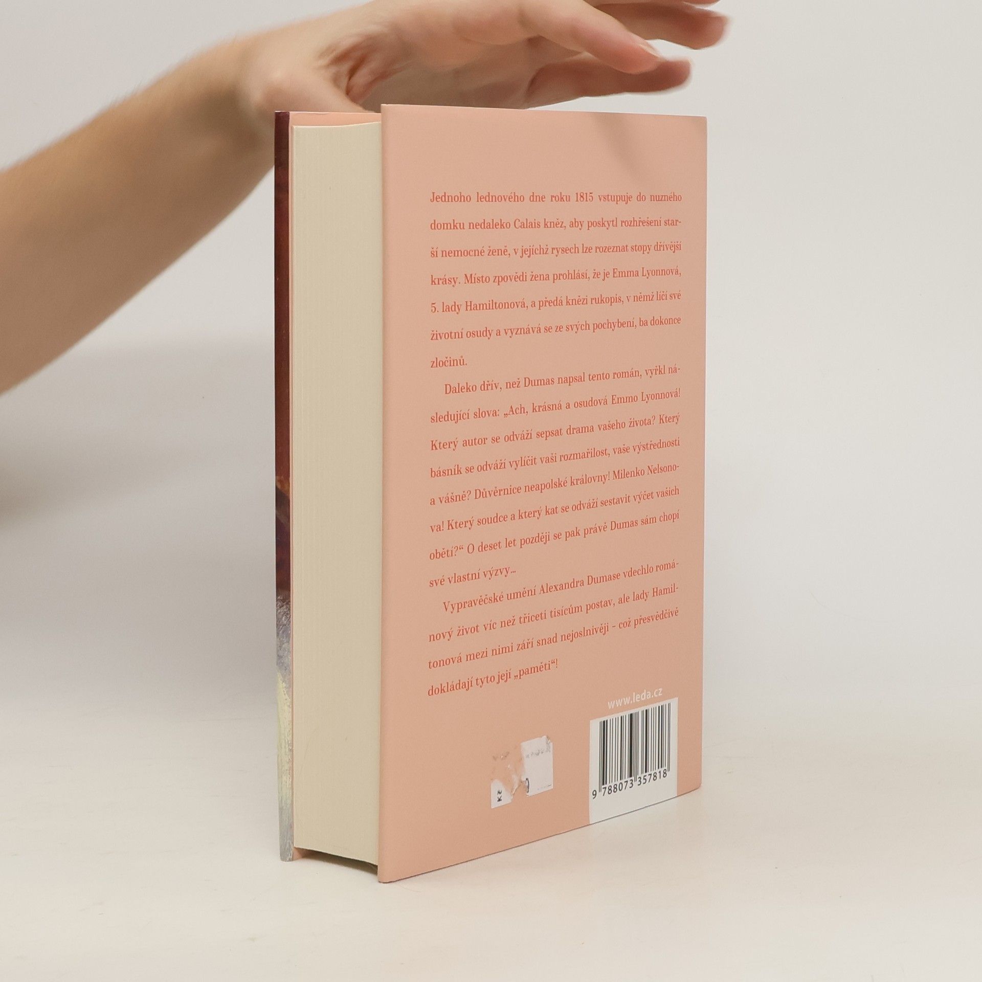 Jednoho lednového dne roku 1815 vstupuje do nuzného domku nedaleko Calais kněz, aby poskytl rozhřešení starší nemocné ženě, v jejíchž rysech lze rozeznat stopy dřívější krásy. Místo zpovědi žena prohlásí, že je Emma Lyonnová, 5. lady Hamiltonová, a předá knězi rukopis, v němž líčí své životní osudy a vyznává se ze svých pochybení, ba dokonce zločinů.Daleko dřív, než Dumas napsal tento román, vyřkl následující slova: „Ach, krásná a osudová Emmo Lyonnová! Který autor se odváží sepsat drama vašeho života? Který básník se odváží vylíčit vaši rozmařilost, vaše výstřednosti a vášně? Důvěrnice neapolské královny! Milenko Nelsonova! Který soudce a který kat se odváží sestavit výčet vašich obětí?“ O deset let později se pak právě Dumas sám chopí své vlastní výzvy…Vypravěčské umění Alexandra Dumase vdechlo románový život víc než třiceti tisícům postav, ale lady Hamiltonová mezi nimi září snad nejoslnivěji – což přesvědčivě dokládají tyto její „paměti“!