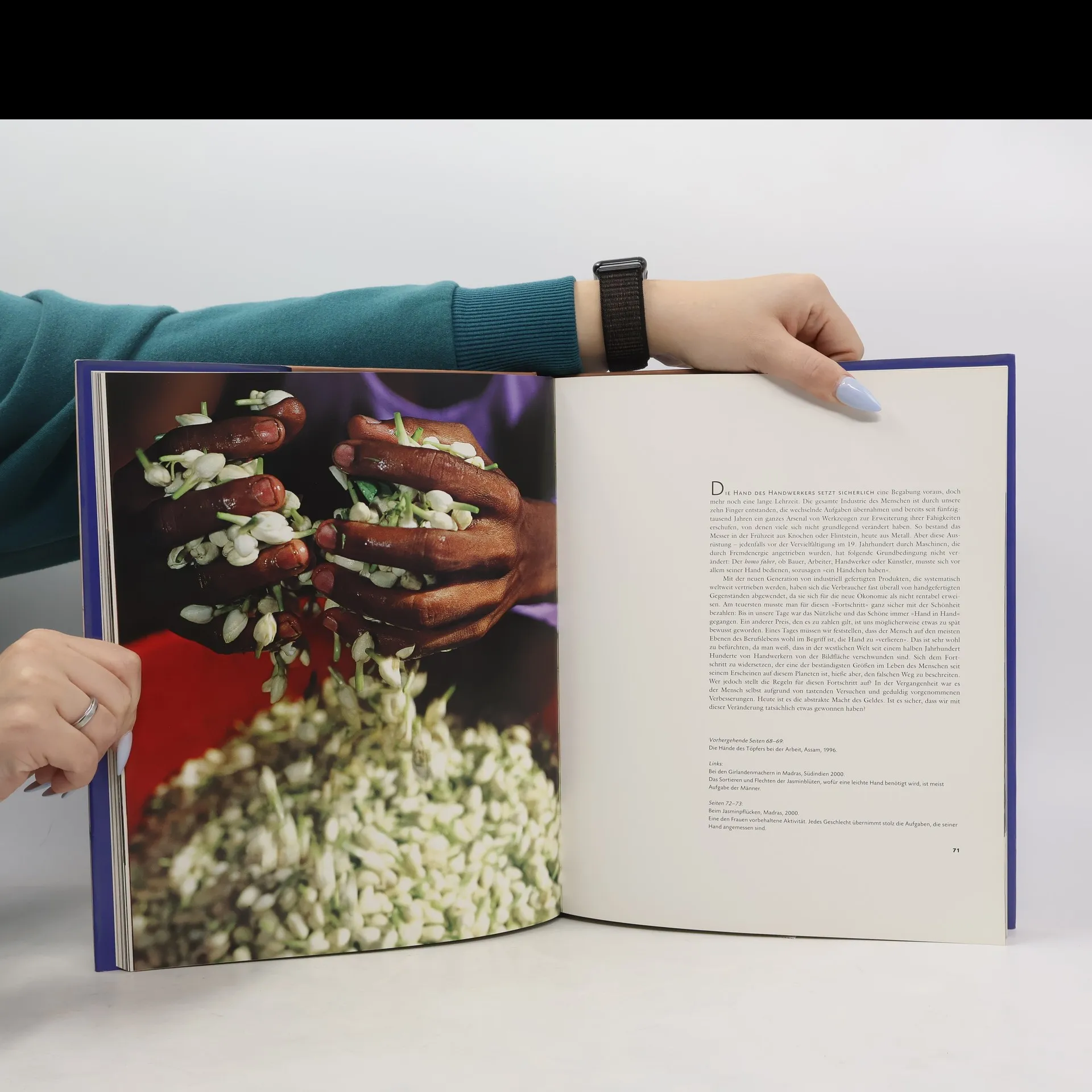 Als der Mensch aufrecht zu gehen beschloss, standen ihm plötzlich zwei Hände zur Verfügung, die ihm die Welt neu erschlossen. Die Hand ist uns selbstverständlich, bis wir sie verletzen; dann erkennen wir ihre Möglichkeiten: taktile Empfindungen, komplexe Manipulation, gestischen Ausdruck. Die Fotografen Tiziana und Gianni Baldizzone haben die Schönheit und Ausdruckskraft dieses sensiblen Organs in beeindruckenden Bildern festgehalten. Sie zeigen Hände in verschiedenen Facetten: feingliedrig und grob, geschickt und sanft, alt und jung – bei der Arbeit, im Spiel und im Tanz. Hände sind nicht nur Werkzeuge, sie sind auch Symbole von Kultur. In Indien beispielsweise erhält die Braut mit Henna gemalte Muster, während in anderen Ländern Männer ihre Hände zu besonderen Anlässen mit Schmuck verzieren. Die Bilder verdeutlichen, dass Hände in allen Kulturen eine eigene Sprache sprechen. Ähnlich wie das Gesicht verraten sie, ob jemand wohlwollend empfangen oder zurückgewiesen wird. Die facettenreichen Bilder aus vier Kontinenten werden durch einen Text des französischen Verhaltensforschers und Neurologen Boris Cyrulnik ergänzt, der die Entwicklung der Hände vom Instrument zum Kommunikationsmedium und deren kulturelle Bedeutung nachzeichnet. Ein ästhetischer und ethnographisch aufschlussreicher Blick auf unser ausdrucksstärkstes Körperteil nach dem Gesicht.