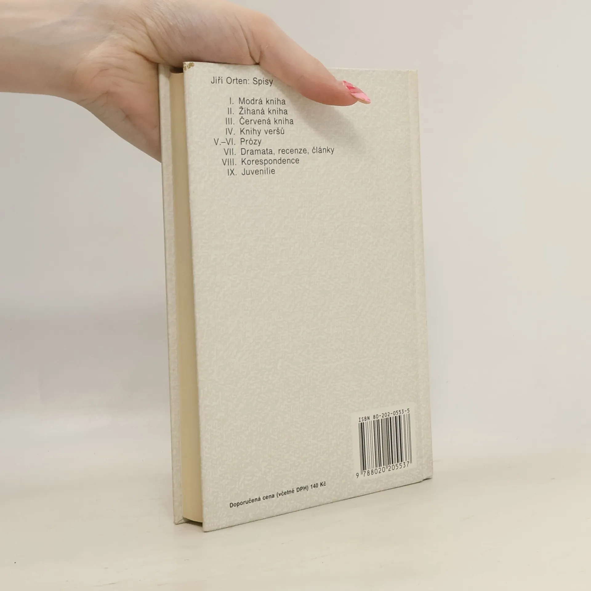 Svazek obsahuje kompletní básnické sbírky Jiřího Ortena. Sbírky Čítanka jaro, Cesta k mrazu, Ohnice, Mé město, Jeremiášův pláč, Scestí a Elegie. Sbírky jsou řazeny chronologicky podle doby svého vzniku, nikoliv podle data vydání. Všechny básně jsou obsaženy také v předcházejících prvních třech svazcích Ortenových Spisů, tedy v Modré, Žíhané či Červené knize.