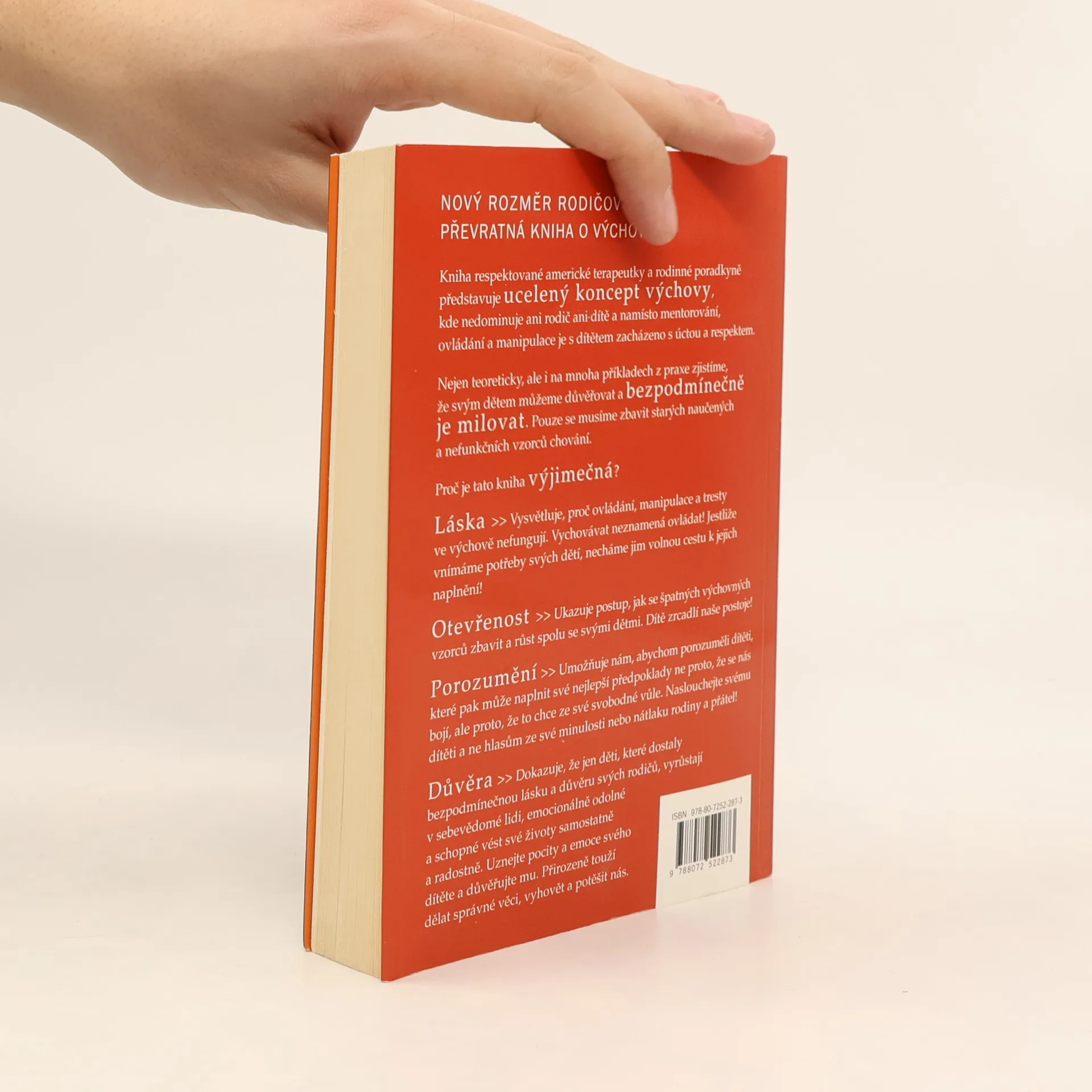 Kniha respektované americké terapeutky a rodinné poradkyně představuje ucelený koncept výchovy, kde nedominuje ani rodič ani dítě a namísto mentorování, ovládání a manipulace je s dítětem zacházeno s úctou a respektem. Nejen teoreticky, ale i na mnoha příkladech z praxe zjistíme, že svým dětem můžeme důvěřovat a bezpodmínečně je milovat. Pouze se musíme zbavit starých naučených a nefunkčních vzorců chování. Proč je tato kniha výjimečná? láska- vysvětluje, proč ovládání, manipulace a tresty ve výchově nefungují. otevřenost- ukazuje postup, jak se špatných výchovných vzorců zbavit a růst spolu se svými dětmi. porozumění- umožňuje nám, abychom porozuměli dítěti, které pak může naplnit své nejlepší předpoklady. důvěra- dokazuje, že jen děti, které dostaly bezpodmínečnou lásku a důvěru svých rodičů, vyrůstají v sebevědomé lidi, emocionálně odolné a schopné vést své životy samostatně a radostně.