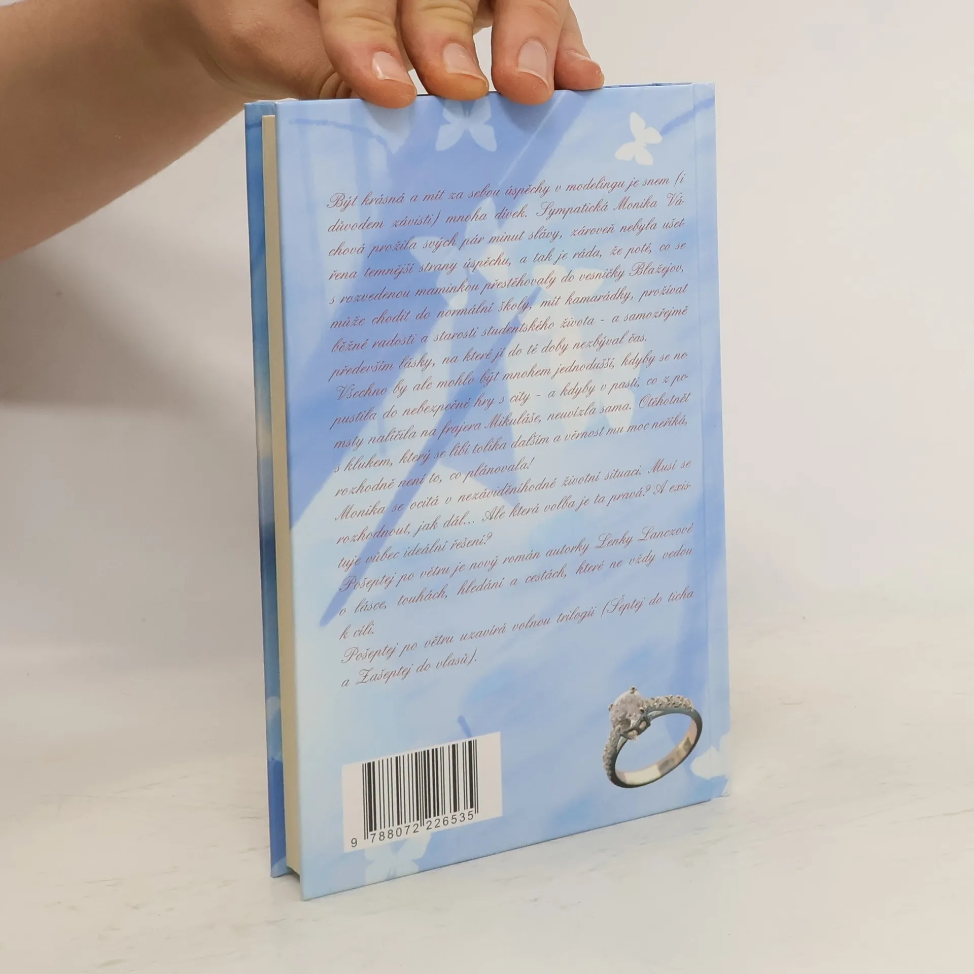 Být krásná a mít za sebou úspěchy v modelingu je snem (i důvodem závisti) mnoha dívek. Sympatická Monika Váchová prožila svých pár minut slávy a zároveň nebyla ušetřena temnější strany úspěchu, a tak je ráda, že poté, co se s rozvedenou maminkou přestěhovaly do vesničky Blažejov, může chodit do normální školy, mít kamarádky, prožívat běžné radosti a starosti studentského života – a samozřejmě především lásky, na které jí do té doby nezbýval čas. Všechno by ale mohlo být mnohem jednodušší, kdyby se nepustila do nebezpečné hry s city – a kdyby v pasti, co z pomsty nalíčila na frajera Mikuláše, neuvízla sama. Otěhotnět s klukem, který se líbí tolika dalším a věrnost mu moc neříká , rozhodně není to, co plánovala! Monika se ocitá v nezáviděníhodné životní situaci. Musí se rozhodnout, jak dál.Ale která volba je ta pravá? A existuje vůbec ideální řešení? Pošeptej po větru je nový román autorky Lenky Lanczové o lásce, touhách, hledání a cestách, které ne vždy vedou k cíli. Pošeptej po větru uzavírá volnou trilogii (Šeptej do ticha a Zašeptej do vlasů). V knize také vystupuje postava Tomáše Koubka z knih Hořká chuť lásky a Postel plná růží. Tomáš totiž chodí určitý čas s Mikulášovou sestrou Karin.