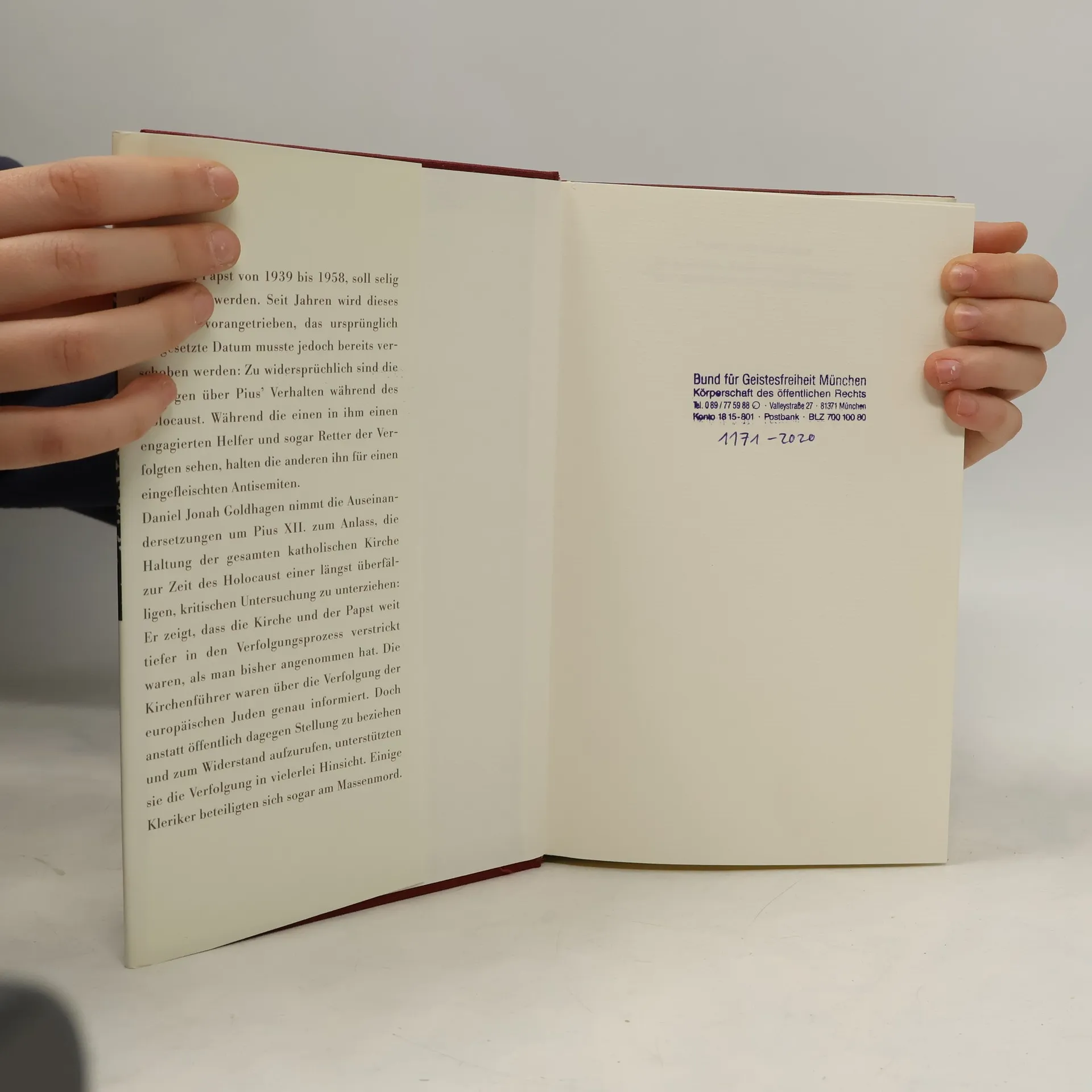 Pius XII., Papst von 1939 bis 1958, soll selig gesprochen werden, doch das Datum wurde bereits verschoben, da die Meinungen über sein Verhalten während des Holocaust widersprüchlich sind. Während einige ihn als Helfer der Verfolgten betrachten, sehen andere in ihm einen Antisemiten. Daniel Jonah Goldhagen nutzt diese Debatte, um die Haltung der katholischen Kirche während des Holocaust kritisch zu untersuchen. Er zeigt, dass die Kirche und der Papst stärker in den Verfolgungsprozess involviert waren, als bisher angenommen. Kirchenführer waren über die Verfolgung der Juden informiert, doch anstatt sich öffentlich dagegen auszusprechen, unterstützten sie die Verfolgung und einige Kleriker beteiligten sich sogar am Massenmord. Goldhagen stellt die zentrale Frage von Schuld und Sühne: Wie geht die katholische Kirche, als moralische Instanz, mit ihrer Verstrickung im Holocaust um? Er entwickelt Kriterien zur Bewertung der Schuld sowohl der Institution als auch des Einzelnen und argumentiert, dass die Kirche ihre Pflicht zur Sühne nicht anerkannt oder erfüllt hat. Zudem skizziert er die notwendigen Maßnahmen, die die katholische Kirche ergreifen müsste, um ihre Opfer moralisch zu entschädigen und sich als Religion der Liebe und Güte zu rehabilitieren.