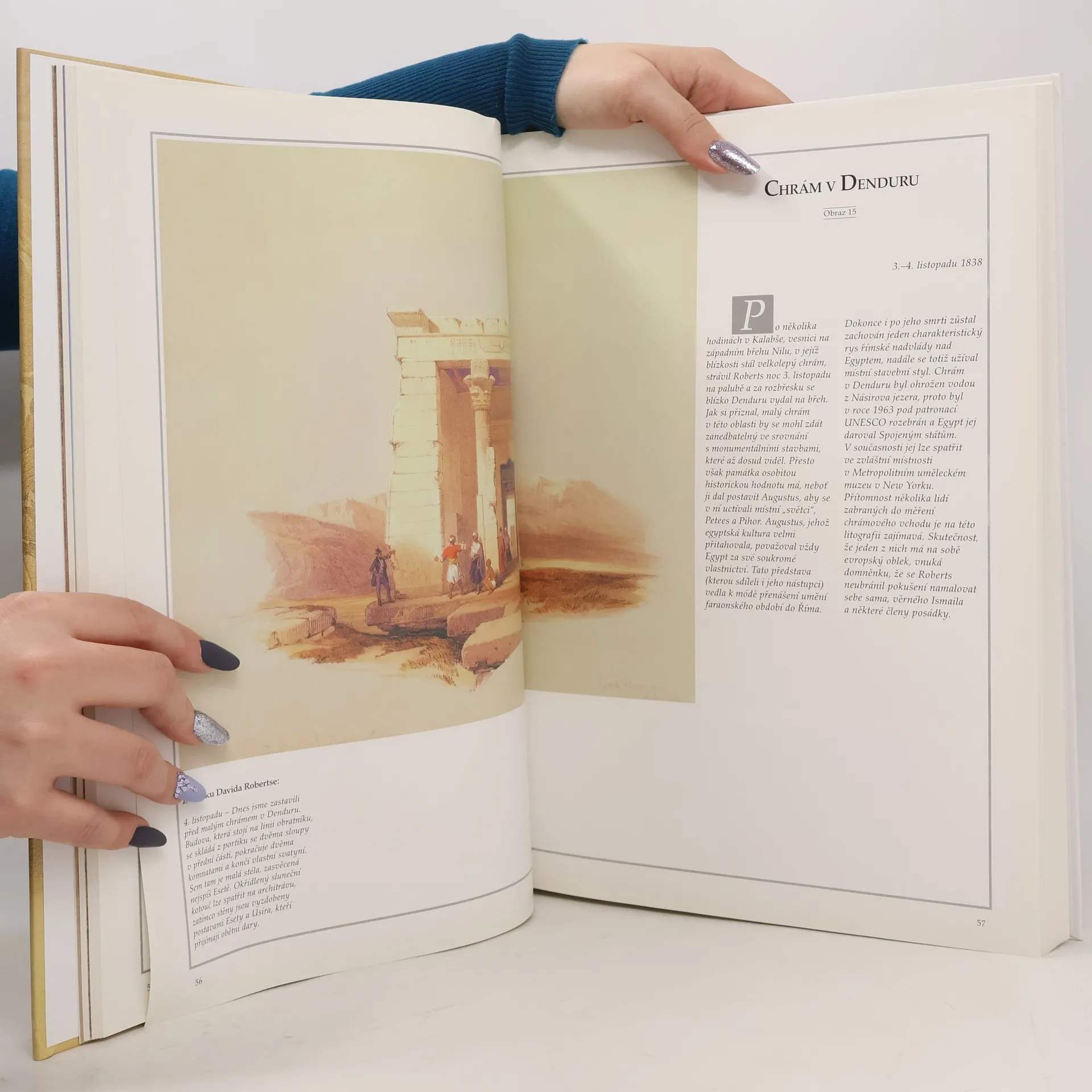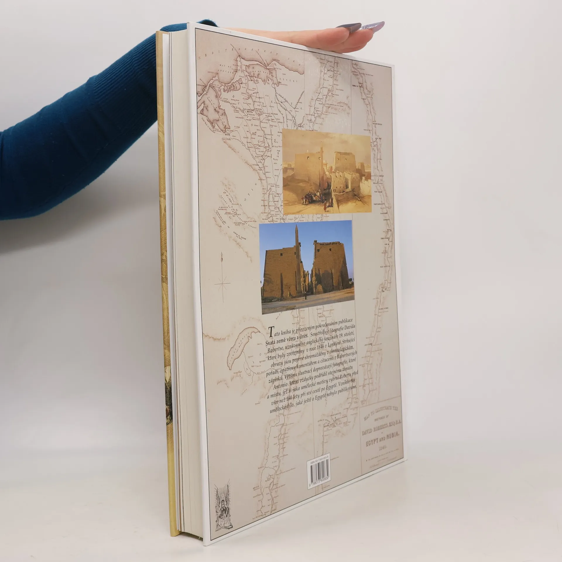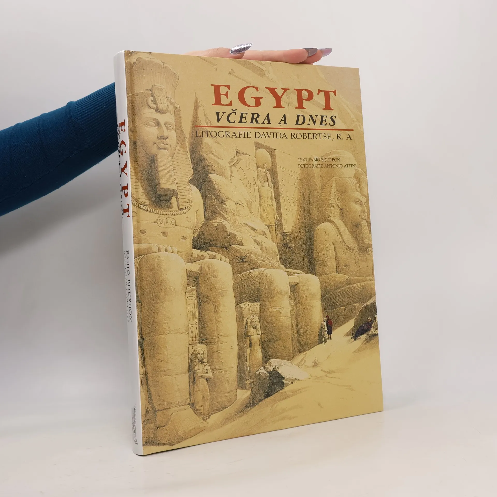 LITOGRAFIE DAVIDA ROBERTSE, R. A. Tato kniha je přirozeným pokračováním publikace Svatá země včera a dnes. Soustřeďuje litografie Davida Robertse, uznávaného anglického krajináře 19. století, které byly zveřejněny v roce 1846 v Londýně. strhující obrazy jsou poprvé shromážděny v chronologickém pořadí, opatřeny komentářem a citacemi Robertsových zápisků. Většinu ilustrací doprovázejí fotografie, které Antonio Attini vždycky podřídil stejnému tématu a místu, jež si jako umělecké motivy vybral Roberts před více než 160 lety při své cestě po Egyptě. Vzniklo tak umělecké dílo, jaké ještě o Egyptě nebylo publikováno.