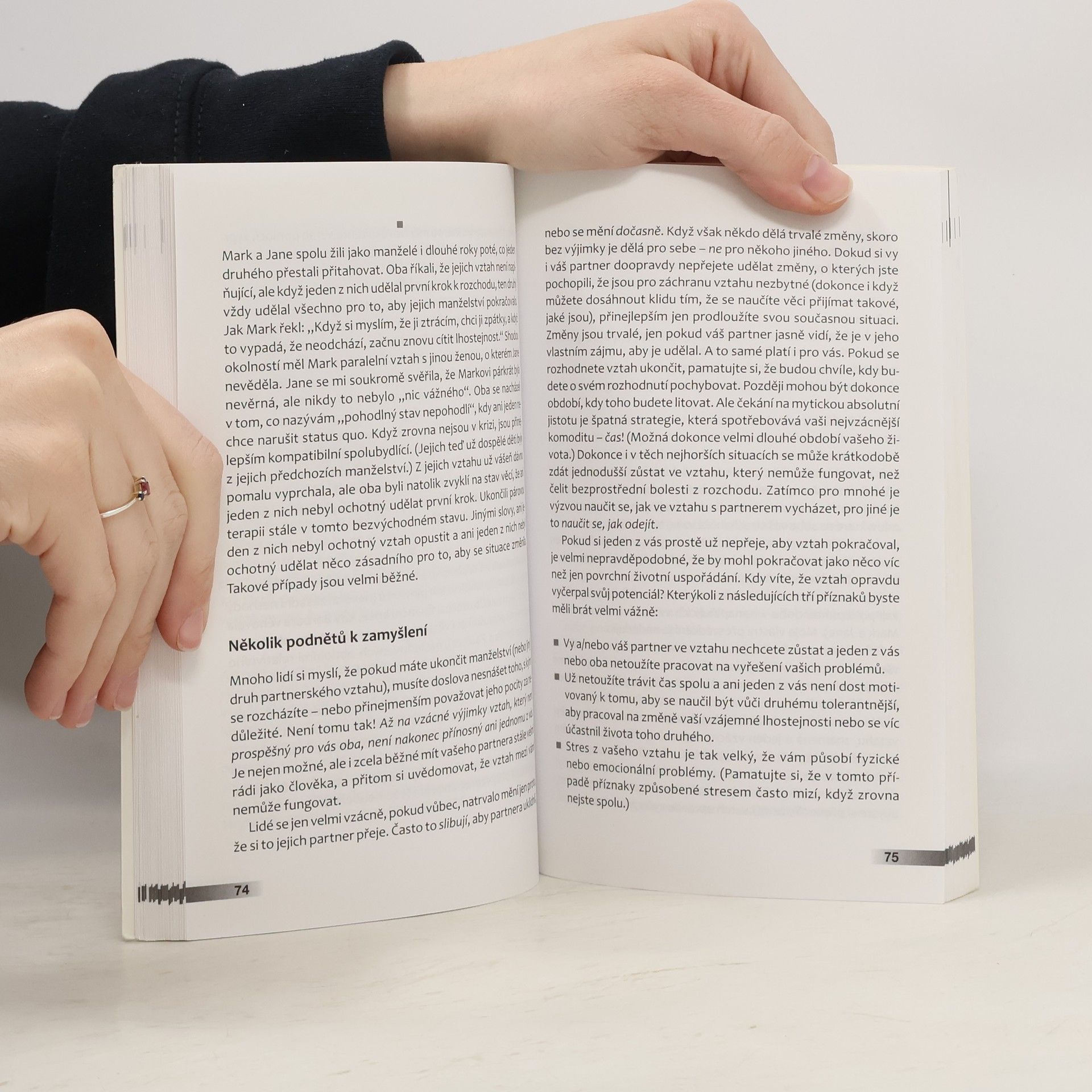 Průvodce partnerskou krizí. Partneři v nešťastném vztahu často nejsou s to sami rozhodnout, zda mají spolu zůstat, nebo se rozejít. Kniha se zabývá touto bolestnou ambivalencí. Pomáhá na jedné straně najít stránky vztahu, na kterých lze dále stavět a usilovat o jeho záchranu. Na druhé straně pomáhá rozpoznat, zda vztah ukončit a jak pracovat na rozchodu bez vzájemného ubližování a pocitů viny. Kniha je určena všem, kteří žijí v obtížném vztahu a rozhodují se, zda v něm zůstat, nebo odejít. Je určena všem, kteří chtějí porozumět tomu, že je od partnera či partnerky dnes odpuzuje právě to, co bylo dříve přitažlivé, a kteří uvažují, zda vyhledat odbornou pomoc a co od ní očekávat. Publikaci ocení čtenáři v manželských či partnerských vztahových obtížích, jejich rodinní blízcí a přátelé.