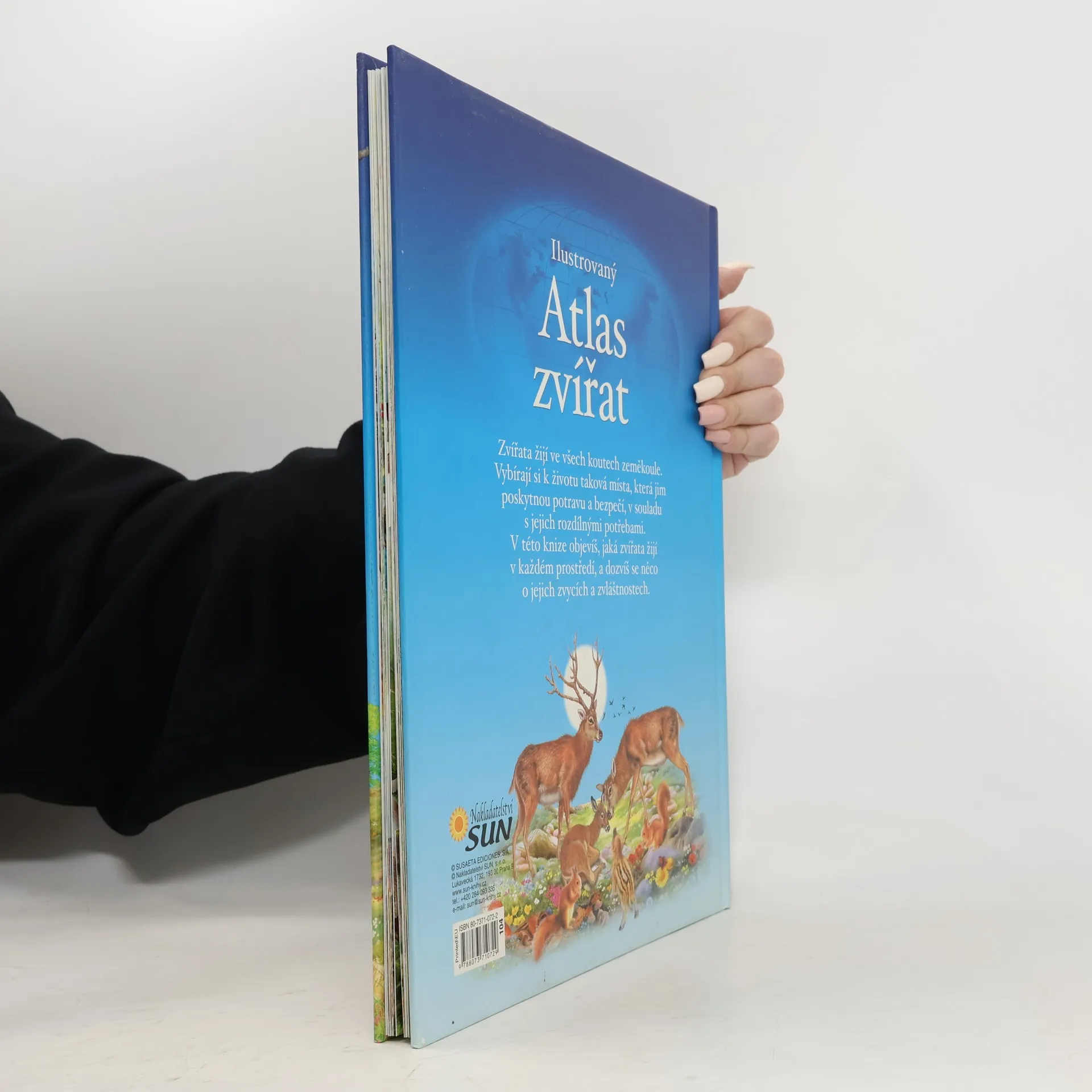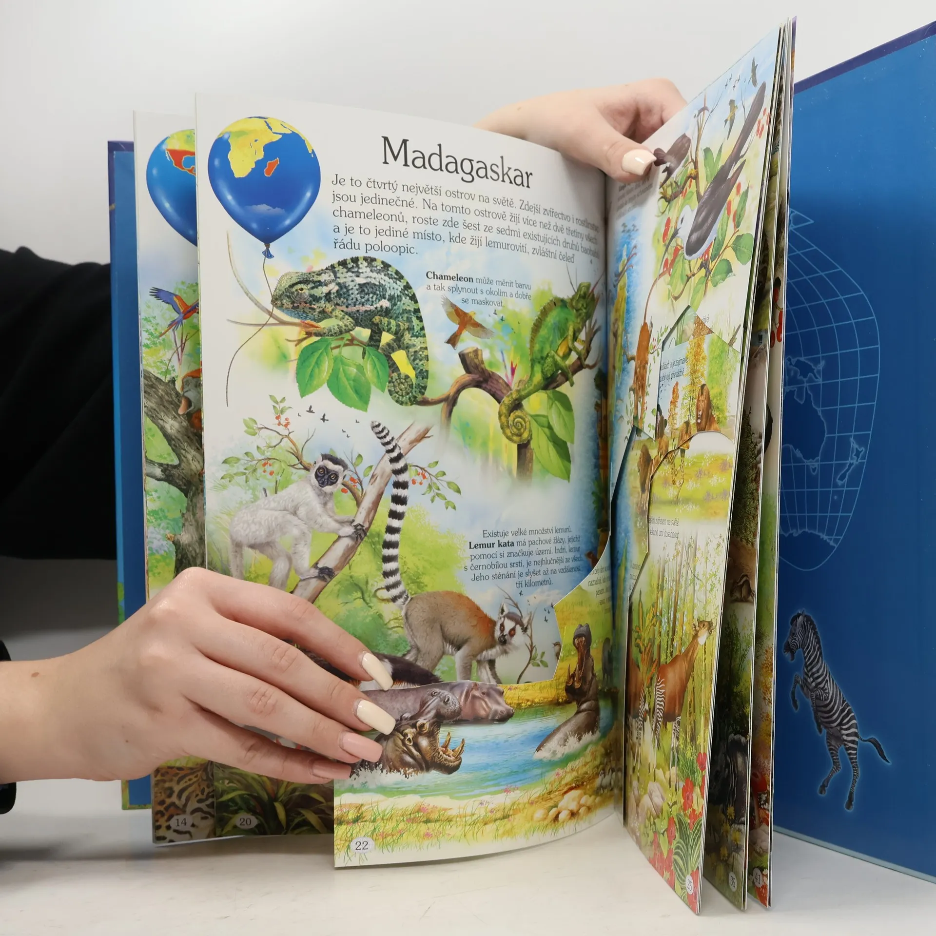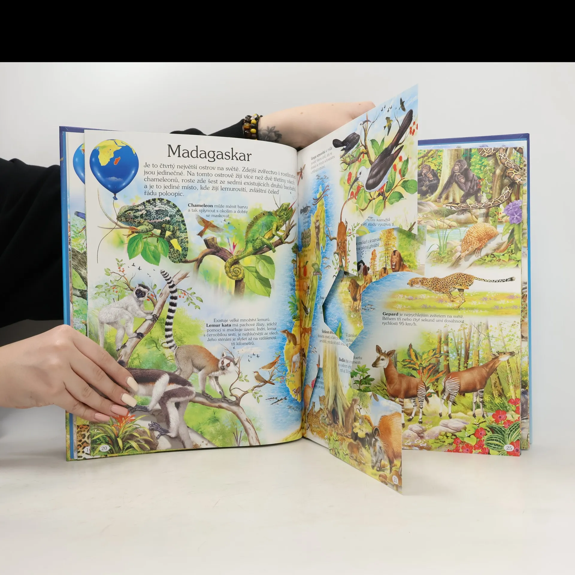 Tato nádherně ilustrovaná barevná kniha seznámí děti s velkým množstvím zvířat. Dozvědí se, jaká zvířata žijí v jednotlivých světadílech či jejich částech a jak se chovají ve svém přirozeném prostředí. Navíc jsou obrázky doplněny popisky, které přibližují i lidskou činnost v dané části světa: nejvýznamnější stavby, zemědělství či charakteristická průmyslová odvětví s jejich produkty. Pevná vázaná vazba, bohaté celostránkové barevné ilustrace.