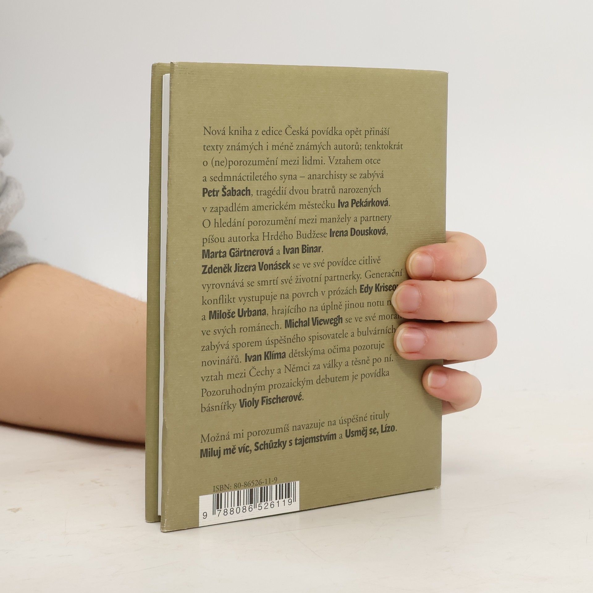 Nová kniha z edice Česká povídka opět přináší texty známých i méně známých autorů; tentokrát o (ne)porozumění mezi lidmi. Vztahem otce a sedmnáctiletého syna - anarchisty se zabývá Petr Šabach, tragédií dvou bratrů narozených v zapadlém americkém městečku Iva Pekárková. O hledání porozumění mezi manžely a partnery píšou autorka Hrdého Budžese Irena Dousková, Marta Gärtnerová a Ivan Binar. Zdeněk Jizera Vonásek se ve své povídce citlivě vyrovnává se smrtí své životní partnerky. Generační konflikt vystupuje na povrch v prózách Edy Kriseové a Miloše Urbana, hrajícího úplně na jinou notu než ve svých románech. Michal Viewegh se ve své moralitě zabývá sporem úspěšného spisovatele a bulvárních novinářů. Ivan Klíma dětskýma očima pozoruje vztah mezi Čechy a Němci za války a těsně po ní. Pozoruhodným prozaickým debutem je povídka básnířky Violy Fischerové.... celý text