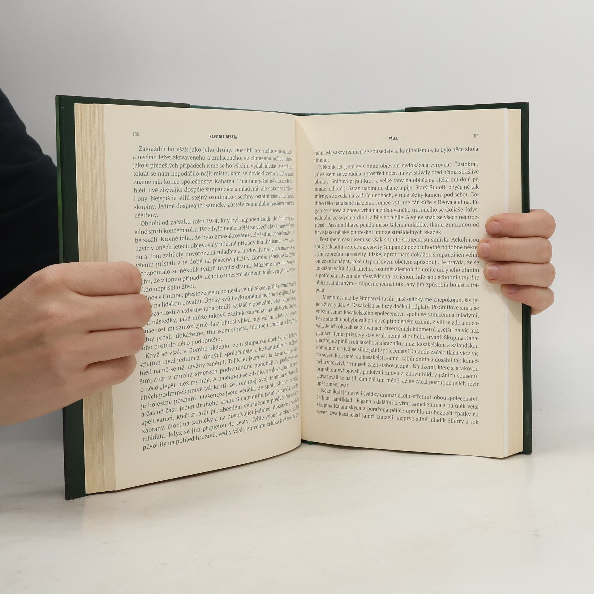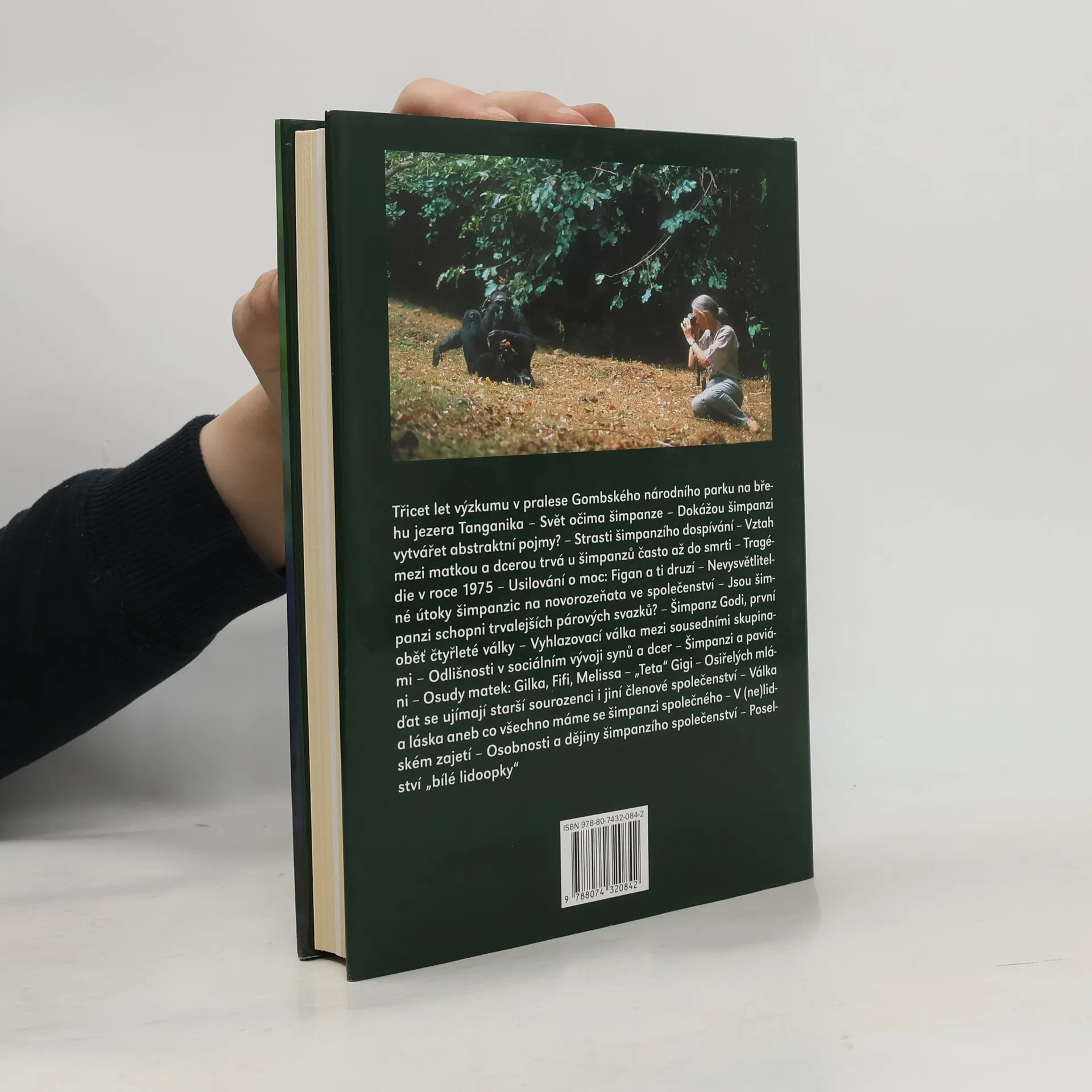 Podtitul: Třicet let se šimpanzi v rezervaci Gombe. Významná, světově proslulá etoložka se ohlíží za svým třicetiletým působením v Africe a podává ságu volně žijících šimpanzů, jejichž studiu se věnovala. Za svého dlouholetého výzkumu odkryla mnoho z jejich života, ale také ukázala, že o nich ještě stále všechno nevíme, například o jejich agresivitě, hloubce jejich starostlivosti či míře jejich vcítění. Šimpanzi, naši nejbližší příbuzní, nám ukazují naši dávnou minulost, díky nim se dozvídáme i o vlastním místě v životě.