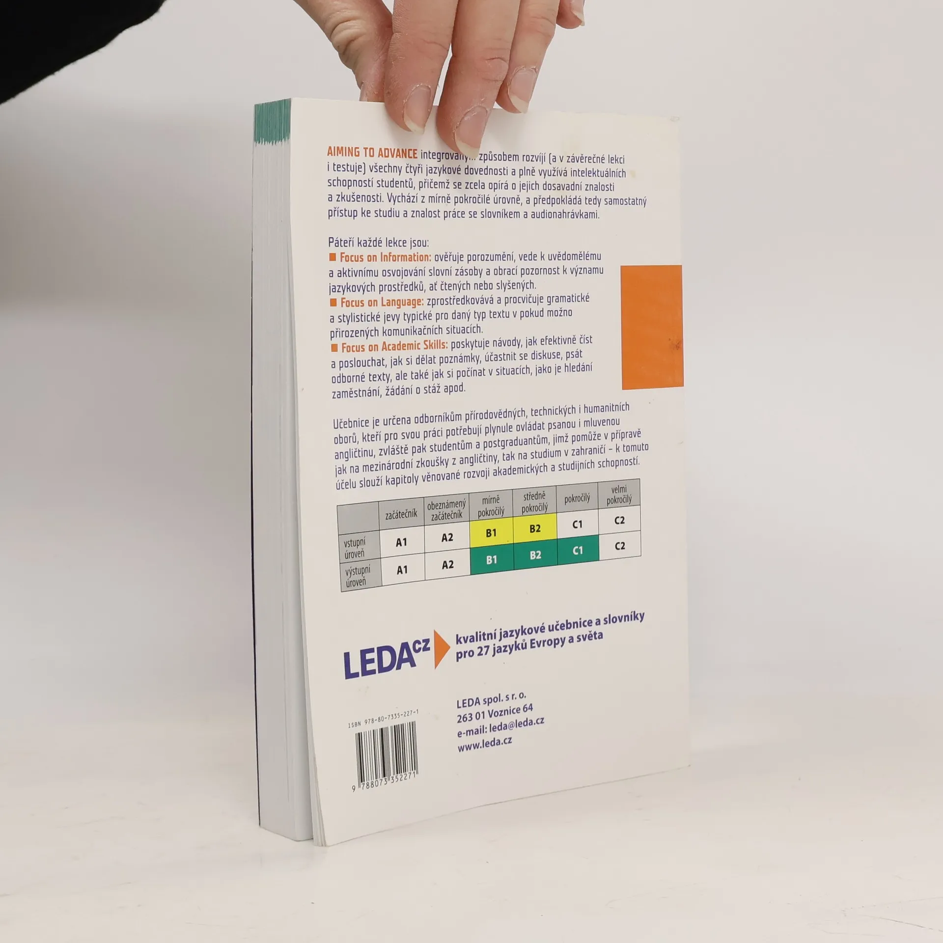AIMING TO ADVANCE integrovaným způsobem rozvíjí (a v závěrečné lekci i testuje) všechny čtyři jazykové dovednosti a plně využívá intelektuálních schopností studentů, přičemž se zcela opírá o jejich dosavadní znalosti a zkušenosti. Vychází z mírně pokročilé úrovně, a předpokládá tedy samostatný přístup ke studiu a znalost práce se slovníkem a audionahrávkami. Páteří každé lekce jsou: Focus on Information: ověřuje porozumění, vede k uvědomělému a aktivnímu osvojování slovní zásoby a obrací pozornost k významu jazykových prostředků, ať čtených nebo slyšených. Focus on Language: zprostředkovává a procvičuje gramatické a stylistické jevy typické pro daný typ textu v pokud možno přirozených komunikačních situacích. Focus on Academic Skills: poskytuje návody jak efektivně číst a poslouchat, jak si dělat poznámky, účastnit se diskuse, psát odborné texty, ale také jak si počínat v situacích, jako je hledání zaměstnání, žádání o stáž apod. Učebnice je určena odborníkům přírodovědných, technických i humanitních oborů, kteří pro svou práci potřebují plynule ovládat psanou i mluvenou angličtinu, zvláště pak studentům a postgraduantům, jimž pomůže v přípravě jak na mezinárodní zkoušky z angličtiny, tak na studium v zahraničí – k tomuto účelu slouží kapitoly věnované rozvoji akademických a studijních schopností.
