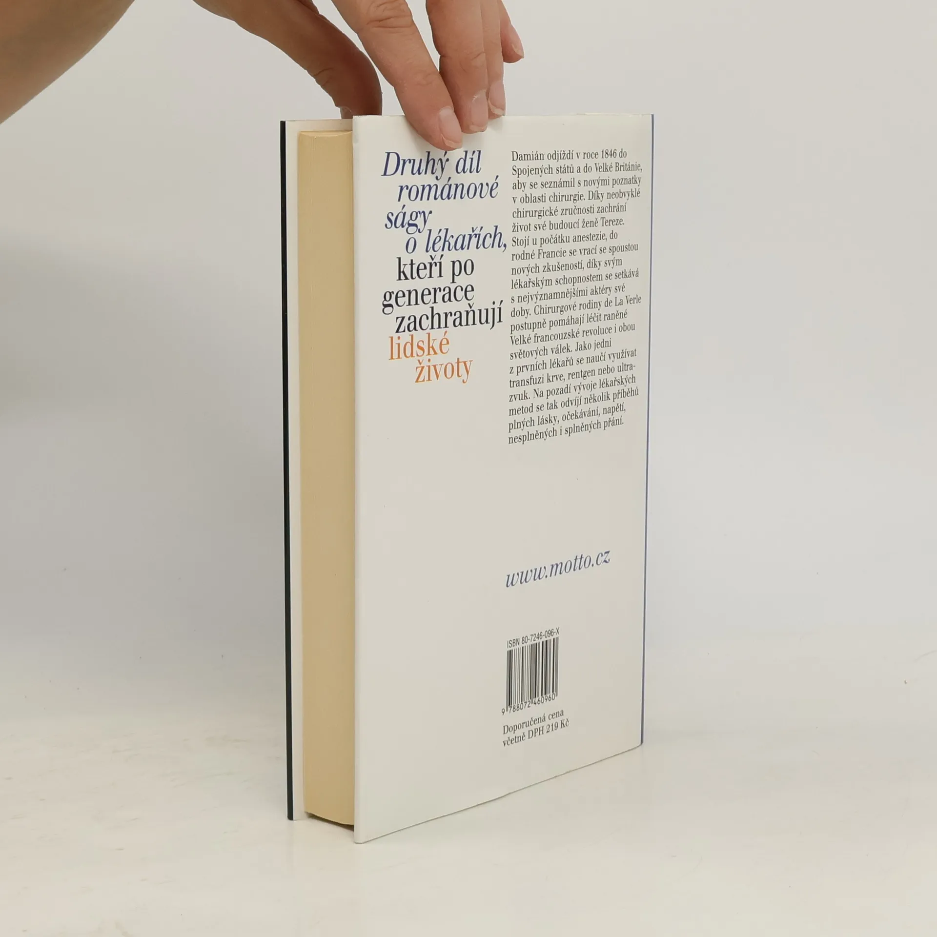 Druhý díl románové ságy o lékařích, kteří po generace zachraňují lidské životy Damián odjíždí v roce 1846 do Spojených států a do Velké Británie, aby se seznámil s novými poznatky v oblasti chirurgie. Díky neobvyklé chirurgické zručnosti zachrání život své budoucí ženě Tereze. Stojí u počátku anestézie, do rodné Francie se vrací se spoustou nových zkušeností, díky svým lékařským schopnostem se setkává s nejvýznamnějšími aktéry své doby. Chirurgové rodiny de La Verle postupně pomáhají léčit raněné Velké francouzské revoluce i obou světových válek...