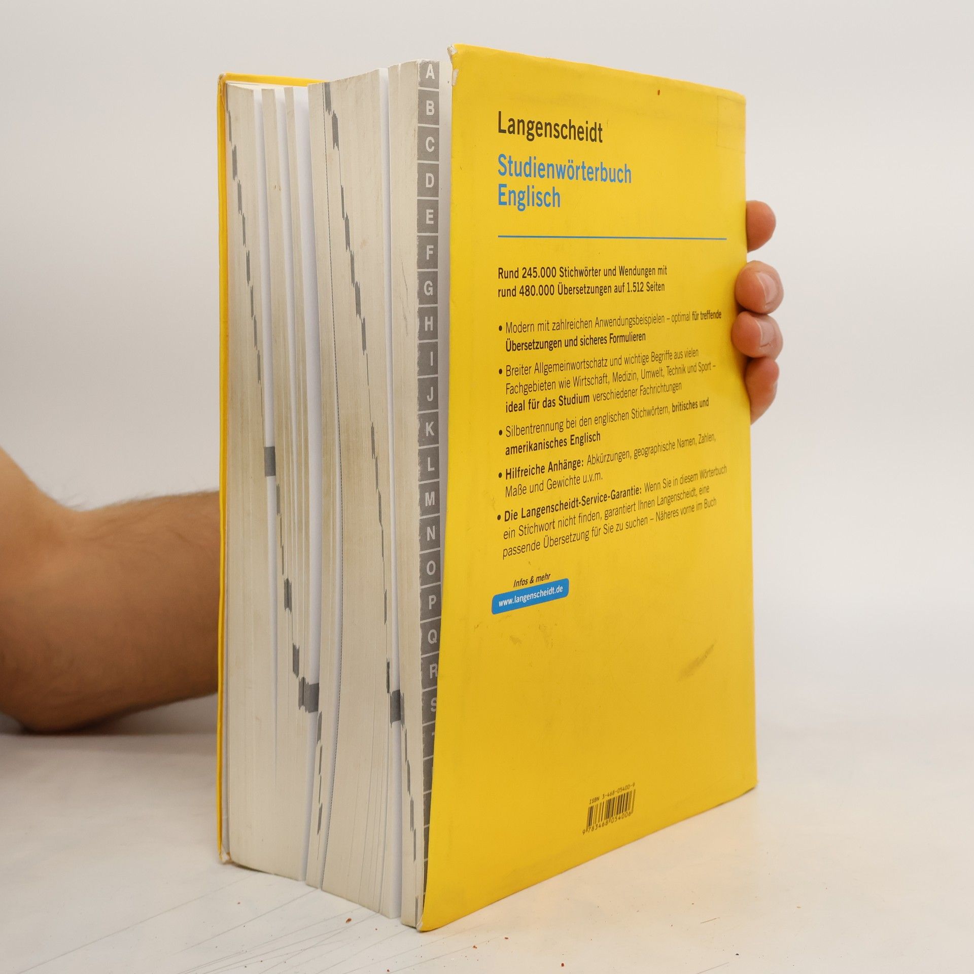 Die Wörterbuch-Sonderausgabe für den kleinen (Studenten) Geldbeutel im praktischen Komplettband für nur € 24,90. Rund 245.000 Stichwörter und Wendungen mit rund 480.000 Übersetzungen moderner, vielseitiger Wortschatz mit zahlreichen Anwendungsbeispielen für treffende Übersetzungen und sicheres Formulieren mit aktuellen Begriffen aus der Allgemeinsprache und so wichtigen Bereichen wie neue Technologien, EU, Wirtschaft und Politik, Medizin und Sport hilfreiche Anhänge: Abkürzungen, geografische und Eigennamen u. v. m. Auch hier gilt die Langenscheidt Service-Garantie: Langenscheidt sucht Übersetzungen zu Wörtern, die Benutzer im Studienwörterbuch nicht finden. Studienausgabe für besonders preisbewusste Wörterbuchbenutzer