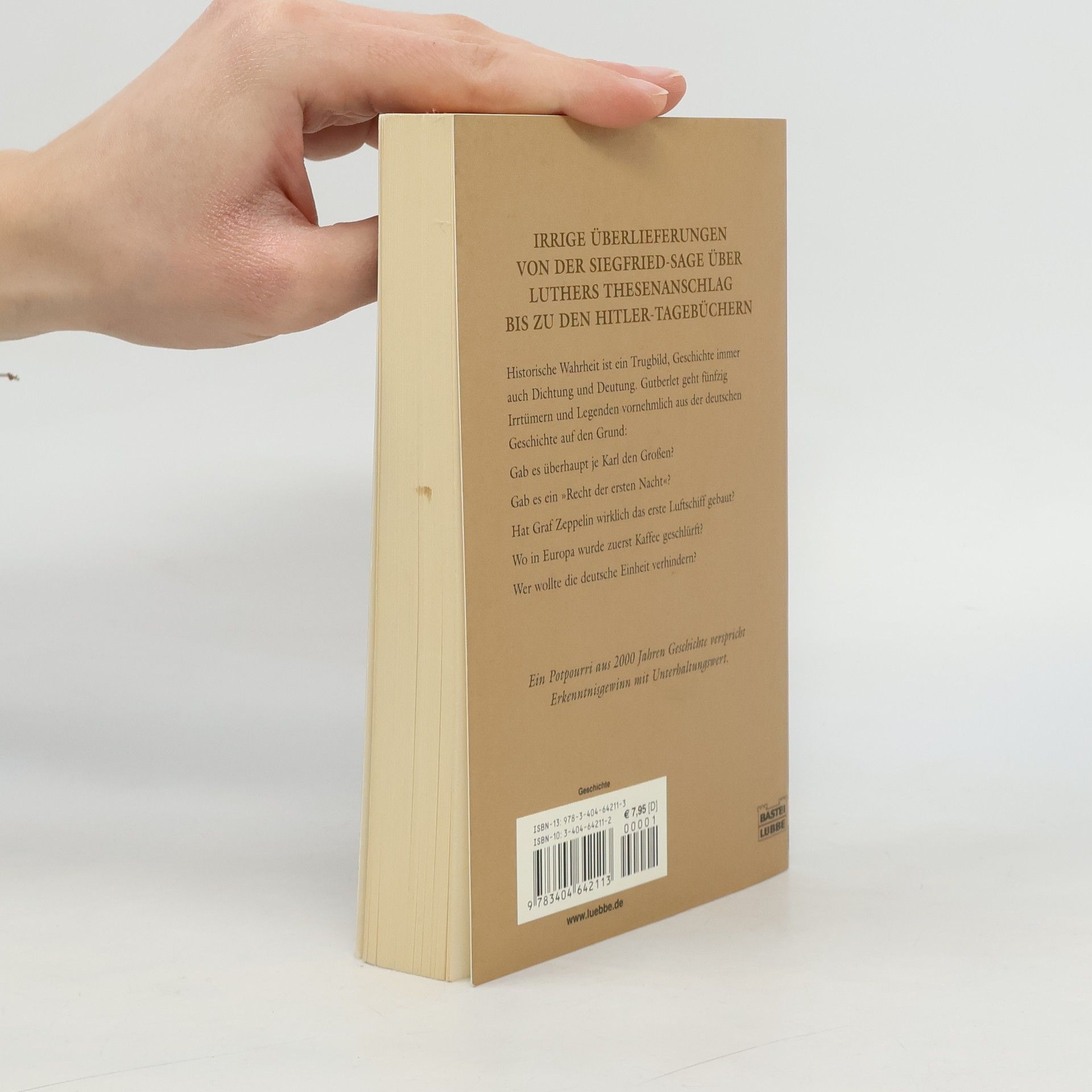 Irrige Überlieferungen von der Siegfried-Sage über Luthers Thesenanschlag bis zu den Hitler-Tagebüchern Historische Wahrheit ist ein Trugbild, Geschichte immer auch Dichtung und Deutung. Gutberlet geht fünfzig Irrtümern und Legenden vornehmlich aus der deutschen Geschichte auf den Grund: Gab es überhaupt je Karl den Großen? Gab es ein „Recht der ersten Nacht“? Hat Graf Zeppelin wirklich das erste Luftschiff gebaut? Wo in Europa wurde zuerst Kaffee geschlürft? Wer wollte die deutsche Einheit verhindern? Ein Potpourri aus 2000 Jahren Geschichte verspricht Erkenntnisgewinn mit Unterhaltungswert.
