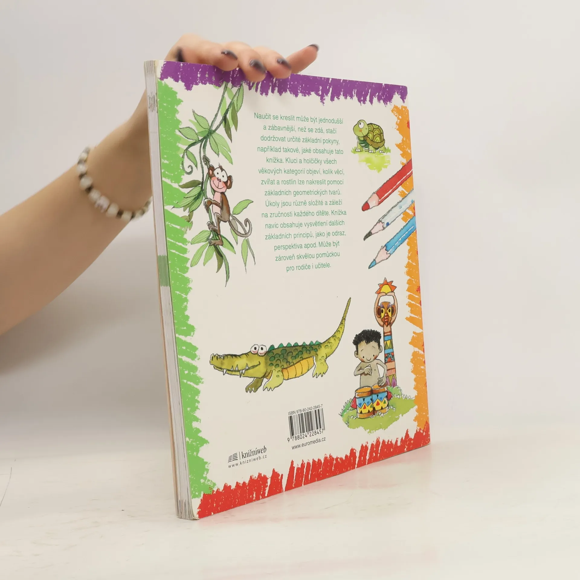 Nauč se kreslit 2. Nauč se kreslit krok za krokem zvířata a postavy z džungle. Nauč se kreslit džungli navazuje na úspěšnou knihu od stejné autorky Nauč se kreslit. Opět se zde děti učí kreslit pomocí jednoduchých tvarů, tentokrát především zvířata, o kterých se zároveň dozvídají různé zajímavosti. Stejně jako předchozí kniha i tato seznamuje s některými základními principy, například s perspektivou, a může proto sloužit jako skvělá pomůcka rodičům i učitelům.