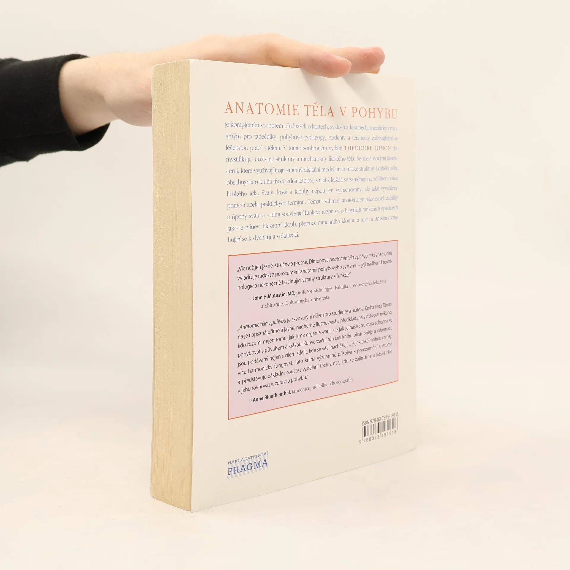 Tento ucelený soubor přednášek se zaměřením na kosti, svaly a klouby lidského těla, a to nejen z hlediska jejich morfologie a struktury, ale především z hlediska jejich funkcí a vzájemného funkčního propojení seznamuje čtenáře se základním anatomickým názvoslovím. Každá kapitola je doplněna s daným tématem souvisejícími přehlednými ilustracemi. Kniha je určena především studentům, jejichž studijní obory předpokládají znalosti fungování pohybového systému lidského těla, dále pak profesionálům v oblasti tance, zpěvu či herectví, pedagogům působícím v těchto oborech a zrovna tak odborníkům, terapeutům zabývajícím se léčebnou prací s tělem.