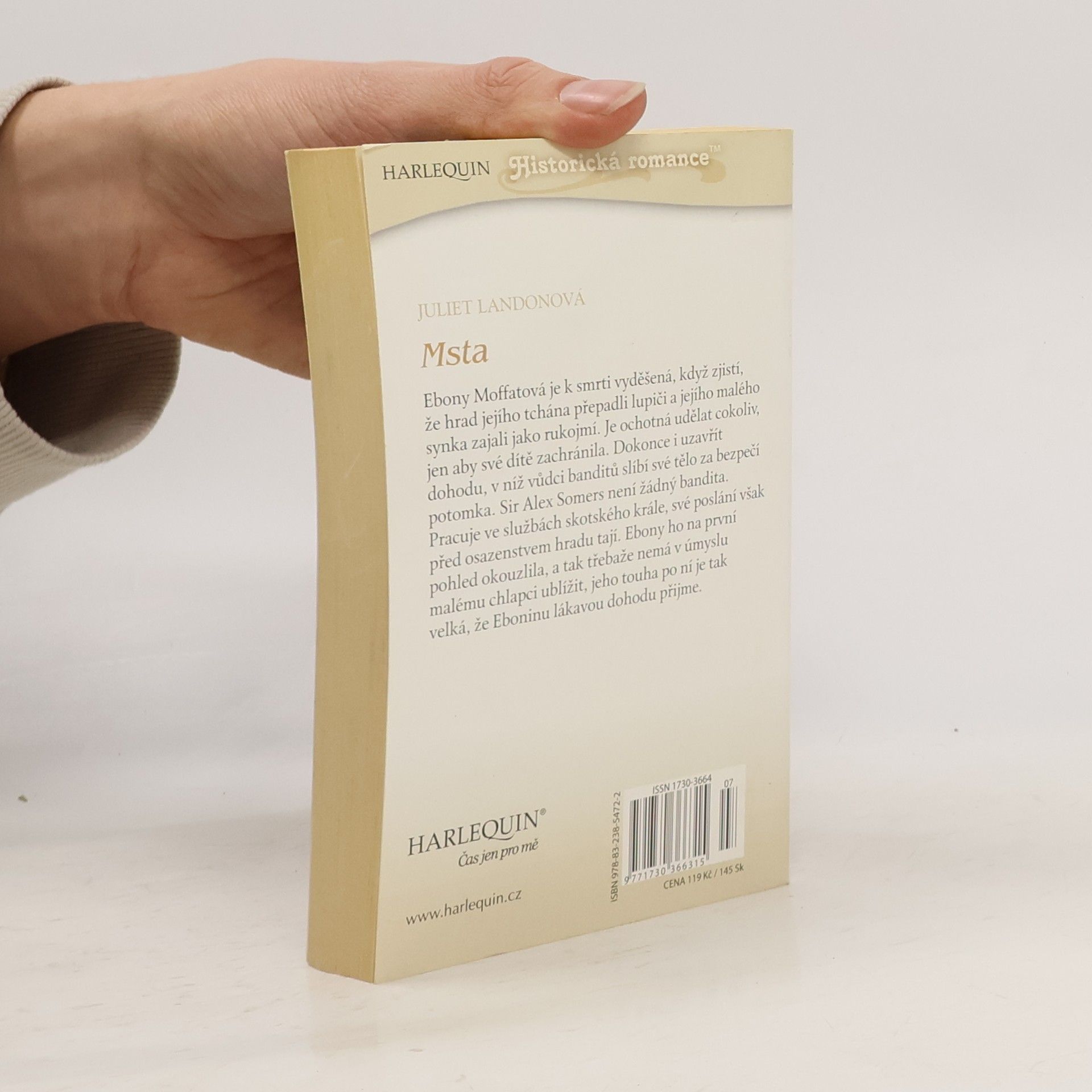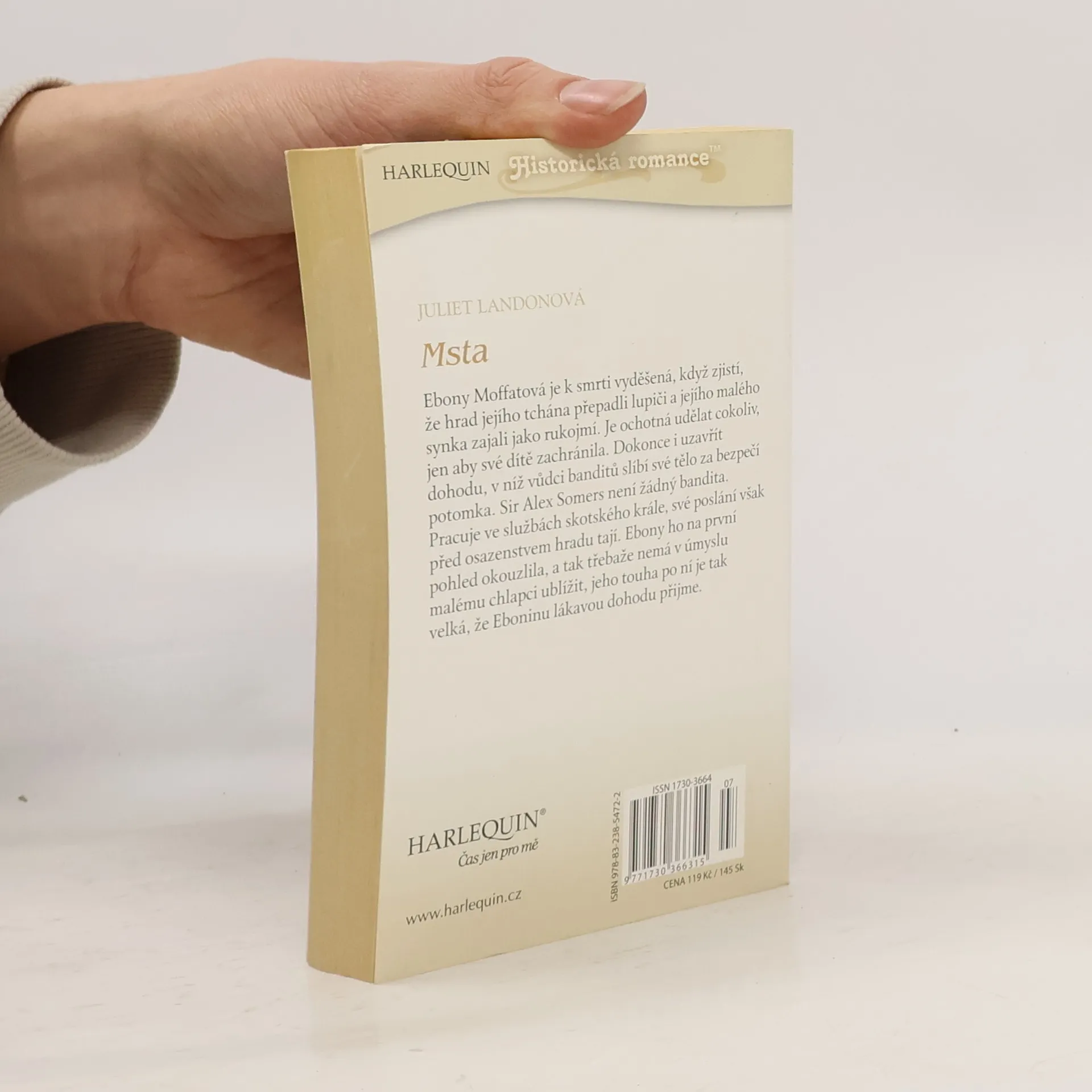 Ebony Moffatová je k smrti vyděšená, když zjistí, že hrad jejího tchána přepadli lupiči a jejího malého synka zajali jako rukojmí. Je ochotná udělat cokoliv, jen aby své dítě zachránila. Dokonce i uzavřít dohodu, v níž vůdci banditů slíbí své tělo za bezpečí potomka. Sir Alex Somers není žádný bandita. Pracuje ve službách skotského krále, své poslání však před osazenstvem hradu tají. Ebony ho na první pohled okouzlila, a tak třebaže nemá v úmyslu malému chlapci ublížit, jeho touha po ní je tak velká, že Eboninu lákavou dohodu přijme.