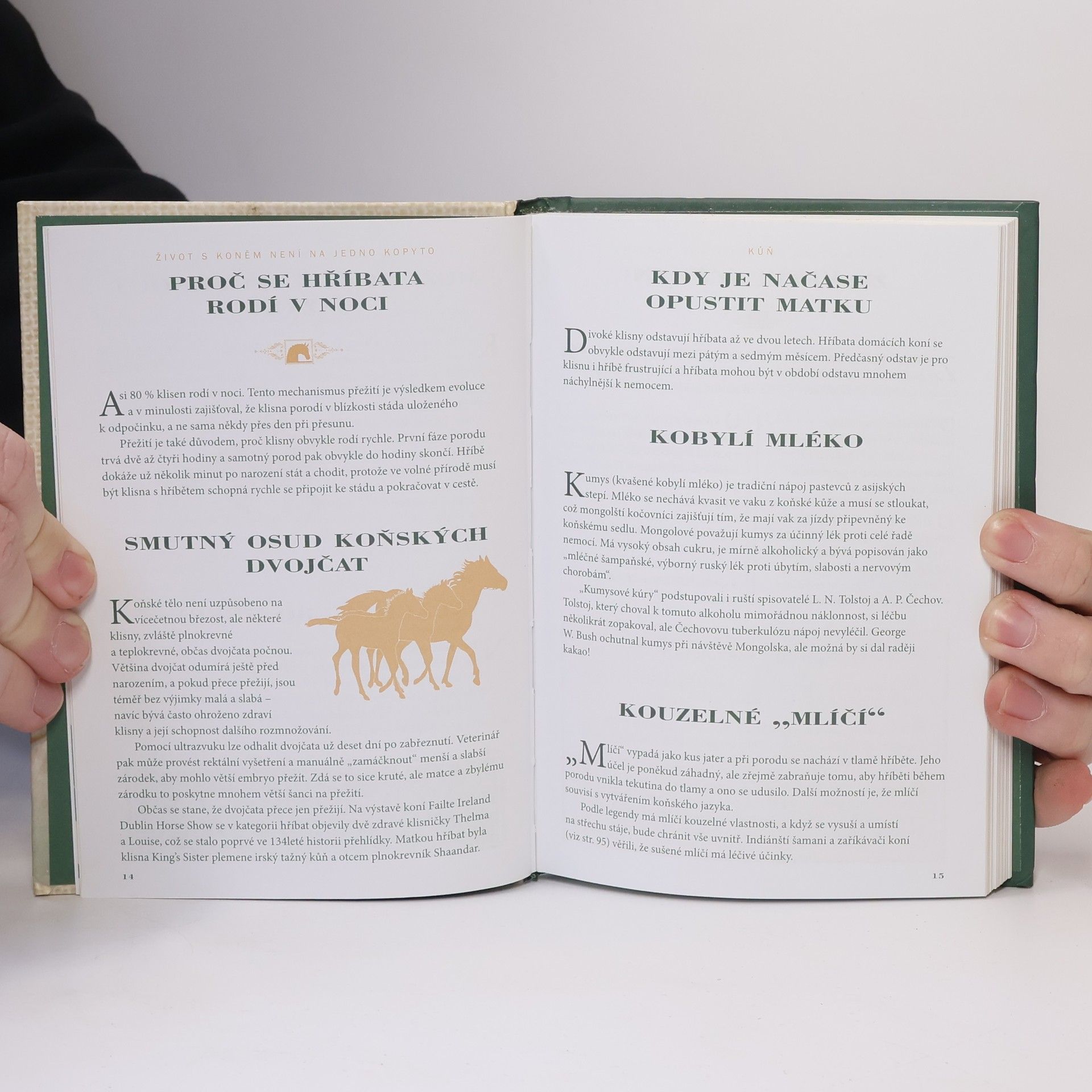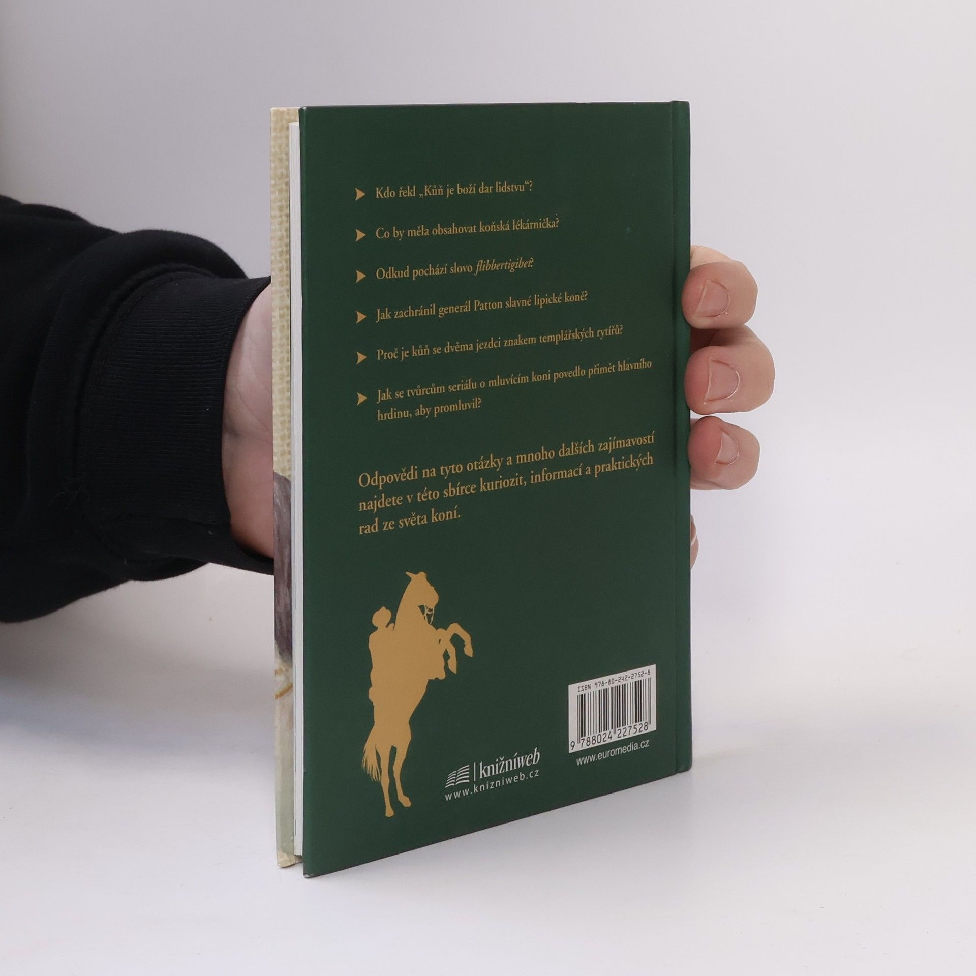 Dárková knížka, kterou ocení každý milovník koní. Hravou a zábavnou formou jsou v ní shrnuty vážné i nevážné informace snad o všem, co by někdo mohl chtít o těchto pozoruhodných zvířatech, která člověka provázejí odnepaměti, vůbec vědět. Kromě základních údajů o původu, anatomii, chovu koní, různých koňských plemenech, koňských sportech a podobně objevíte i zajímavé kuriozity, které jinde nenajdete. Věděli jste například, proč se hříbata rodí v noci? Co je to Galvaynova rýha? Umí kůň plavat? Nechybí informace o slavných osobností proslulých zálibou v koních, k nimž patřil například americký generál Grant, anglická královna Alžběta II. nebo Elvis Presley. V knize najde i výčet slavných knih a filmů, v nichž vystupují koně, od Rosinanty Dona Quijota po Vinnetouova Hatátitlu, seznam písní o koních, tabulky největších dostihových vítězů a podobně zvídavého čtenáře nepochybně zaujmou i přísloví, rčení či pranostiky o koních, posbírané po celém světě, a podivuhodné či neobvyklé skutečné příběhy, v nichž hrají koně hlavní roli. Půvabně zpracovaná publikace zaujme, pobaví i potěší.