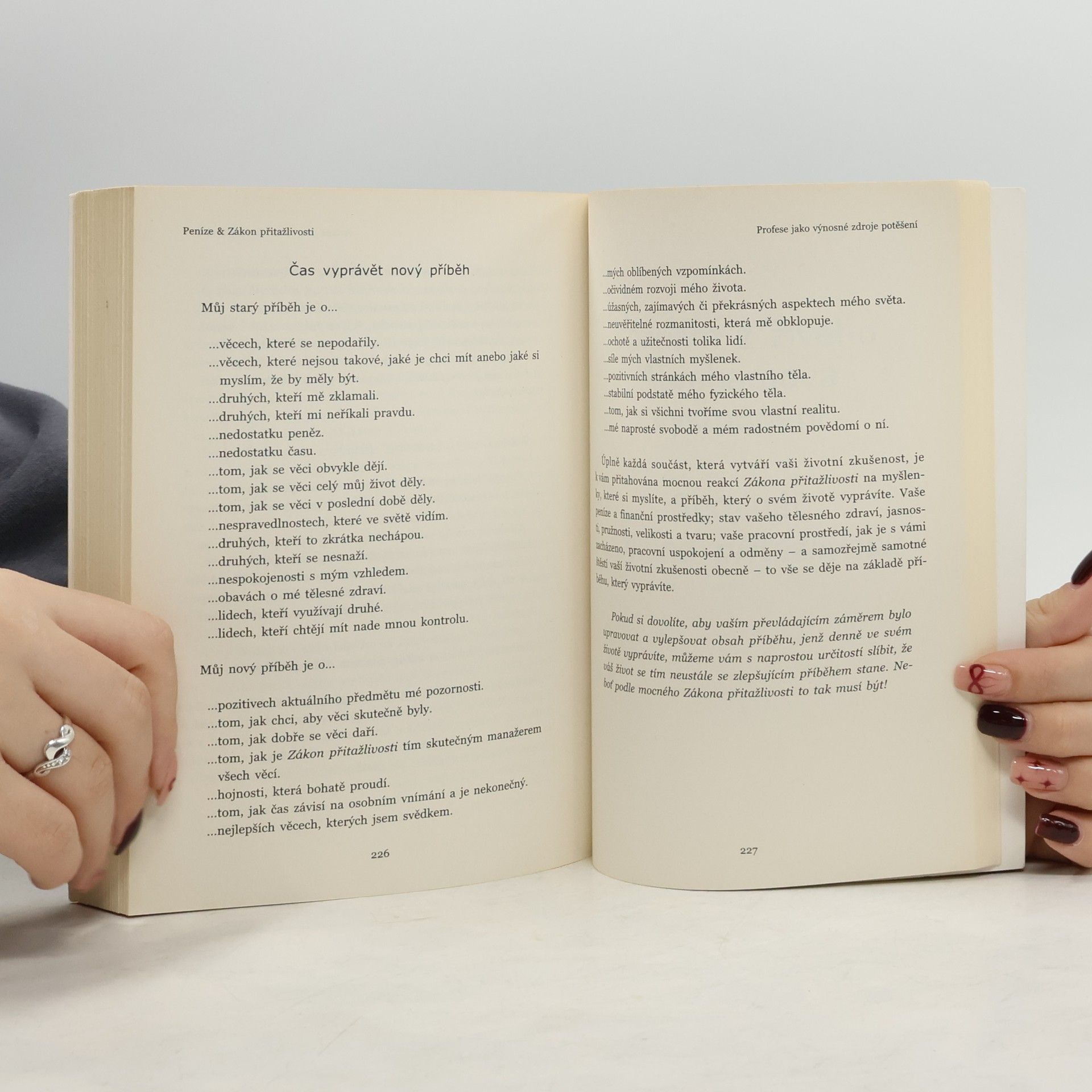 Ústředním tématem této knihy autorů Abraham-Hicks je mocný Zákon přitažlivosti jako jeden z obecně platných, všudypřítomných a ve svém působení neomylně důsledných a konzistentních zákonů vesmíru. Principy Zákona přitažlivosti a jeho působení jsou zde zasazeny do kontextu fyzické reality časoprostoru a běžných životních zkušeností, s nimiž se my lidé denně setkáváme. Abraham - vybraná skupina nadpozemských učitelů - čtenáři prostřednictvím Esther Hicksové nejen podrobně a srozumitelně vysvětluje, jak Zákon přitažlivosti působí a jak se projevuje, ale ze své širší perspektivy sděluje vědění, jemuž jsme se během prožívání našich životních zkušeností v různé míře vzdálili a k jehož probuzení nás Abraham povzbuzuje.