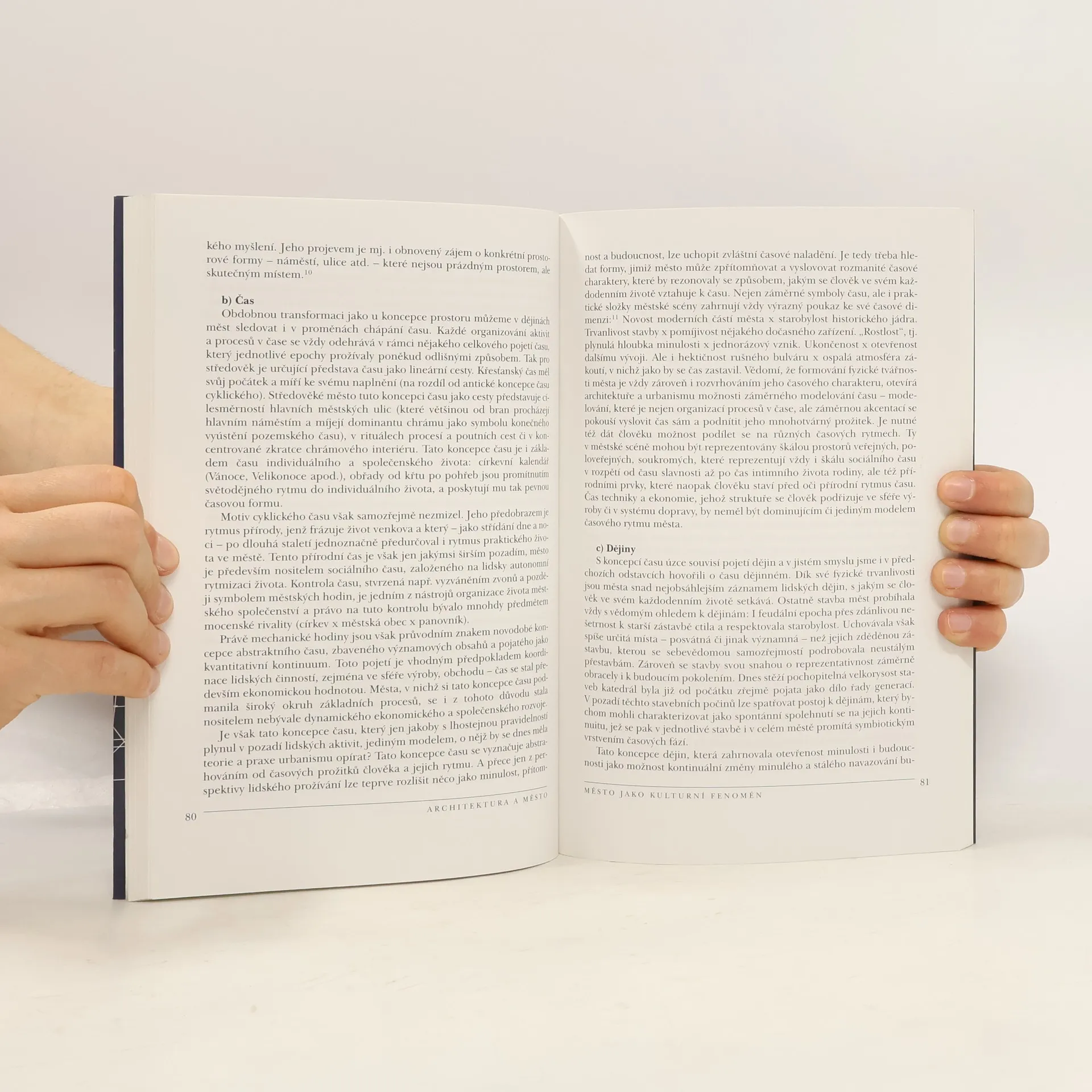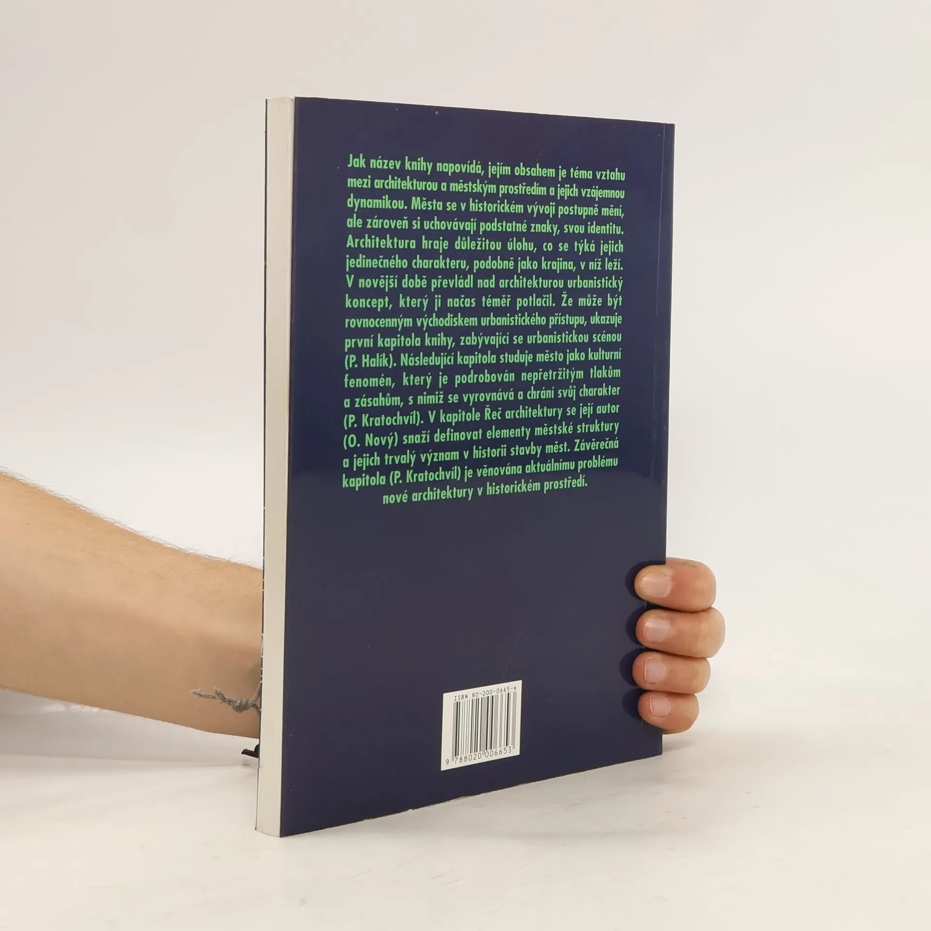 Obsahem knihy je téma vztahu mezi architekturou a městským prostředím a jejich vzájemnou dynamikou. Města se v historickém vývoji postupně mění, ale zároveň si uchovávají podstatné znaky, svou identitu. Architektura hraje důležitou úlohu, co se týká jejich jedinečného charakteru, podobně jako krajina, v níž leží. V novější době převládl nad architekturou urbanistický koncept, který ji načas téměř potlačil. Že může být rovnocenným východiskem urbanistického přístupu, ukazuje první kapitola knihy, zabývající se urbanistickou scénou (P. Halík). Následující kapitola studuje město jako kulturní fenomén, který je podrobován nepřetržitým tlakům a zásahům, s nimiž se vyrovnává a chrání svůj charakter (P. Kratochvíl). V kapitole Řeč architektury se její autor (O. Nový) snaží definovat elementy městské struktury a jejich trvalý význam v historii stavby měst. Závěrečná kapitola (P. Kratochvíl) je věnována aktuálnímu problému nové architektury v historickém prostředí.