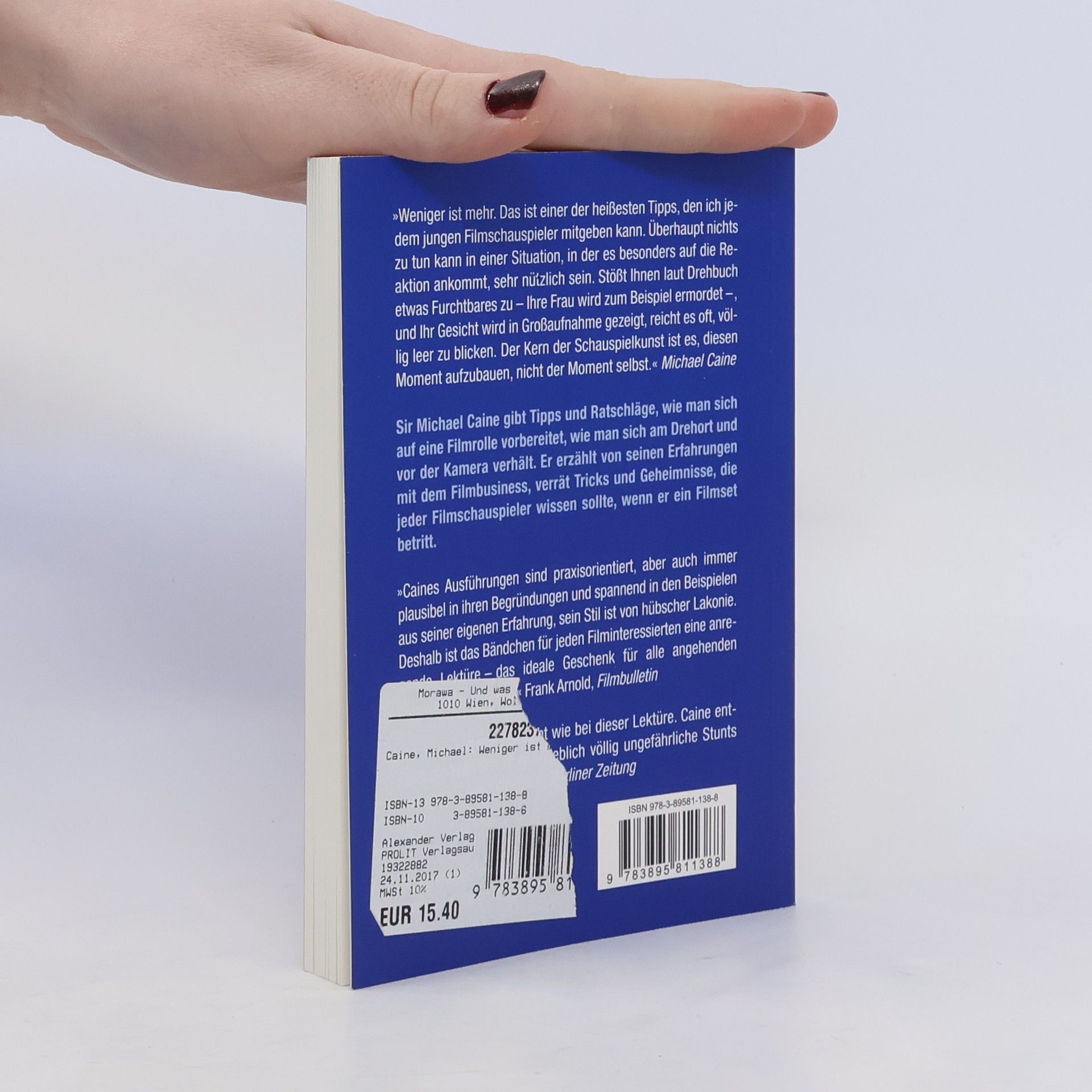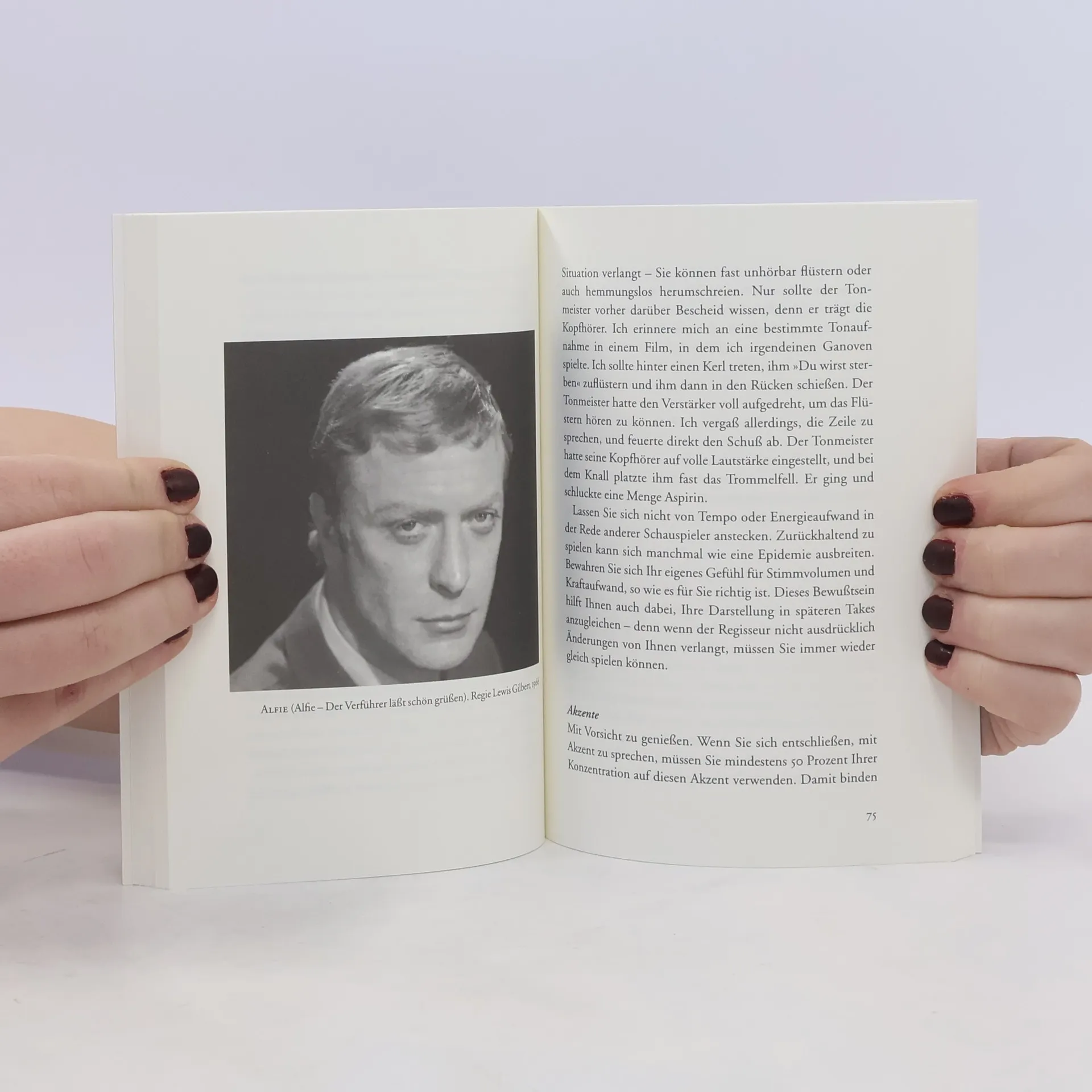 Sir Michael Caine gibt Tipps und Ratschläge, wie man sich auf eine Filmrolle vorbereitet, wie man sich am Drehort und vor der Kamera verhält und welches die großen Unterschiede in der Theater- und Filmarbeit sind. Er erzählt von seinen Erfahrungen mit dem Filmbusiness und verrät Tricks und Geheimnisse, die jeder Filmschauspieler beherzigen sollte, wenn er ein Filmset betritt.