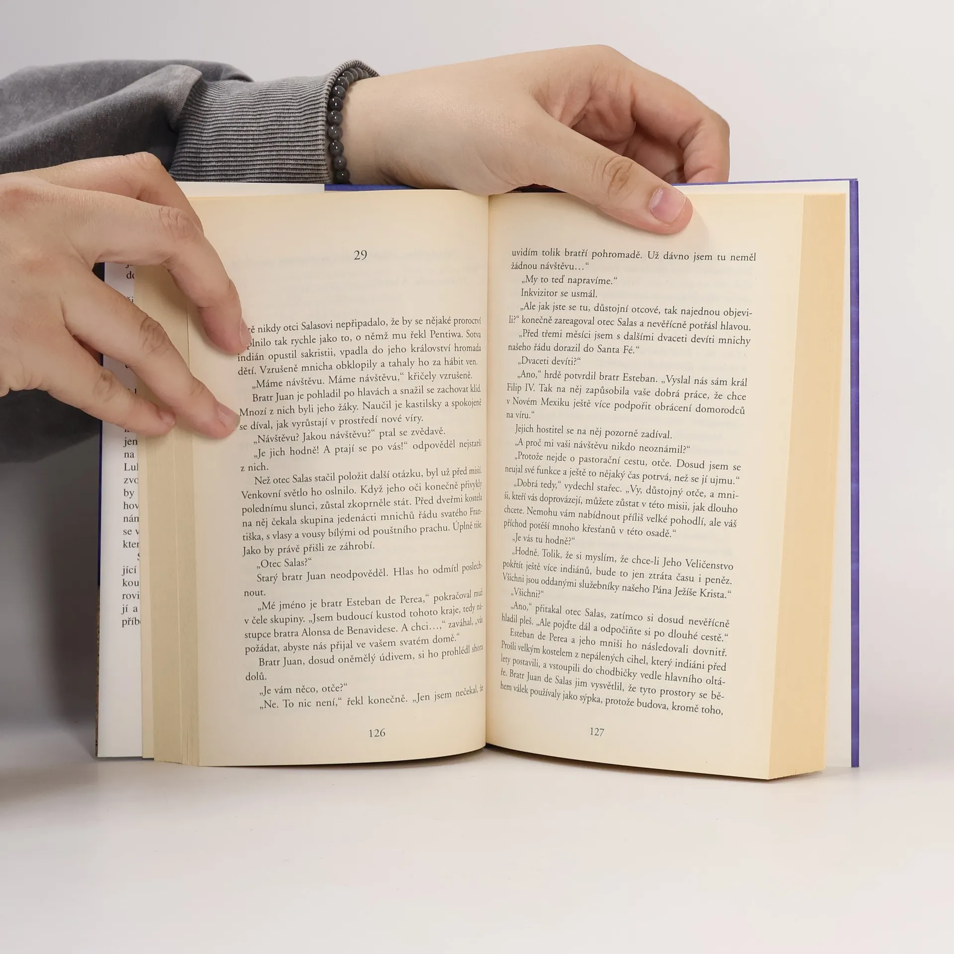 Podle starých indiánských legend se vyvolenému lidu zjevovala Modrá dáma, aby jej varovala před budoucími událostmi... Předpověděla jim například, že přijdou conquistadoři a seberou jim jejich zemi... Ve španělském městě Ágreda žila kdysi jeptiška María Jesús, která ovládala umění bilokace - tedy umění být zároveň na dvou místech. María Jesús svá tvrzení o tom, že navštívila Ameriku, obhájila dokonce i před svatou inkvizicí. Její zvláštní schopnost upoutala o mnoho století později jednak Vatikán a pak také ministerstvo obrany USA. Nejdůležitější členové vatikánského týmu se mezi sebou znali jen pod přezdívkami - což byla jména evangelistů. Jeden z nich, svatý Lukáš, dostal znepokojivý dopis, zvoucí jej neodkladně do Říma... Že by se Svatému oficiu nelíbil rozhovor, který nedávno poskytl novinám...? A po stopách Modré dámy se vydává i novinář Txema Jiménez, kterého její příběh fascinuje. Sierrovi se podařilo napsat strhující román. Děj se odvíjí z různých koutů světa v několika časových rovinách, jednotlivé nitky se spřádají a vytvářejí tajemnou mozaiku příběhu, z něhož čtenáře mrazí...