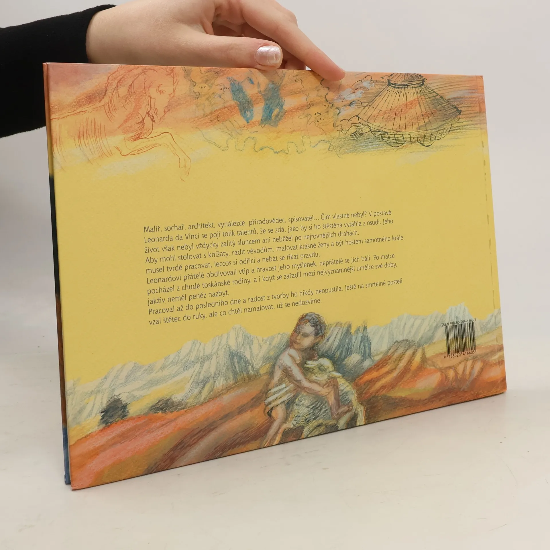 Literární příběh života Leonarda da Vinci, opírající se o známá fakta. Výpravná ilustrovaná publikace přibližuje život a dílo jedné z nejvýznamnějších osobností všech dob. Slovem i obrazem zavede čtenáře do Leonardova rodného města i do Florencie, kde strávil léta učení, a samozřejmě také do Francie, kde působil na dvoře krále Františka I. a kde posléze zemřel. V knize jsou v obrazových parafrázích připomenuta umělcova nejvýznačnější výtvarná díla (Poslední večeře, Dáma s hranostajem, Mona Lisa, autoportrét aj.), jeho objevy a vynálezy (např. létací stroje atd.) i poznatky ze studií.