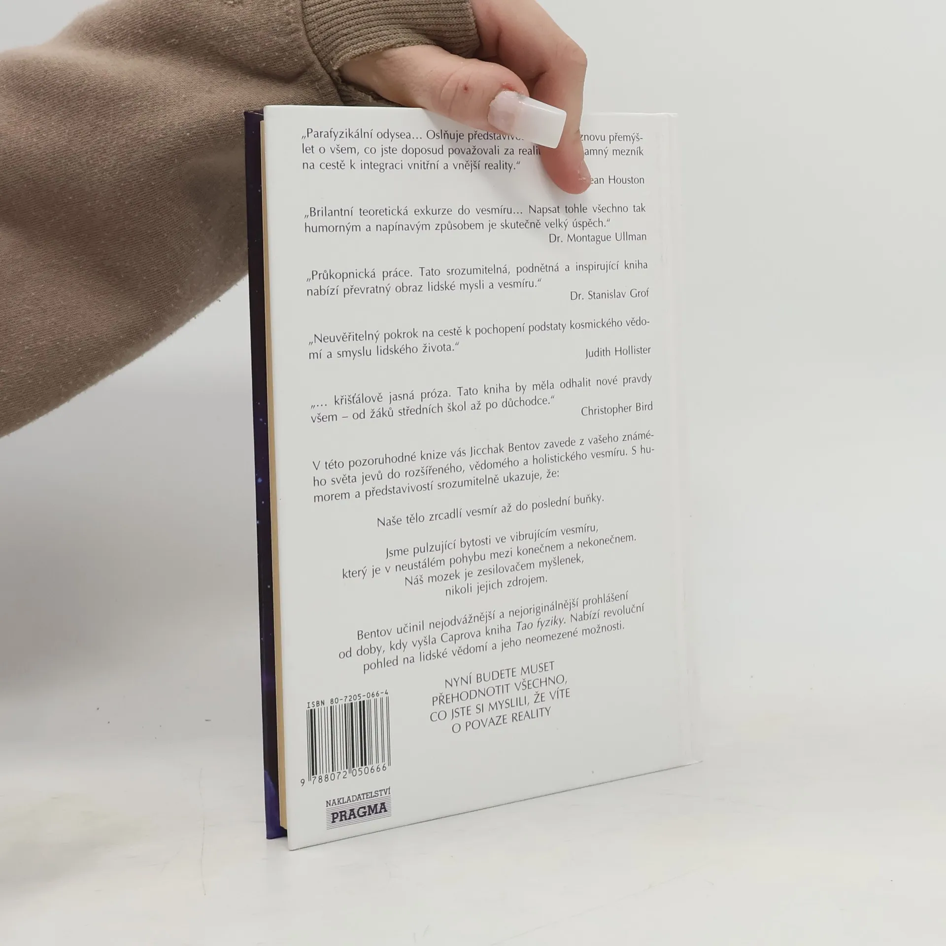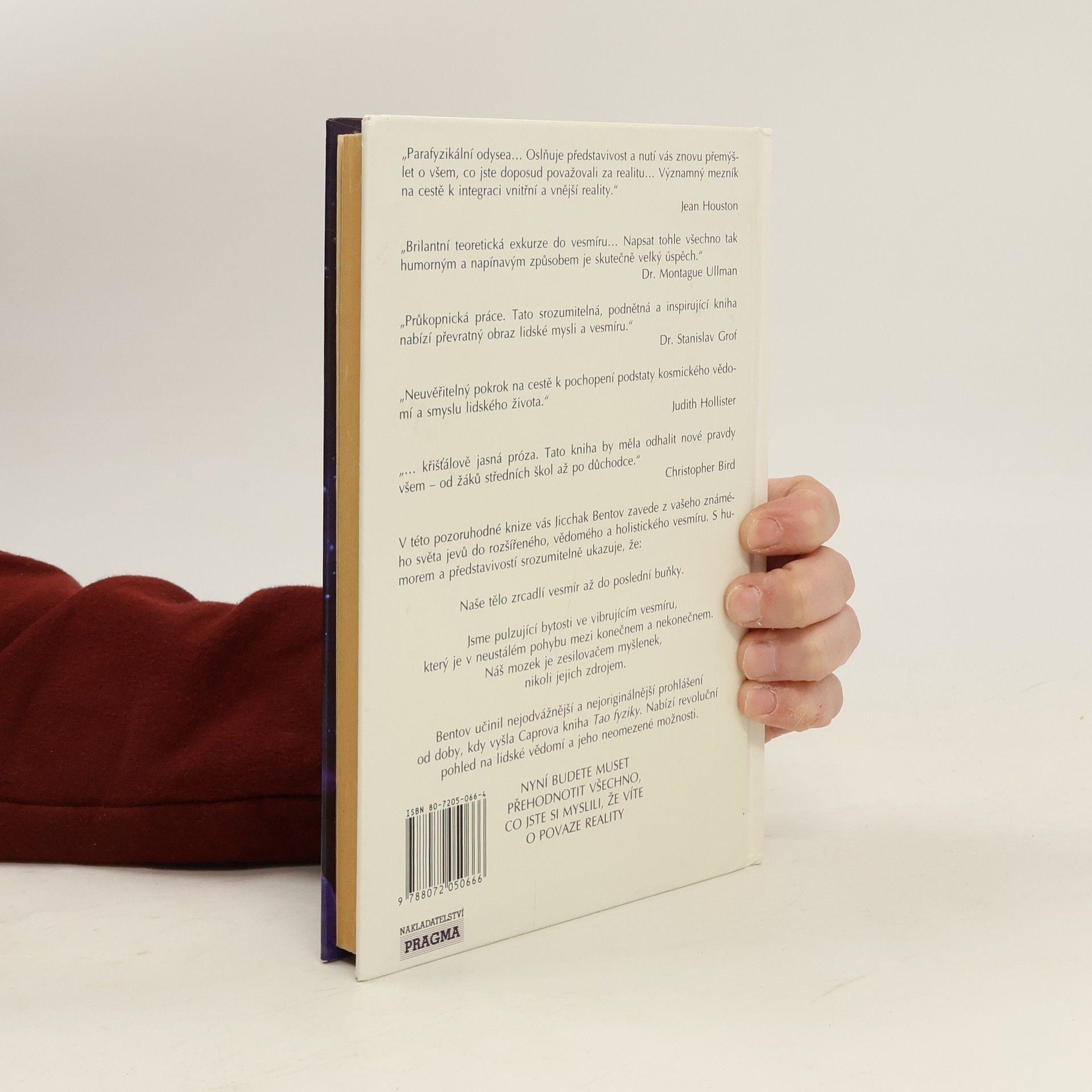 Náš názor na člověka, na vesmír a na naše vzájemné vztahy se radikálně změní. Naše představa o člověku již zaznamenává určité změny, začínáme zdůrazňovat lidskou jednotu a spojitost s vesmírem. Zdá se, že všechno je ve vzájemném vztahu se vším, a to nejen na čistě hmotné úrovni, ale na mnoha dalších úrovních; čím více pronikáme do těchto úrovní, tím více si uvědomujeme, že jsme integrální součástí jediné bytosti.Tato kniha je významným krokem vpřed, protože tuto skutečnost jasně vyjadřuje - a tím prohlubuje naše chápání budoucího vývoje. Jicchak Bentov nás v ní zavede z našeho známého světa jevů do rozšířeného, vědomého a holistického vesmíru.... celý text