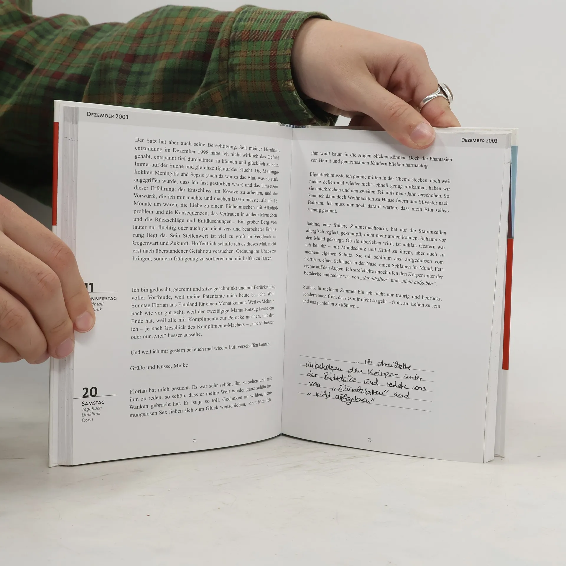 Wie merkt man, dass man Leukämie hat? Meike Schneider ist 20. Sie fühlt sich schlapp und ist sehr blass um die Nase. Stress, lautet die Eigendiagnose kurz vor einer Prüfung. Schlafen, Tee und Paracetamol helfen nicht. Als sie beim Zähneputzen umkippt, holt die Mitbewohnerin den Notarzt. Im Krankenhaus wird klar: Es ist Leukämie. Warum gerade sie? Heißt das, andere hätten es mehr verdient? Die Theologiestudentin glaubt nicht, dass Gott die Menschen durch Leid erziehen will. Sie liebt diese Welt und das Leben, sie kämpft um dieses Leben. Aber nach anderthalb Jahren Chemotherapie bricht der Krebs erneut aus. Ein Knochmarkspender wird gefunden. Alles sieht gut aus. Kurz nach Weihnachten 2004 erneut ein Rückfall. Meike betet zu Gott und kämpft. Am 3. Februar 2005 stirbt sie. Pressestimmen Meikes Eltern, Anne und Nikolaus Schneider, bei der Buch-Vorstellung: „Sie hat geschrieben, um gelesen zu werden“. Allerdings sei Meike davon ausgegangen, dass sie gesund werde und mit ihren Aufzeichnungen anderen Krebspatienten Mut machen könne. Leid und Trauer sind nicht alles, was bleibt. Meike habe in den letzten beiden Jahren sehr intensiv gelebt und sei trotz aller Schmerzen und Zweifel auch glücklich gewesen, resümierten ihre Eltern. Quelle: Rheinische Post „Mit dem Buch wollen wir zeigen, dass auch zwei Jahre Krankheit ein erfülltes Leben sind“. Quelle: epd Mit einem Vorwort von José Carreras