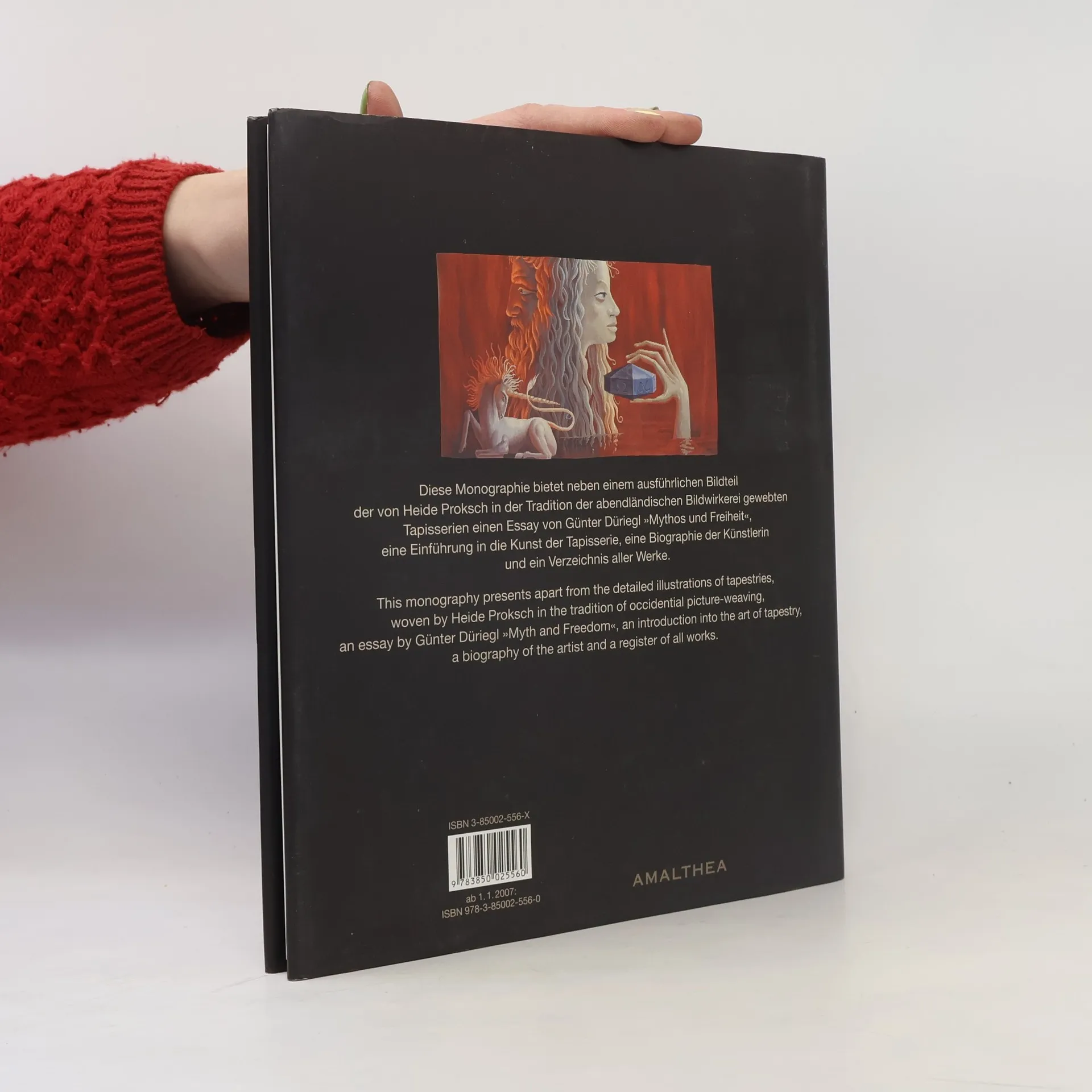 Die österreichische Künstlerin Heide Proksch und ihr Werk: Heide Proksch wurde 1942 in Mährisch Ostrau geboren. 1945 flüchtet sie mit ihrer Mutter und Schwester nach Österreich. 1965 heiratet sie den Maler Peter Proksch, 1968 beginnt sie ihr Studium für künstlerische Textiltechniken an der Akademie für Angewandte Kunst in Wien. Sie webt ihre Bildteppiche fast ausschließlich nach Entwürfen ihres Mannes in ihrem gemeinsamen Atelier. Ihre Tapisserien befinden sich in öffentlichen und privaten Sammlungen, u. a. in der Österreichischen Nationalbank, im Fischerei-Museum in Orth a. d. Donau und im Liechtensteinischen Landesmuseum in Vaduz. Das Buch enthält neben den Werken eine Einleitung von Museumsdirektor Günter Düriegl sowie eine Darstellung der Kunst des Teppichwebens.
