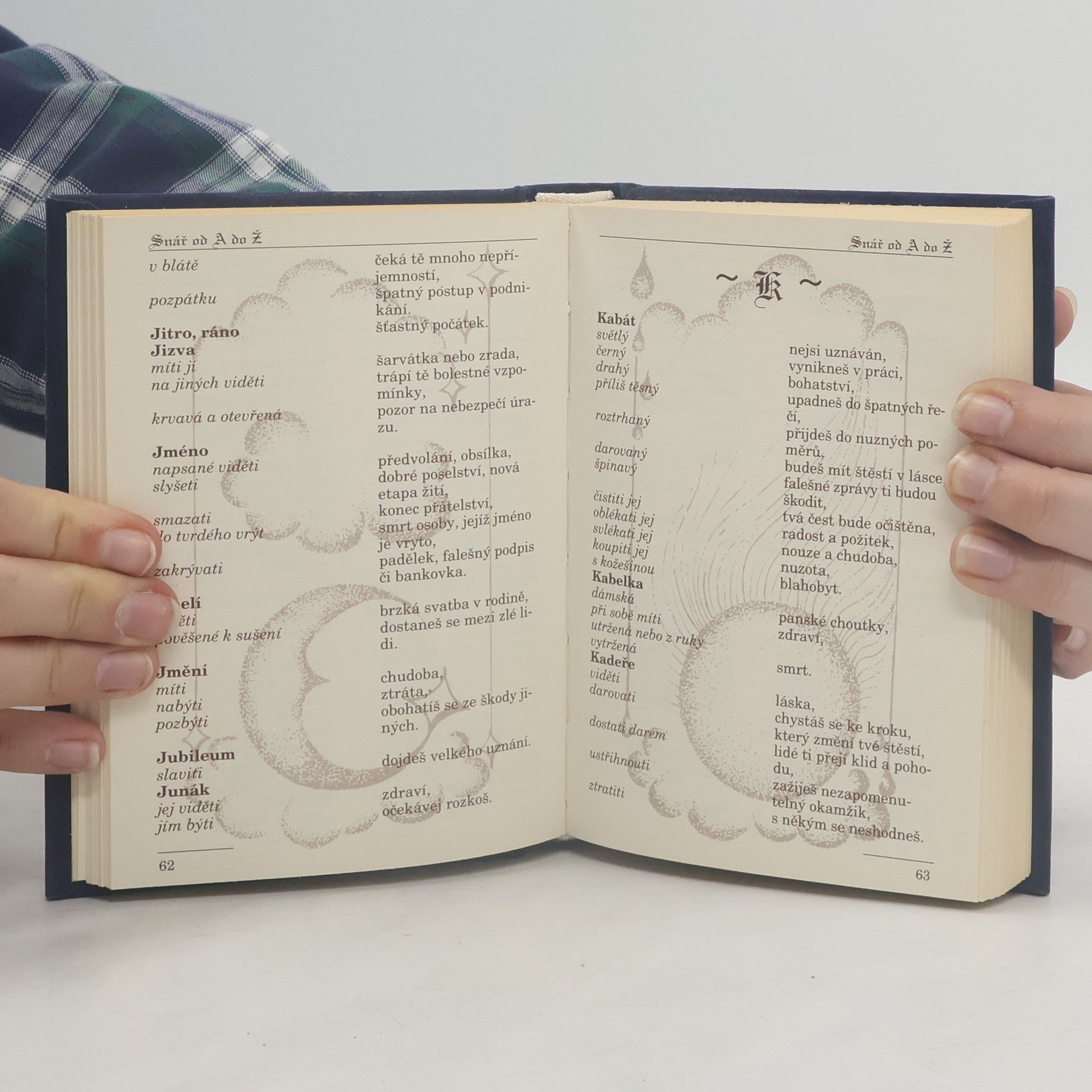 Malý praktický snář v abecedním uspořádání. Celostránkové ilustrace jsou podloženy pod textem, text i ilustrace v barvě hnědé. Vázaná, rozměr 102 x 145 dárkové provedení – mikroplyš neboli broušený samet barvy modré, se stříbroražbou a prokládaným hřbetem.