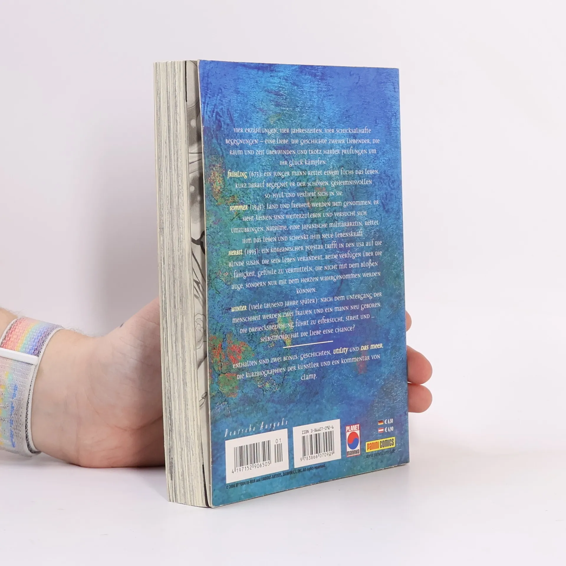 Vier Erzählungen, vier Jahreszeiten, vier schicksalhafte Begegnungen – eine Liebe. Eine Liebesgeschichte zweier Liebender, die Raum und Zeit überwinden und trotz harter Prüfungen für ihre Liebe kämpfen. Frühling (673): Ein junger Mann rettet einem Fuchs das Leben. Kurz darauf begegnet er der schönen, geheimnisvollen So-Hyul und verliebt sich in sie. Sommer (1945): Land und Freiheit werden ihm genommen. Er sieht keinen Sinn weiterzuleben und versucht sich umzubringen. Natsume, eine japanische Militärärztin, rettet ihm das Leben und schenkt ihm neue Lebenskraft … Herbst (1995): Ein koreanischer Popstar trifft in den USA auf die blinde Susan, die sein Leben und seine Liebe verändert. Beide verfügen über die Fähigkeit, Gefühle zu vermitteln, die nicht mit dem bloßen Auge, sondern nur mit dem Herzen wahrgenommen werden können. Winter (viele tausend Jahre später): Nach dem Untergang der Menschheit werden zwei Frauen und ein Mann neu geboren. Die Dreiecksbeziehung führt zu Eifersucht, Streit und … Selbstmord. Hat ihre Liebe eine Chance? Enthalten sind zwei Bonus-Geschichten, Utility und Das Meer, die Biographien der Künstler und ein Kommentar von CLAMP.