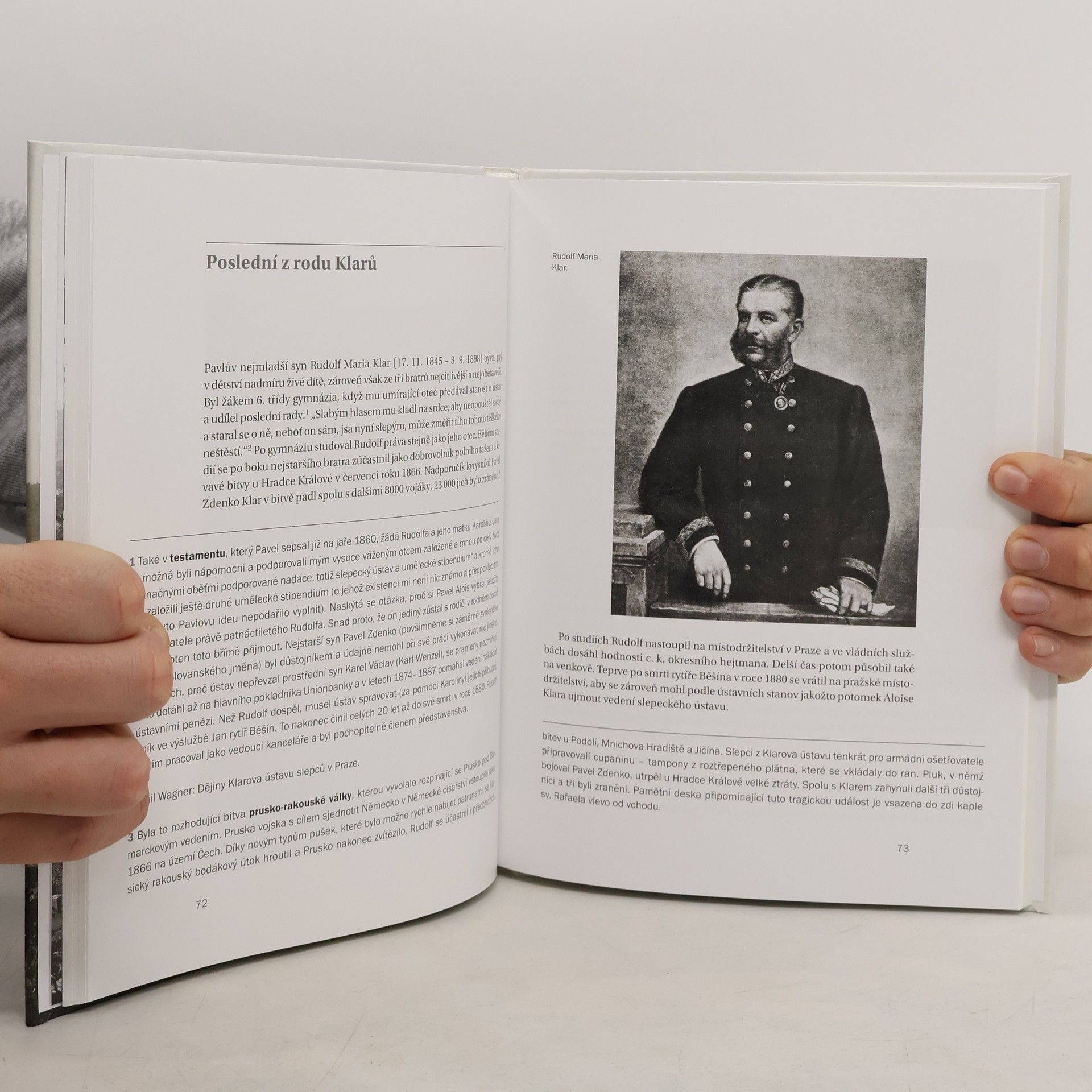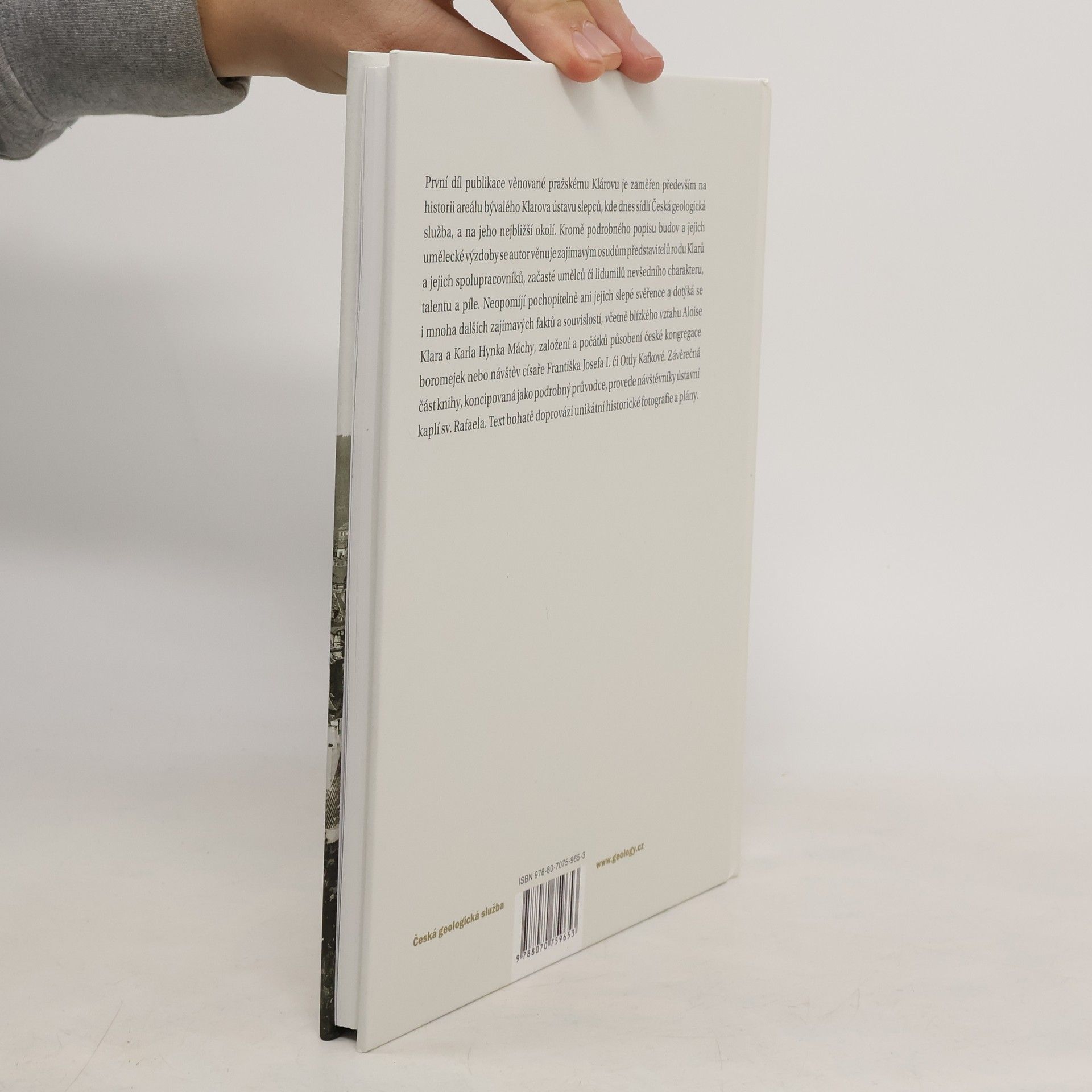 První díl publikace věnované pražskému Klárovu je zaměřen především na historii areálu bývalého Klarova ústavu slepců, kde dnes sídlí Česká geologická služba, a na jeho nejbližší okolí. Kromě podrobného popisu budov a jejich umělecké výzdoby se autorvěnuje zajímavým osudům představitelů rodu Klarů a jejich spolupracovníků, začasté umělců či lidumilů nevšedního charakteru, talentu a píle. Neopomíjí pochopitelně ani jejich slepé svěřence a dotýká se i mnoha dalších zajímavých faktů a souvislostí, včetně blízkého vztahu Aloise Klara a Karla Hynka Máchy, založení a počátků působení české kongregace boromejek nebo návštěv císaře Františka Josefa I. či Ottly Kafkové. Závěrečná částknihy, koncipovaná jako podrobnýprůvodce, provede návštěvníky ústavní kaplí sv. Rafaela. Text bohatě doprovází unikátní historické fotografie a plány.