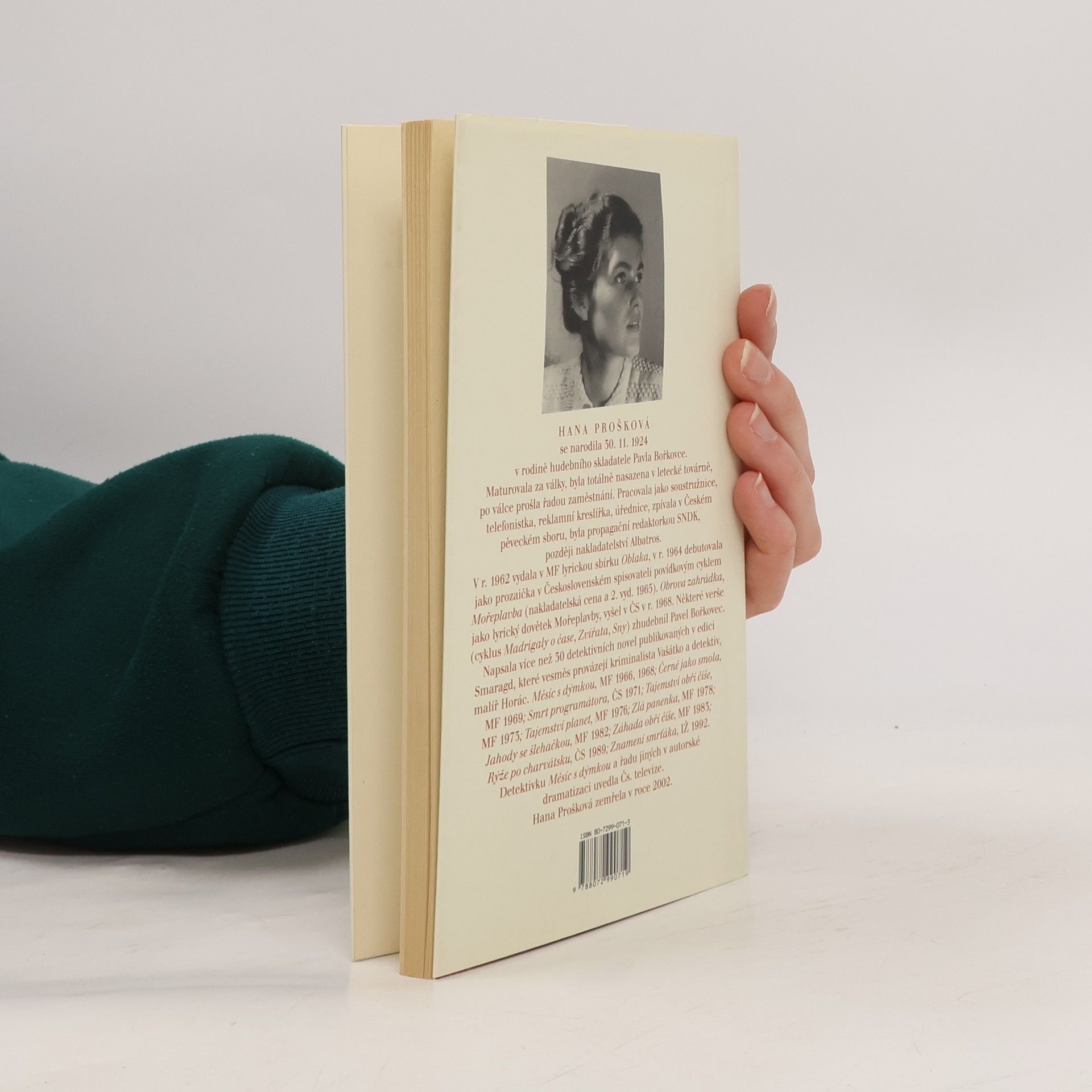 Hana Prošková (1924 - 2002) je známa čtenářům především jako úspěšná autorka detektivních příběhů. Přesto jejím ceněným knižním debutem (1962) byla lyrická sbírka poezie Oblaka. Verše z literární pozůstalosti, které jsou zde poprvé zveřejněny, pocházejí vesměs z 50. a 60. let. Básně sebrané v této sbírce jsou stejně poetické jako její prvotina, ale jsou „jakýmsi zralým, tesknějším a vědoucnějším dopovězením otázek, které si kladla mladá básnířka“.
