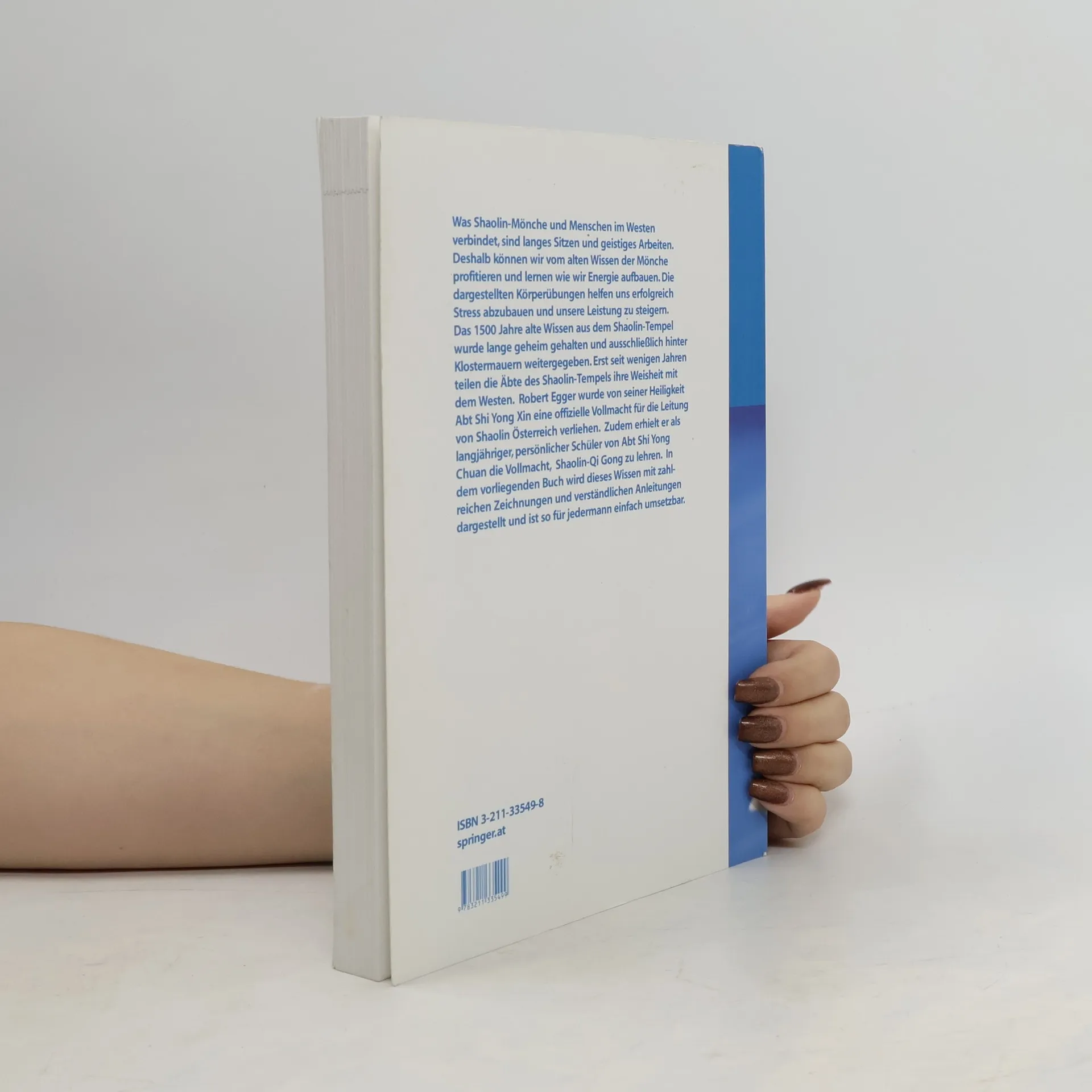 Was Shaolin-Mönche und Menschen im Westen verbindet, sind langes Sitzen und geistiges Arbeiten. Deshalb können wir vom alten Wissen der Mönche profitieren und lernen wie wir Energie aufbauen. Körperübungen, die durch Zeichnungen und einfach verständliche Anleitungen dargestellt sind, helfen uns erfolgreich Stress abzubauen und unsere Leistung zu steigern. Das 1500 Jahre alte Wissen aus dem Shaolin-Tempel wurde lange geheim gehalten und ausschließlich hinter Klostermauern weitergegeben. Erst seit wenigen Jahren teilen die Äbte des Shaolin Tempels ihre Weisheit mit dem Westen. Robert Egger wurde von seiner Heiligkeit Abt Shi Yong Xin eine offizielle Vollmacht für die Leitung von Shaolin Österreich verliehen. Weiters erhielt er als langjähriger, persönlicher Schüler von Abt Shi Yong Chuan die Vollmacht, Shaolin Qi Gong zu lehren.
