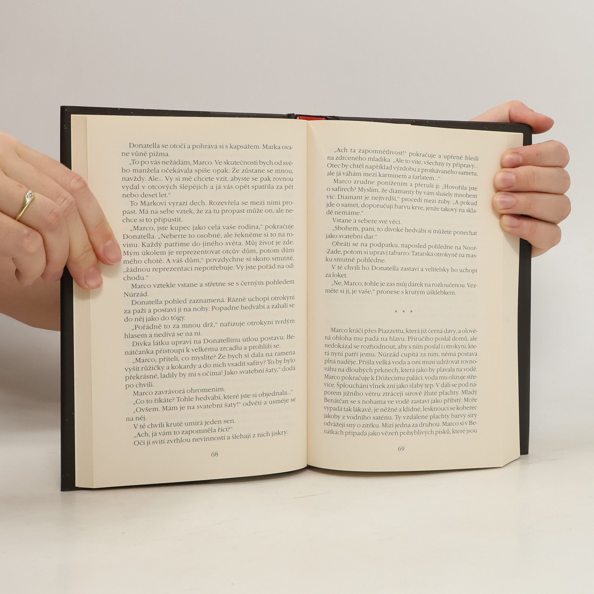 První díl dobrodružné trilogie o benátském kupci, jehož snem bylo spatřit konec světa. V tomto díle se mladý Marco, i přes otcův nesouhlas, vydává s jeho karavanou do Jeruzaléma a zažívá první radosti a strasti cestování. Potkává také své první lásky, které musí v zápětí zase opustit. Benátská karavana putuje územím, které ovládá krutá Zlatá horda, poté přes pouště a hory Dálného východu, až dospěje ke dvoru čínského vládce Kublajchána. Francouzská spisovatelka vychází ze zápisků samotného Marca a poutavým způsobem líčí jeho osudy.
