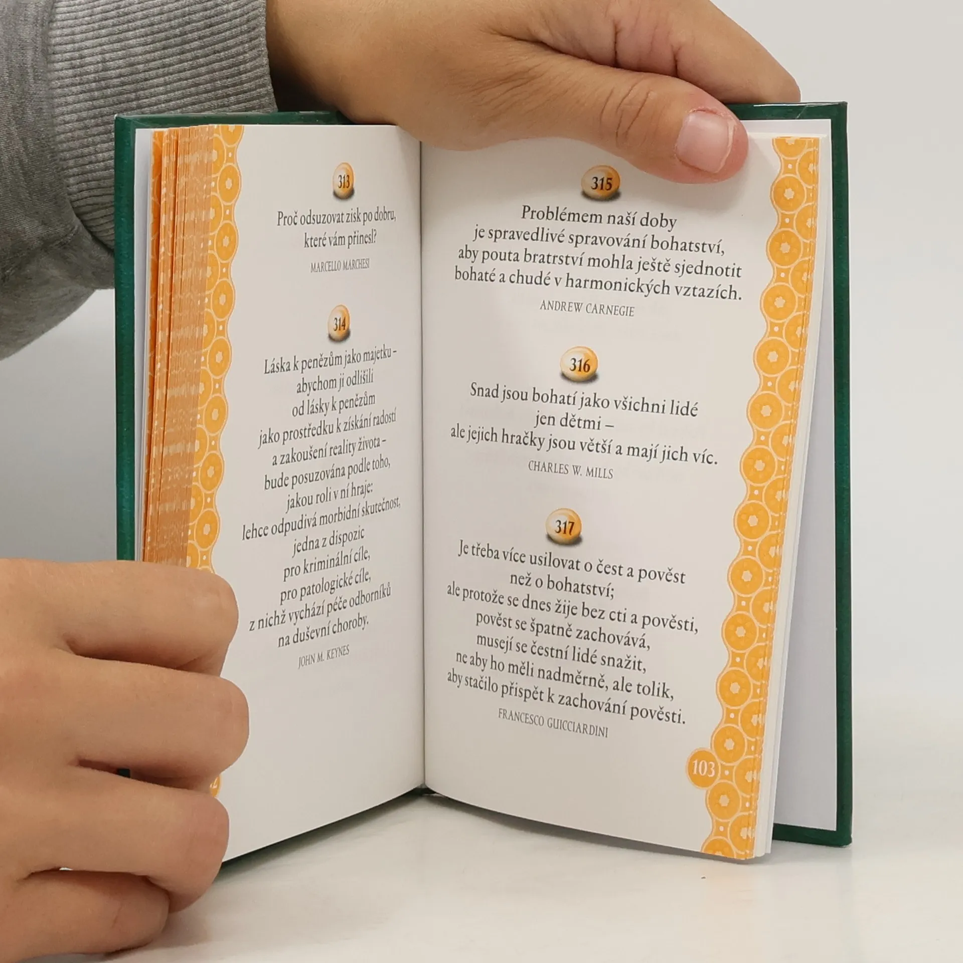 Otázka, zda peníze přinášejí štěstí, je pravděpodobně tak stará jako samy peníze. Tato antologie obsahuje moudré úvahy, přísné výtky, vtipné myšlenky i opovržlivé výroky, jimiž slavní i neznámí lidé všech dob - řečtí i římští filozofové, geniové finančního trhu, průmyslu, spisovatelé, světci, prostopášníci a mnozí další - prozrazují, co si myslí o penězích a bohatství. Pořadatel si přeje, aby ta či ona myšlenka vzbudila u čtenáře úsměv, a nějaká další ho dokonce nechala uvažovat o pomíjivé, jakkoli okouzlující, hodnotě peněz a bohatství.
