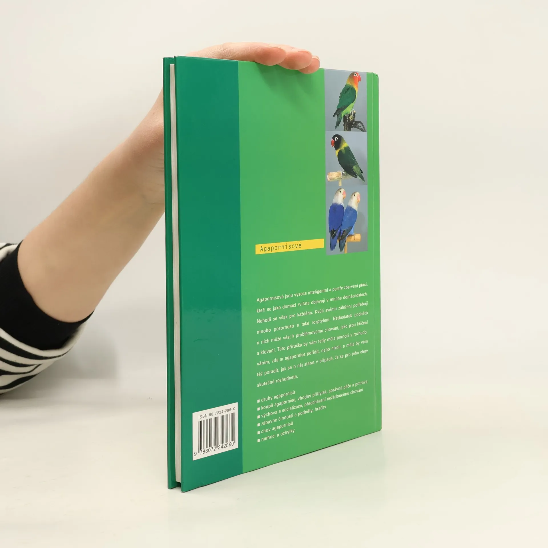 Agapornisové jsou vysoce inteligentní a pestře zbarvení ptáci, kteří se jako domácí zvířata objevují v mnoha domácnostech. Nehodí se však pro každého. Kvůli svému založení potřebují mnoho pozornosti a také rozptýlení. Nedostatek podnětů u nich může vést k problémovému chování, jako jsou křičení a klování. Tato příručka by vám tedy měla pomoci s rozhodováním, zda si agapornise pořídit, nebo nikoli, a měla by vám též poradit, jak se o něj starat v případě, že se pro jeho chov skutečně rozhodnete. - druhy agapornisů - koupě agapornise, vhodný příbytek, správná péče a potrava - výchova a socializace, předcházení nežádoucímu chování - zábavné činnosti a podněty, hračky - chov agapornisů - nemoci a odchylky