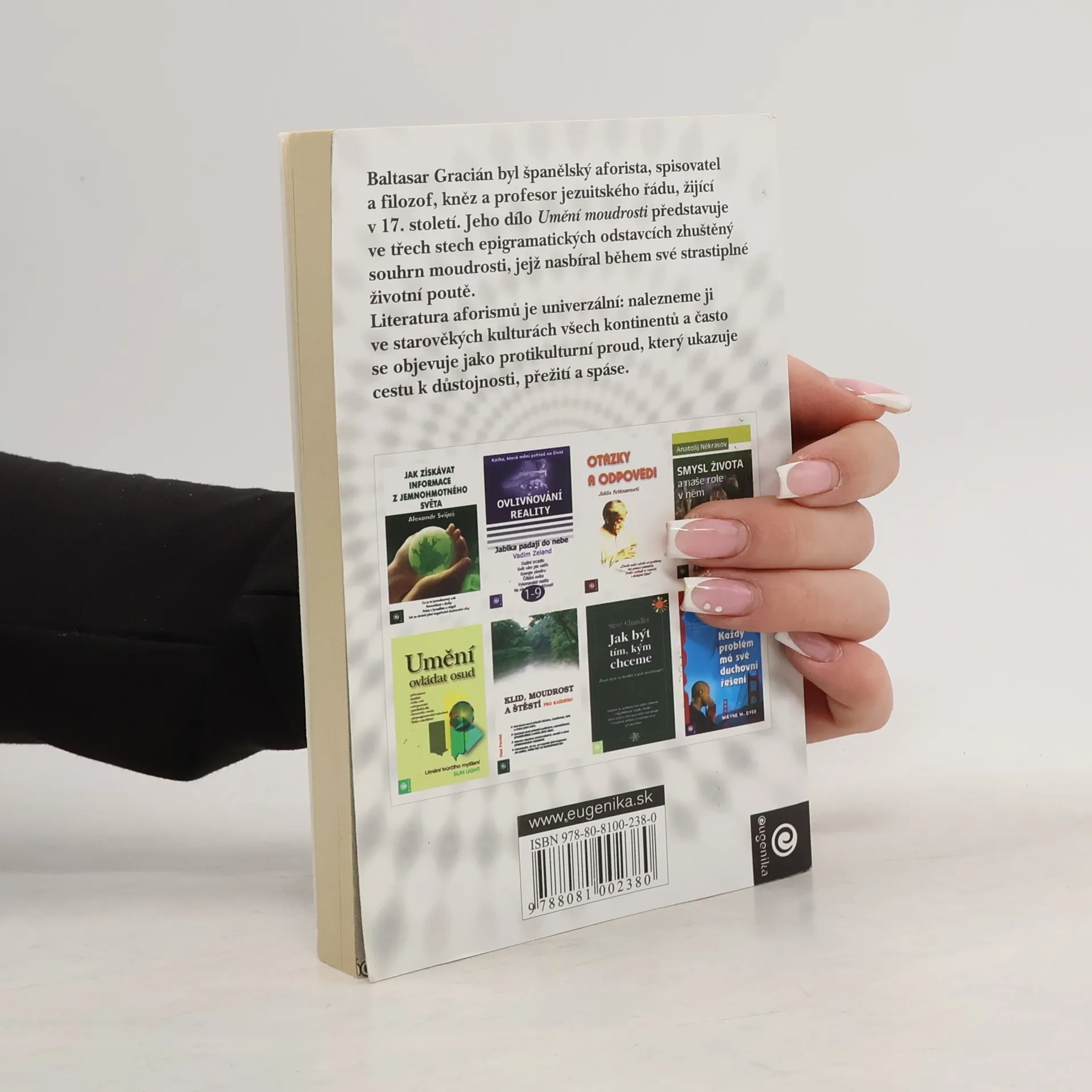 Baltasar Gracián byl španělský aforista, spisovatel a filozof, kněz a profesor jezuitského řádu, žijící v 17. století. Jeho dílo Umění moudrosti představuje ve třech stech epigramatických odstavcích zhuštěný souhrn moudrosti, jejž nasbíral během své strastiplné životní poutě. Literatura aforismů je univerzální: nalezneme ji ve starověkých kulturách všech kontinentů a často se objevuje jako protikulturní proud, který ukazuje cestu k důstojnosti, přežití a spáse.