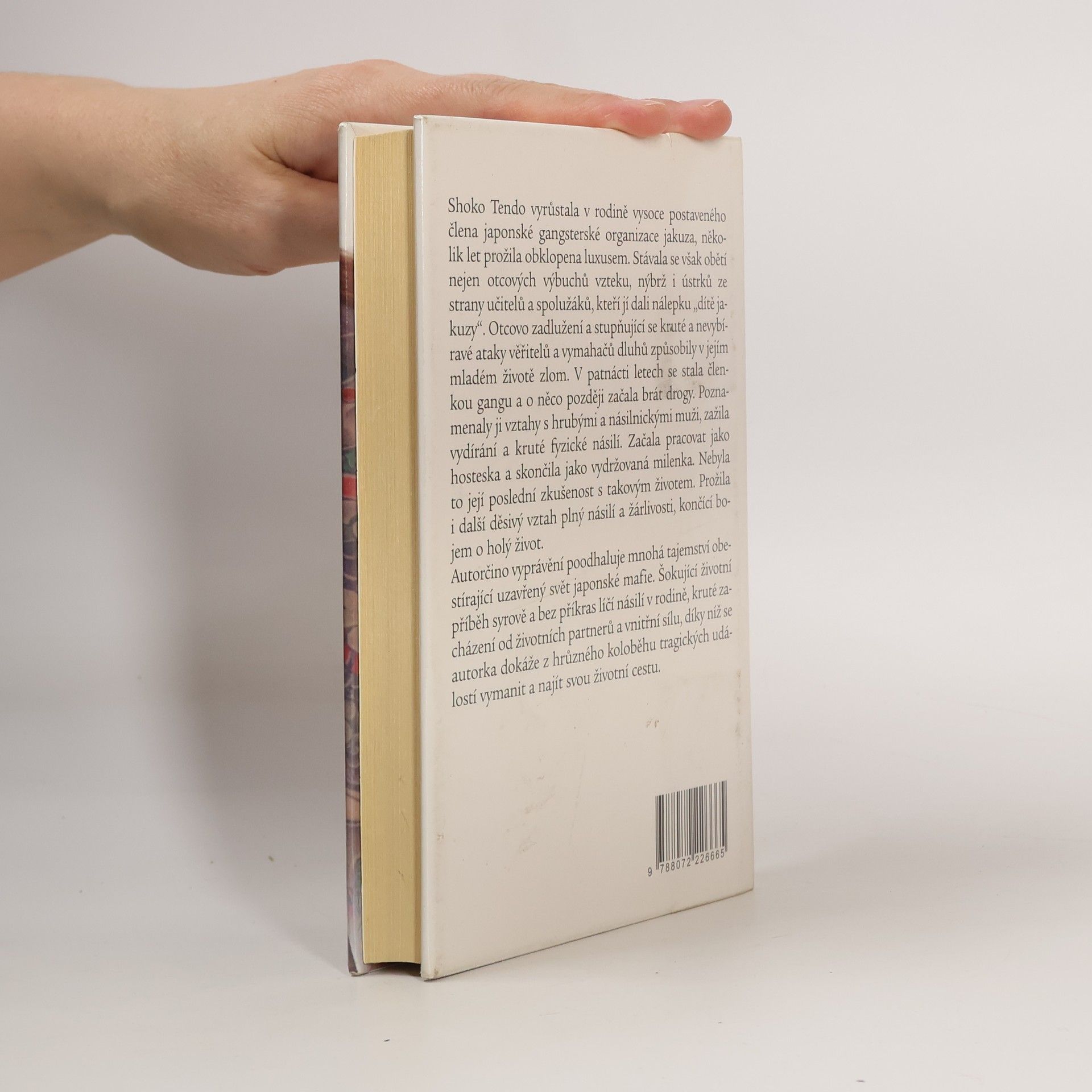 Shoko Tendo vyrůstala v rodině vysoce postaveného člena japonské gangsterské organizace jakuza, několik let prožila obklopena luxusem. Stávala se však obětí nejen otcových výbuchů vzteku, nýbrž i ústrků ze strany učitelů a spolužáků, kteří jí dali nálepku „dítě jakuzy“. Otcovo zadlužení a stupňující se kruté a nevybíravé ataky věřitelů a vymahačů dluhů způsobily v jejím mladém životě zlom. V patnácti letech se stala členkou gangu a o něco později začala brát drogy. Poznamenaly ji vztahy s hrubými a násilnickými muži, zažila vydírání a kruté fyzické násilí. Začala pracovat jako hosteska a skončila jako vydržovaná milenka. Nebyla to její poslední zkušenost s takovým životem. Prožila i další děsivý vztah plný násilí a žárlivosti, končící bojem o holý život. Autorčino vyprávění poodhaluje mnohá tajemství obestírající uzavřený svět japonské mafie. Šokující životní příběh syrově a bez příkras líčí násilí v rodině, kruté zacházení ze strany násilnických životních partnerů a vnitřní sílu, díky níž se autorka dokáže z hrůzného koloběhu tragických událostí vymanit a najít svou životní cestu.