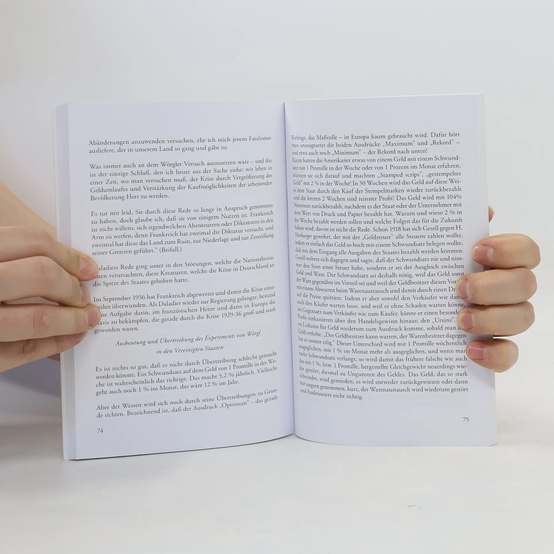 Das Experiment von Wörgl war der einzige praktische Versuch, die Freiwirtschaftslehre von Silvio Gesell umzusetzen. Er wurde nach eineinhalb Jahren von staatlicher Seite verboten. In der Zwischenzeit jedoch (1932/33) erlebte die Gemeinde Wörgl in Österreich mit ihrem Freigeldversuch einen ungeahnten wirtschaftlichen Aufschwung inmitten der Weltwirtschaftskrise. „Freigeld ist ein Bargeld, das nie ohne Risiko oder Schaden gehamstert, thesauriert werden kann und stets in einer Menge im Umlauf erhalten wird, die dem Warenangebot entspricht, so daß seine Kaufkraft fest bleiben muss. Im Gegensatz zum heutigen Geld, dem Dauergeld, kann es also nie von Privaten ohne Risiko oder Schaden dem Umlauf entzogen und später nach Belieben wieder in den Umlauf gegeben werden.” (Fritz Schwarz)
