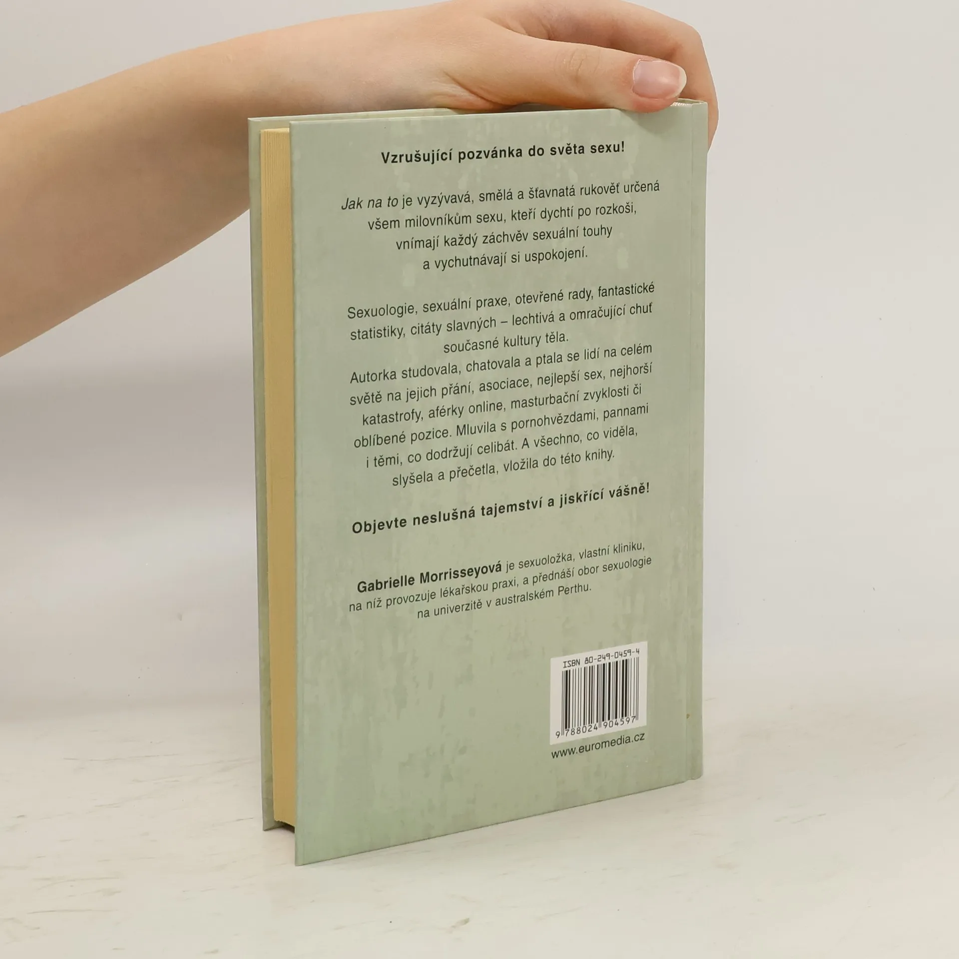 G. Morrisseyová je lékařka, sexuoložka, s několikaletou terapeutickou praxí, dnes vede soukromou kliniku a zároveň sexuologický program na univerzitě. Autorka se věnuje všem tématům, která souvisejí se sexem - od pohlavního styku, přes autoerotiku, sexuální pomůcky, celibát, sexuální fantazie až k bezpečnému sexu nebo potížím s erekcí. Zabývá se i maličkostmi, na které se mnozí lidé bojí zeptat, nebo otázkami, na něž odpověď nikde nenaleznou. Kniha je čtivá, zábavná, ale velmi přínosná a informativní. V každém směru pobaví i poučí.... celý text