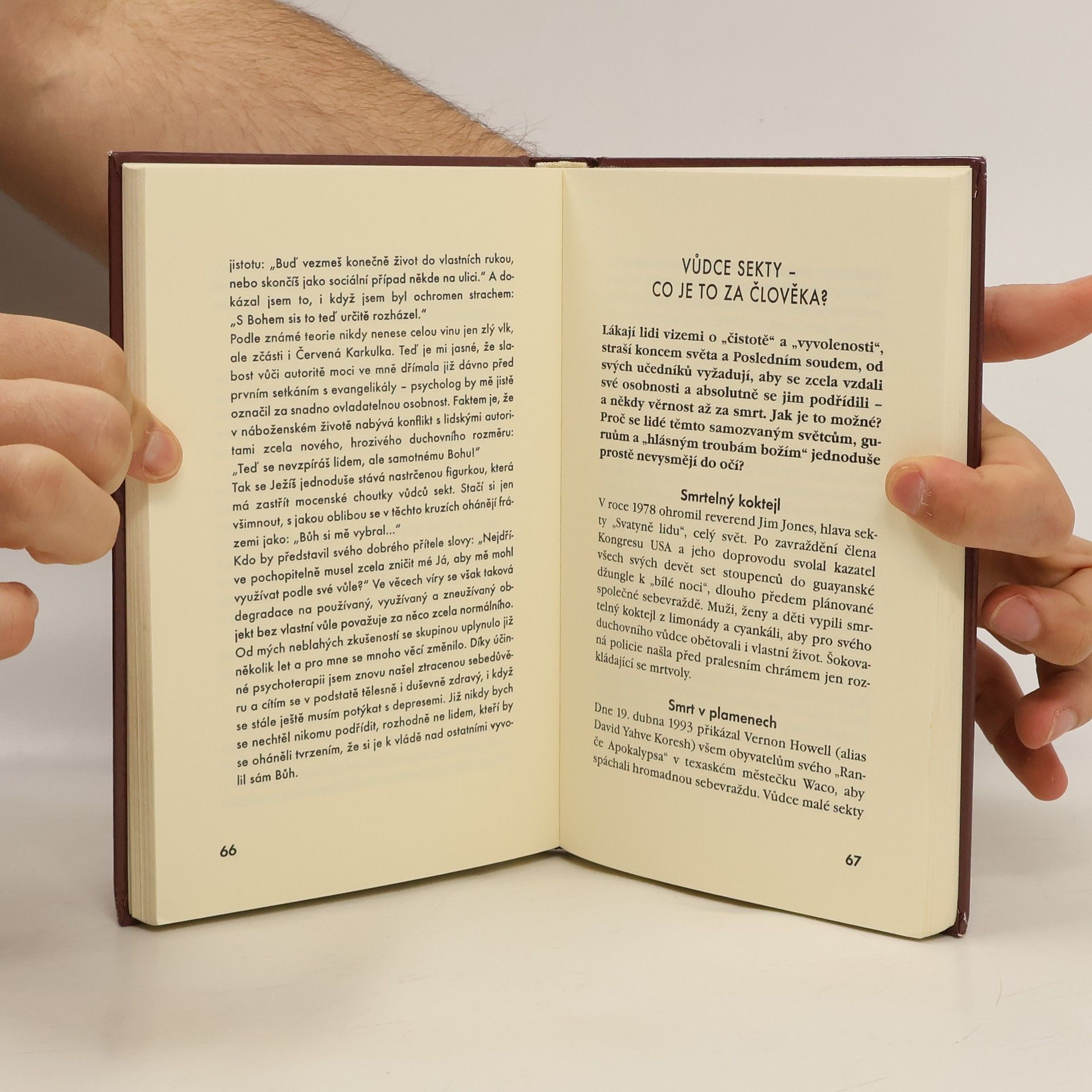 Varovné memento německé autorky, které přibližuje mechanismy, jimiž se řídí v novodobé společnosti stále se množící náboženské sekty, a praktiky jejich neomylných vůdců, kteří se snaží potlačit svobodnou vůli jednotlivce, je shrnujícím pohledem na jeden z palčivých problémů moderní společnosti. Kniha je doplněna o očitá svědectví členů těchto společenství a o český doslov, který v krátkosti mapuje situaci u nás a podává informace o institucích, kam je možné se obrátit o pomoc. Vydání první