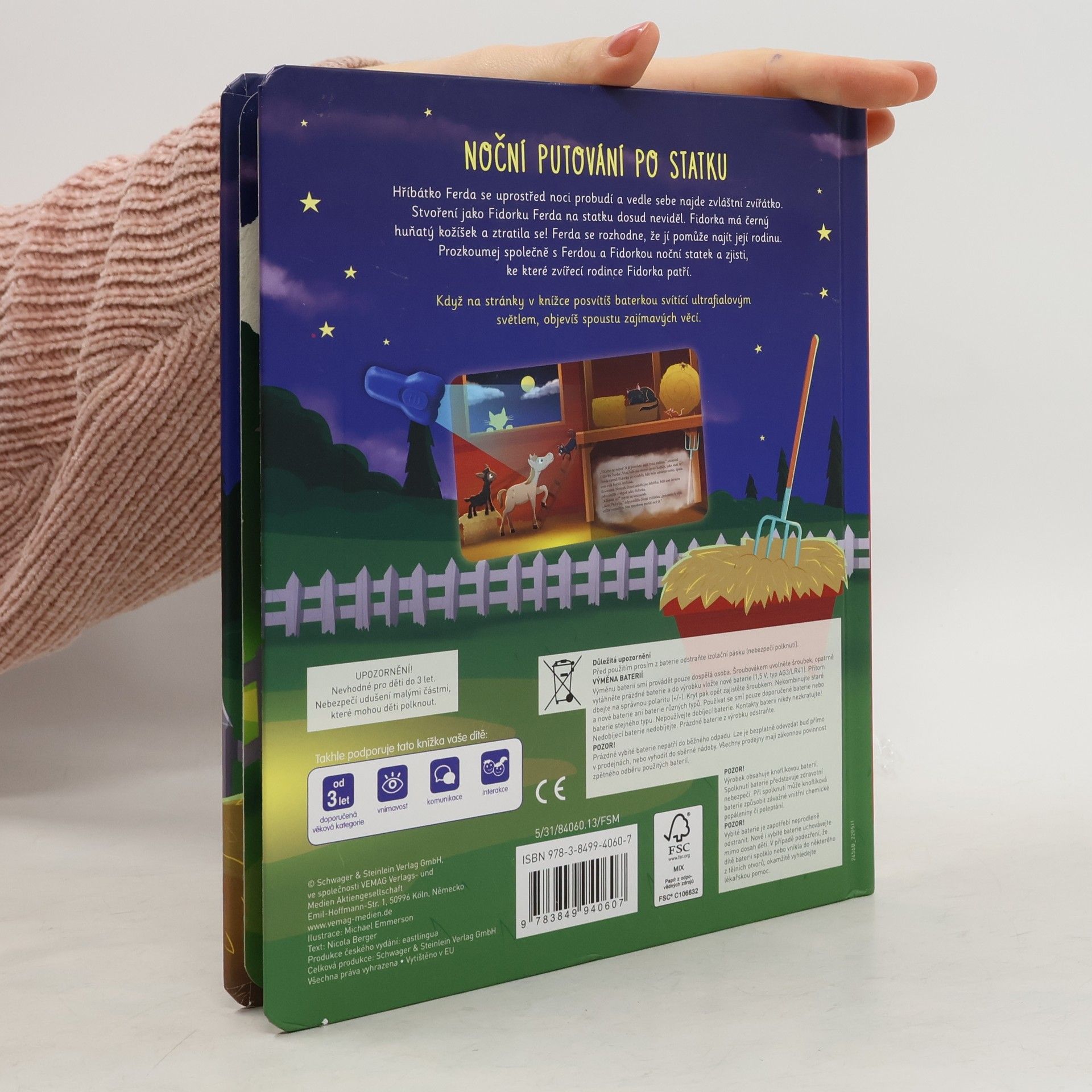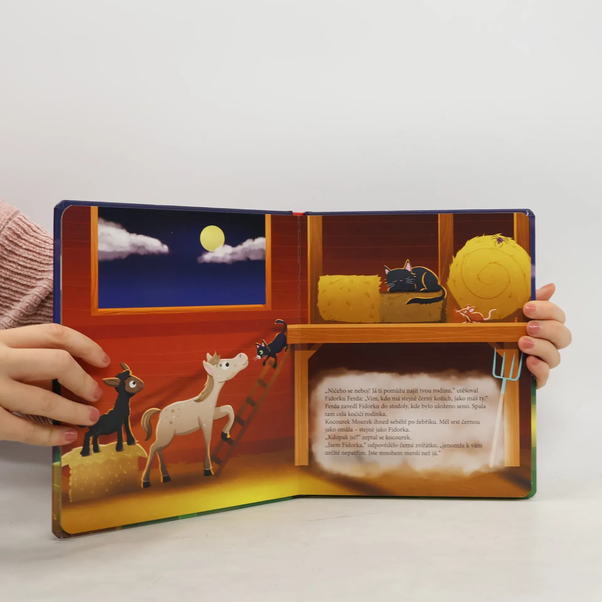 Hříbátko Ferda se uprostřed noci probudí a vedle sebe najde zvláštní zvířátko. Stvoření jako Fidorku Ferda na statku dosud neviděl. Fidorka má černý huňatý kožíšek a ztratila se! Ferda se rozhodne, že jí pomůže najít její rodinu. Prozkoumej společně s Ferdou a Fidorkou noční statek a zjisti, ke které zvířecí rodince Fidorka patří. Když na stránky v knížce posvítíš baterkou svítící ultrafialovým světlem, objevíš spoustu zajímavých věcí.