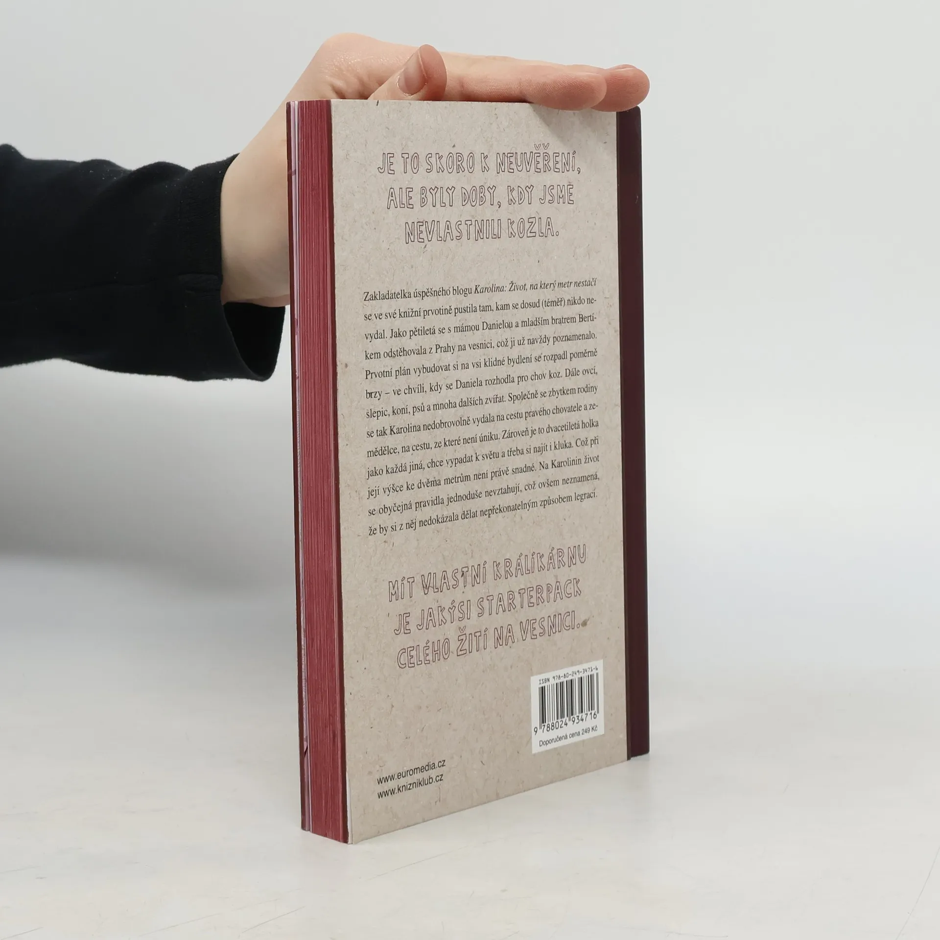 Zakladatelka úspěšného blogu Karolina: Život, na který metr nestačí přichází se stejnojmennou knihou, ve které s nadsázkou úspěšně demonstruje rčení: „Může-li se něco pokazit, pokazí se to.“ Knížka vás provede humornými příběhy z malé vesnice, kam se Karolina nedobrovolně i s rodinou jako malá přestěhovala z Prahy. Prvotní plán vybudovat si na vesnici klidné bydlení, se rozpadl poměrně brzy – ve chvíli, kdy se její máma Daniela rozhodla pro chov koz, ovcí, koní a mnoha dalších zvířat. Společně se zbytkem rodiny se tak Karolina vydala na cestu pravého chovatele a zemědělce v jednom, na cestu, ze které není úniku.